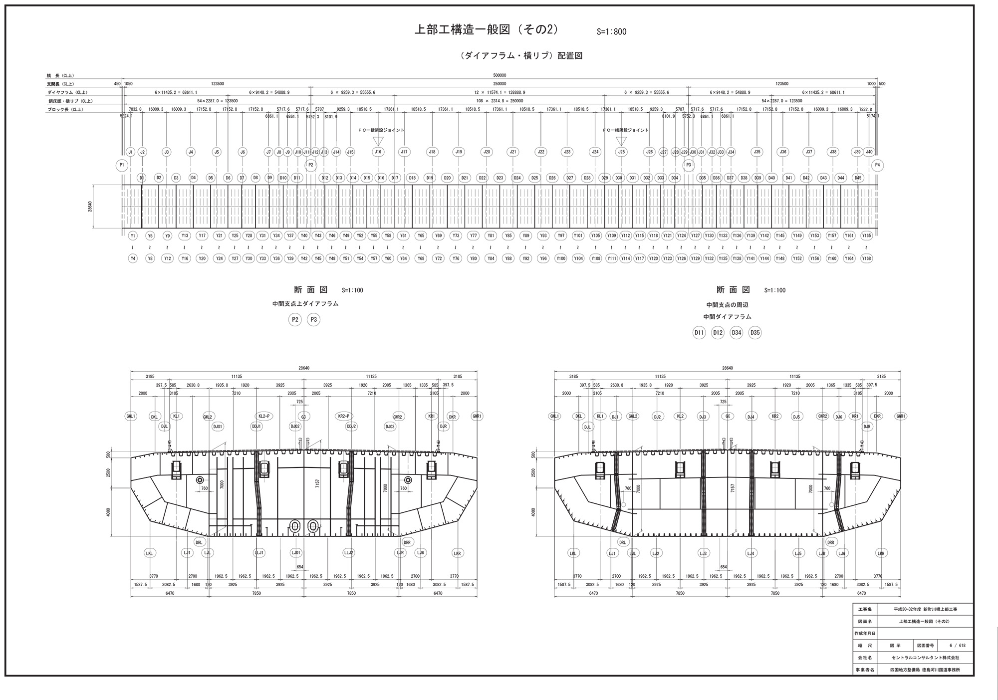 こうした諸条件から同橋は、橋長500m、総幅員の28.64mの鋼3径間連続箱桁橋(1box)。支間長は側径間が123.5m、中央径間が250mとした。