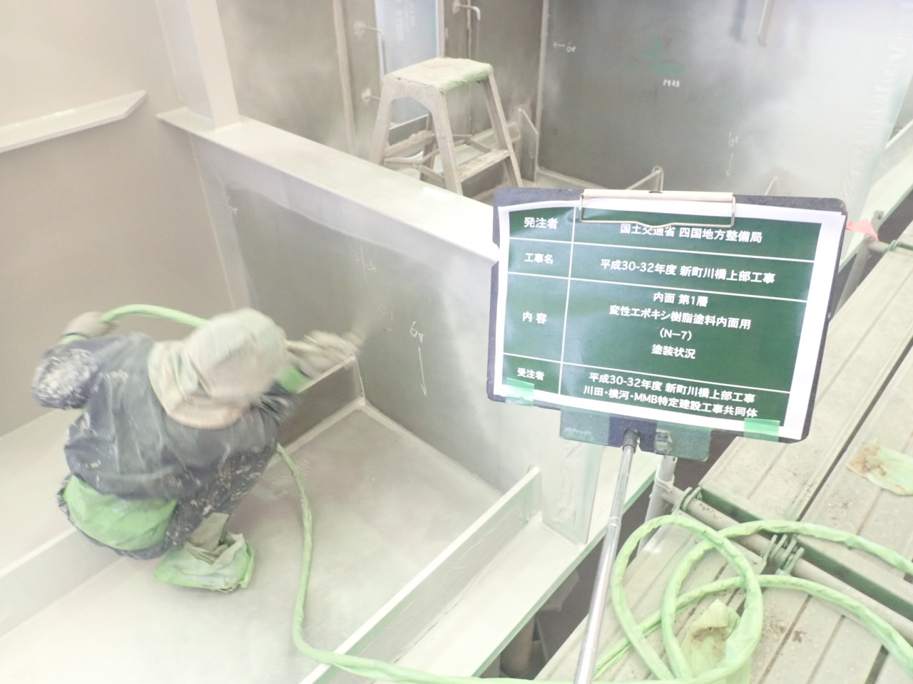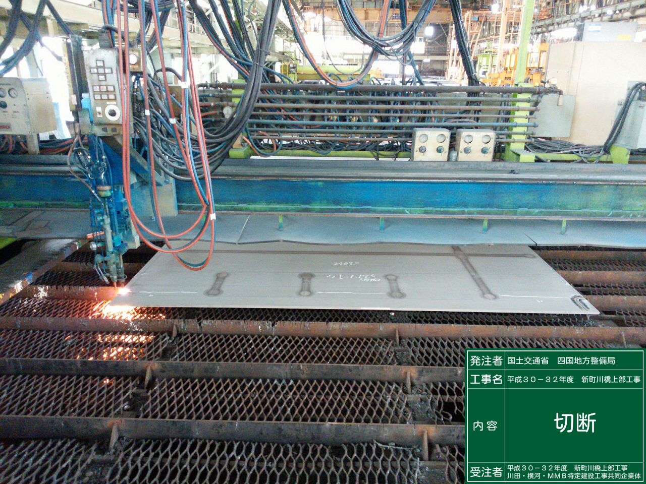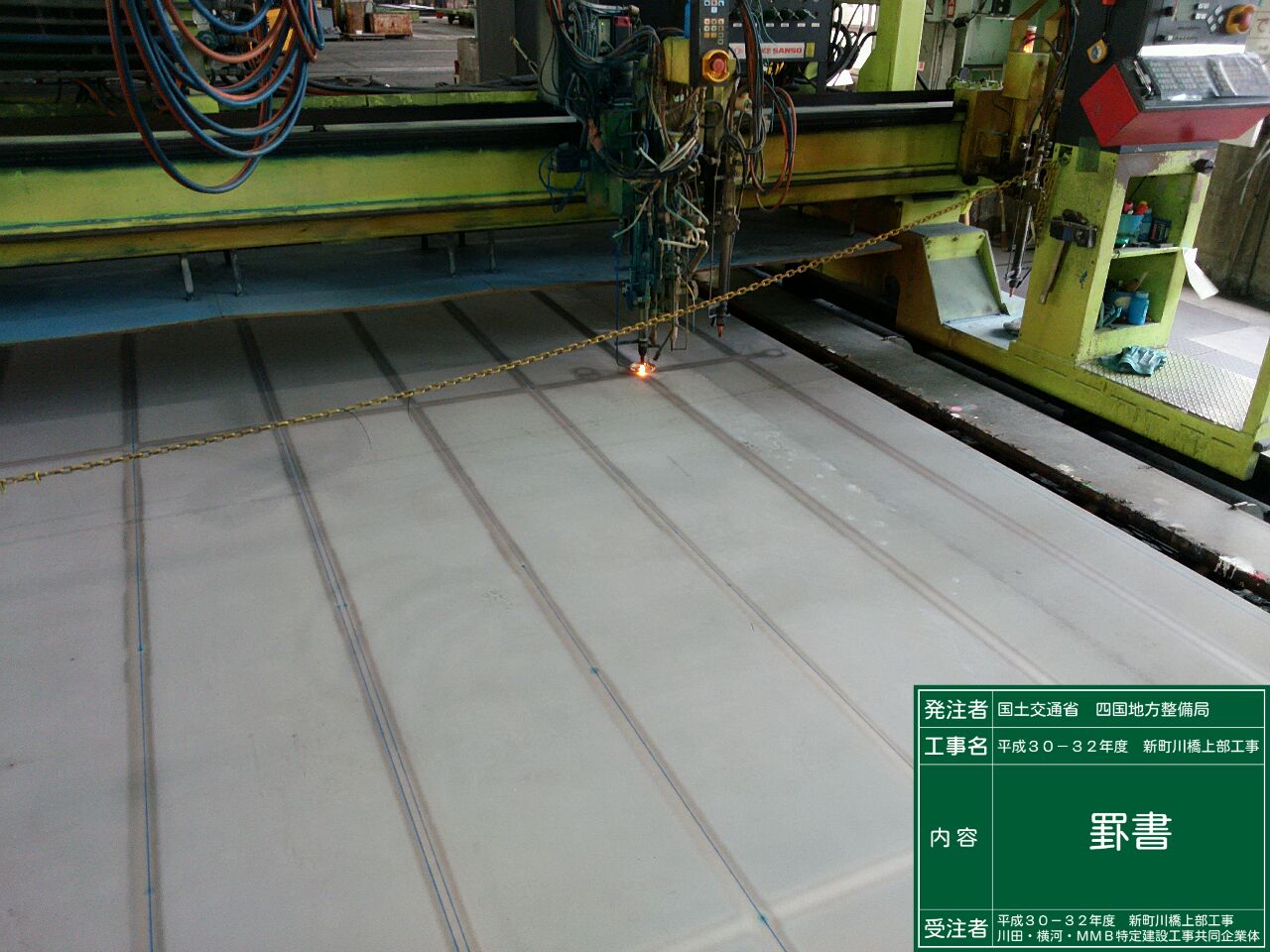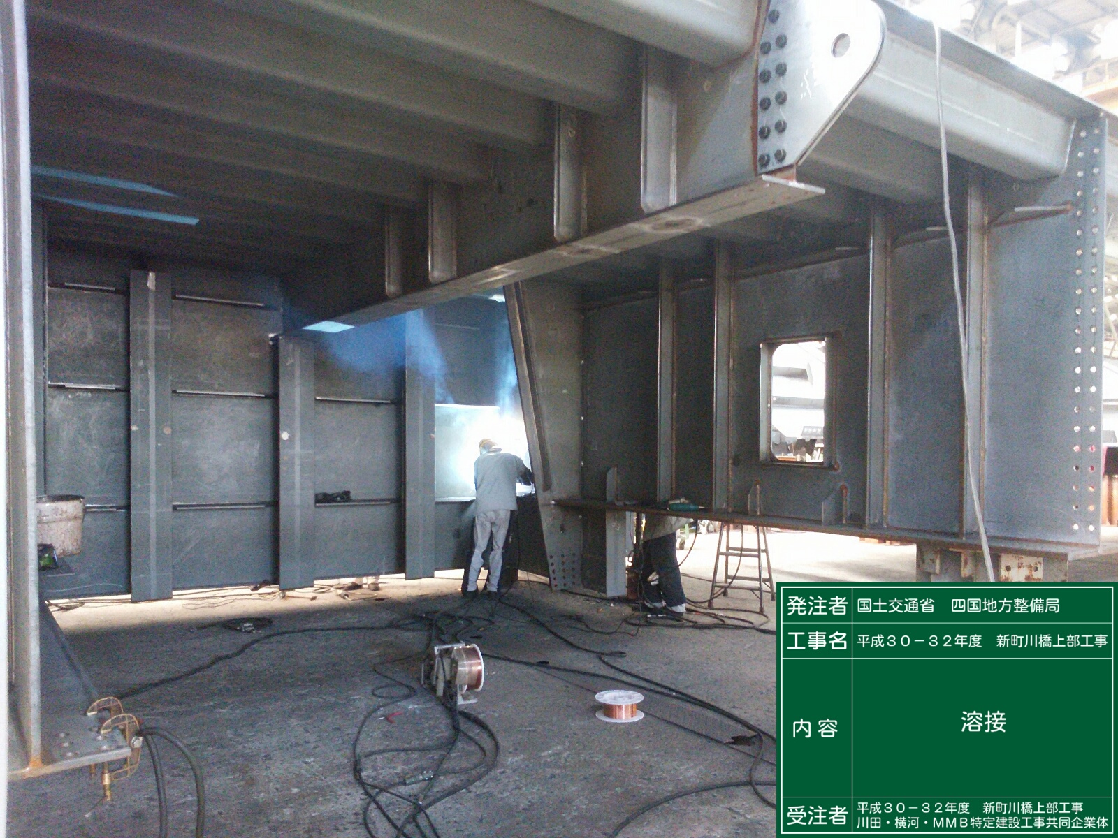鋼桁の1ブロック当たりの長さは大きいもので18m強。1ブロックの最大重量(約68t)や断面の寸法(高さ約6m、幅約5m)が工場建屋のクレーンの吊り能力を超えるものもあったため、ブロック割りを変えて工場建屋内での溶接から屋外ヤードでの溶接に変更するなどの対応が必要であった。また、鋼床版の疲労耐久性の向上を図るため、レーンマークを考慮した輪荷重走行範囲におけるUリブと横リブやダイヤフラムとの交差部のスカラップを省略している。さらに当該部分のUリブ溶接部にはピーニング処理を施しさらなる疲労耐久性の向上を図った。