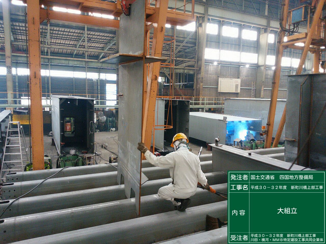 本橋の架設地点は海に面しているため、腐食を考慮して桁の外面にボルトの頭部などの突起物を無くし全断面溶接とした。これは工場製作だけでなく、現場での大ブロック間の接合も同様としている。また、各社間の接合部はJVの親である川田工業の四国工場で製作し仮組した上で、(ジョイント部の片側を)各社に送り、施工時の精度を上げている。また、大ブロック架設時の桁の挙動を精度よく推定する必要があるためFEM解析を行い製作キャンバーに反映している。地組は各社とも1年程度の時間を費やした。