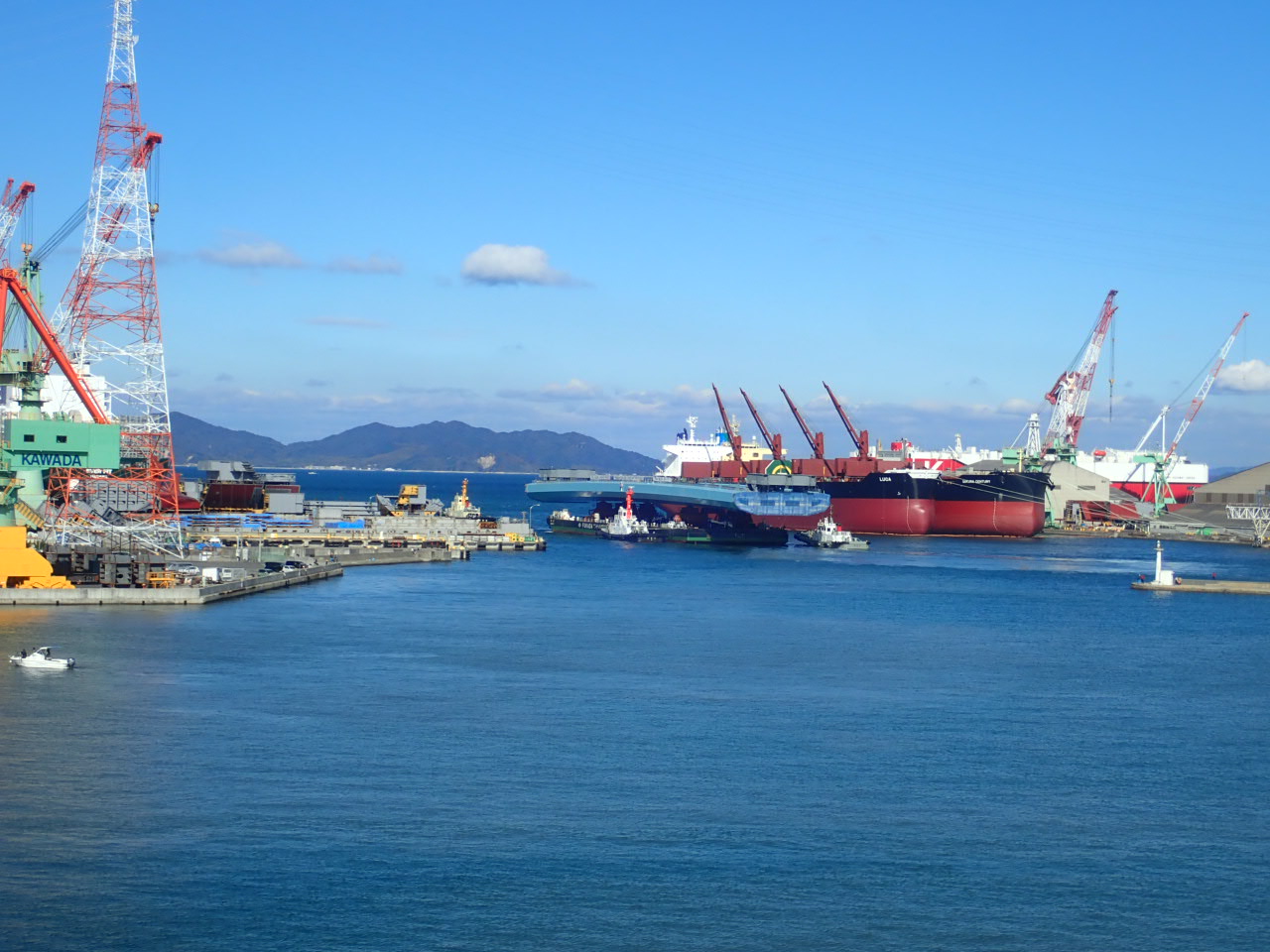 架設後の海上輸送状況①長崎の香焼、北九州市若松区で作った桁が関門海峡を通って台船輸送された