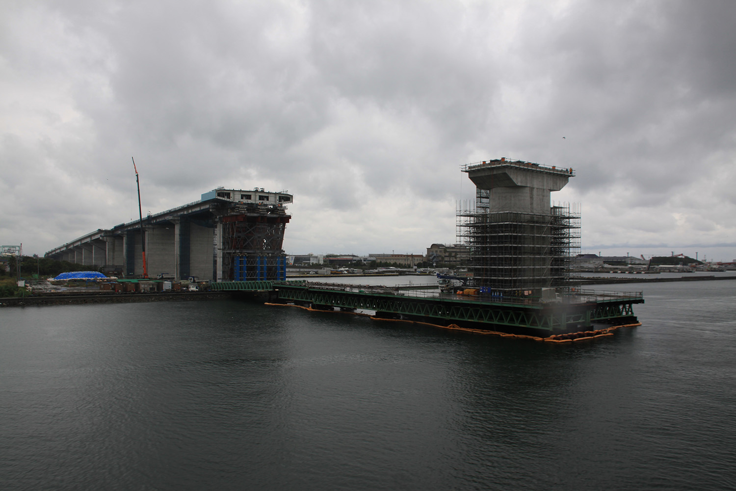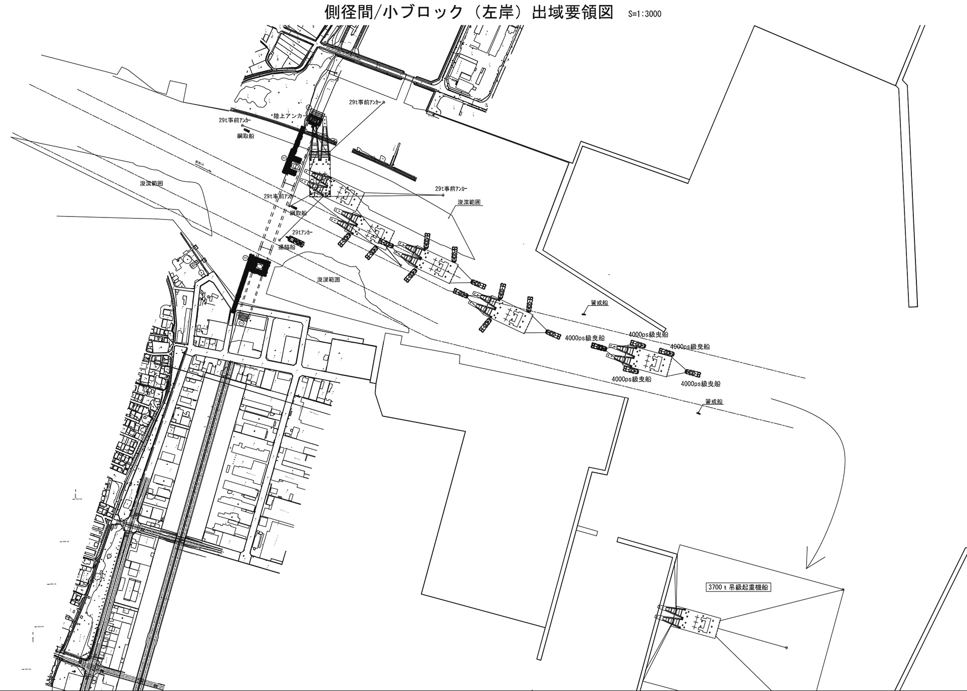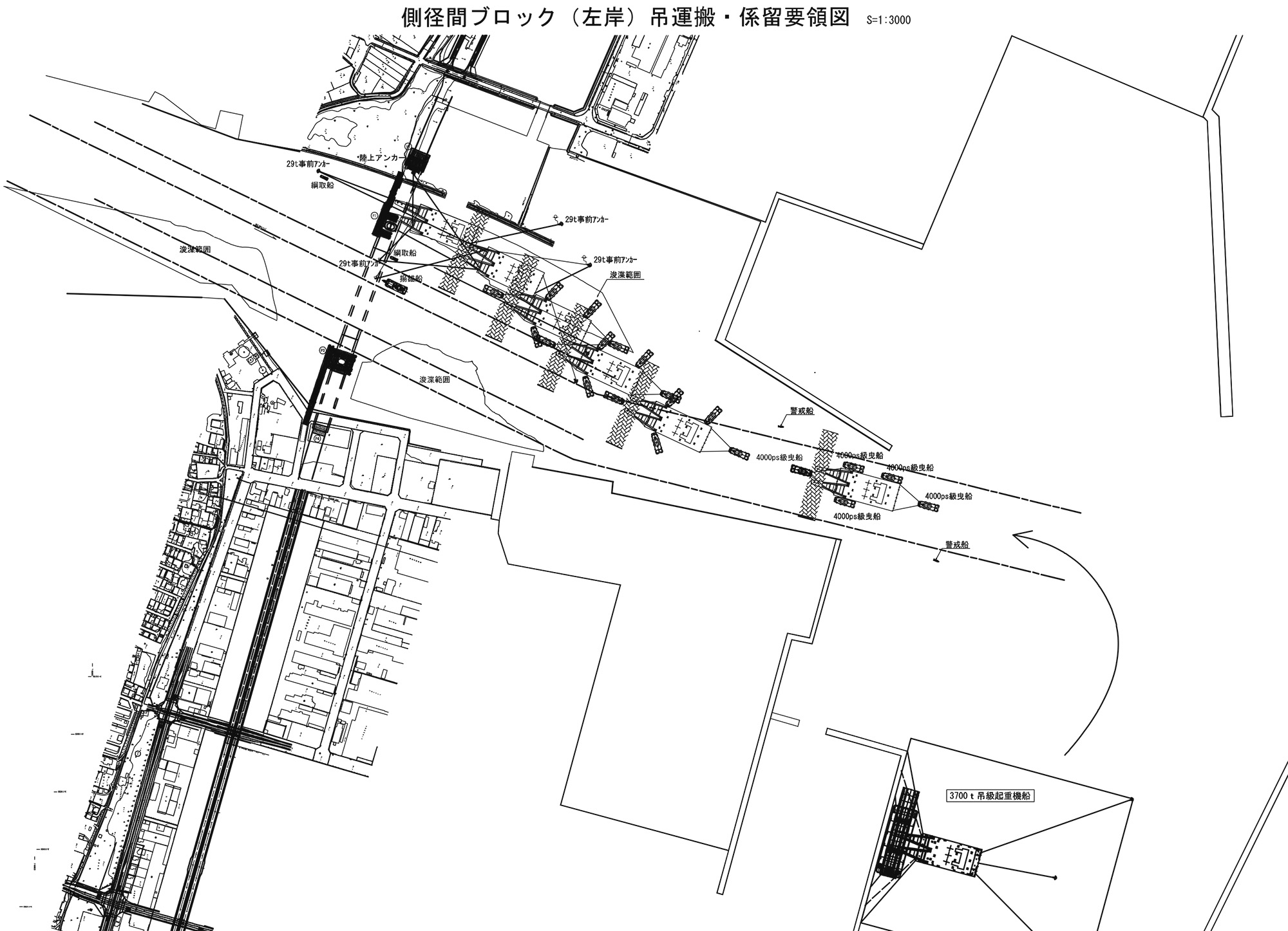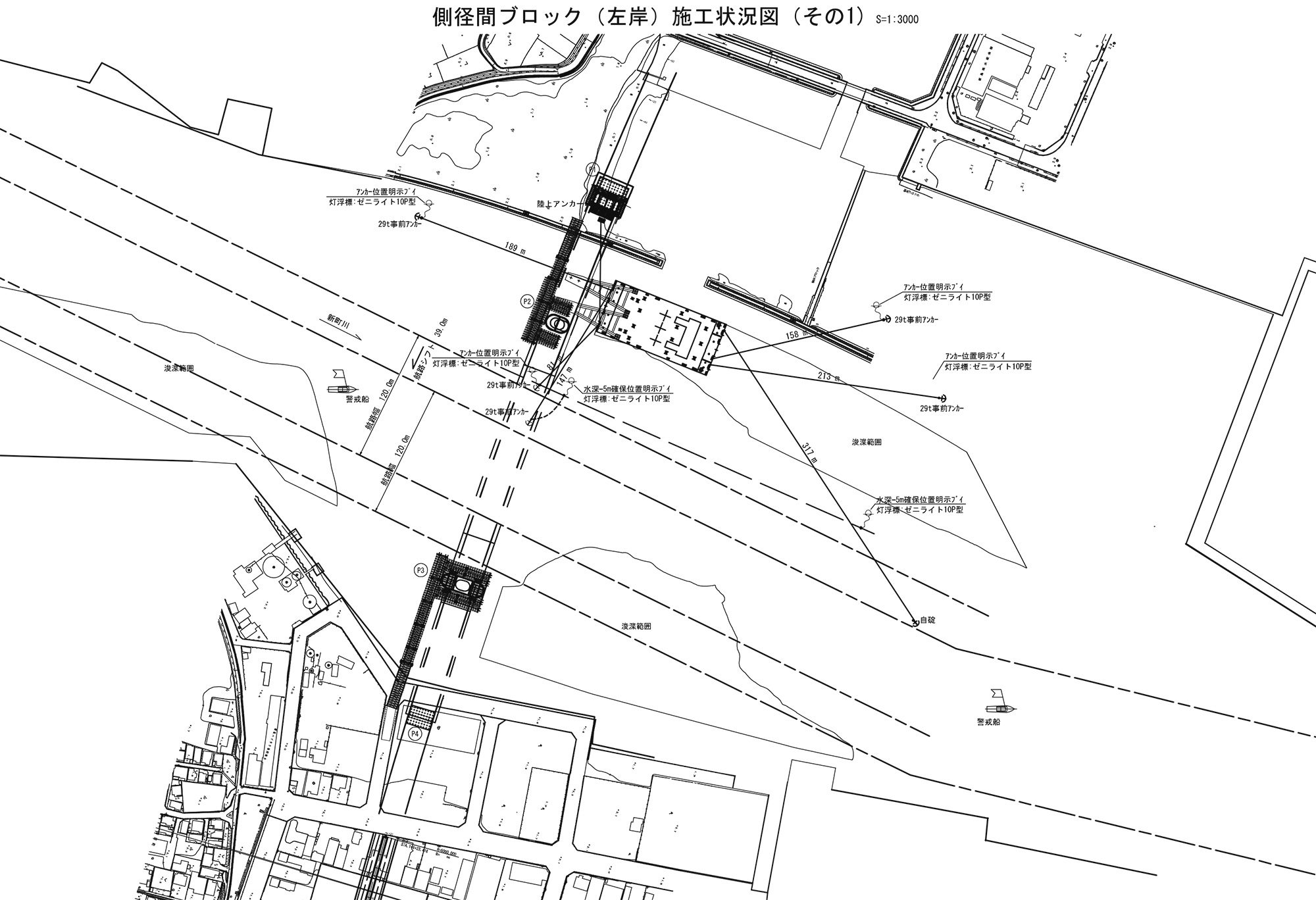 当初、左岸側の1、2回目のブロックは2つに分けず、一括で架設し、合計3回の架設という計画であった。しかし、FC船が入るため浚渫した際(本工事とは別発注)に、旧護岸の積石部分(河川に向かって斜めに入り込んでいる)が阻害要因となり予定通りの浚渫が困難となり、FC船が架設に必要な場所まで近づけないことが分かった。そのため、ブロックを小ブロックと大ブロックに分けて架設したもの。そのため、左岸には橋脚とベントにより2つの受け点があり、ベントも通常と異なり一部斜ベントを使っている。両ブロック間は前全断面溶接により接合している。3回目に施工した右岸側のブロックは、予定通り護岸の浚渫が行えたことから左岸のように2ブロックに分けることなく一括架設できた。左岸から先に架けたのは、右岸の大ブロック架設と並行して、左岸の小・大ブロック間の溶接を並行して行うため。
