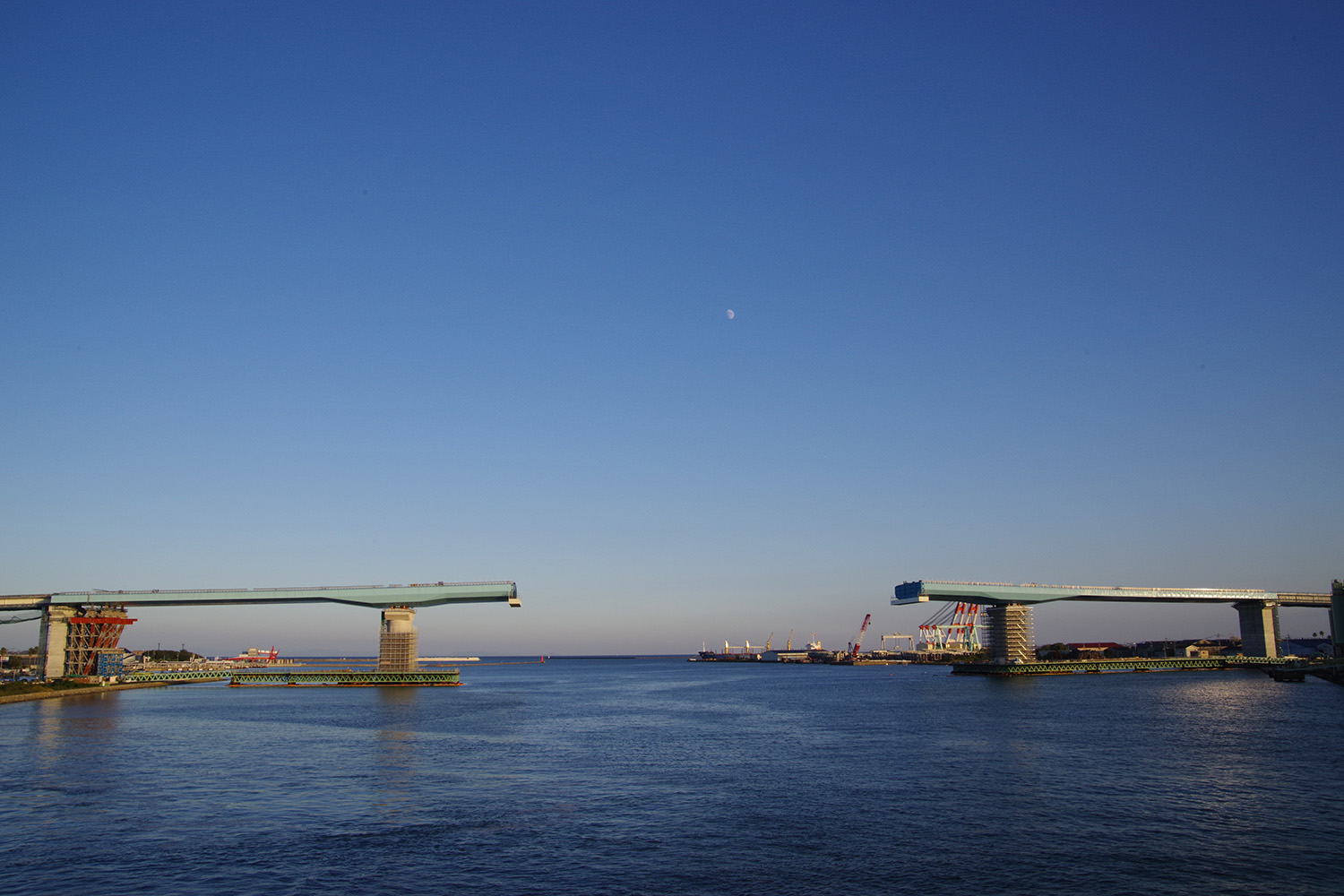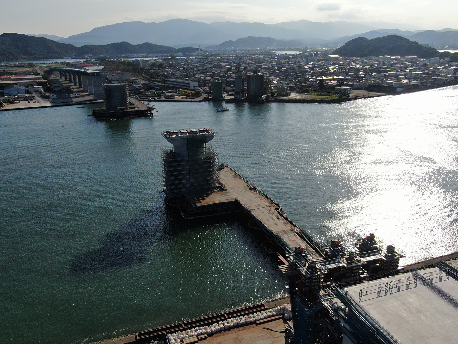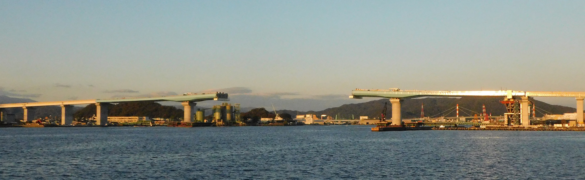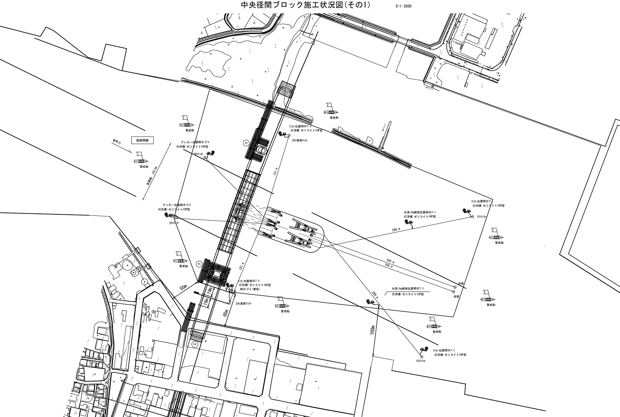 当初、左岸側の1、2回目のブロックは2つに分けず、一括で架設し、合計3回の架設という計画であった。しかし、FC船が入るため浚渫した際(本工事とは別発注)に、旧護岸の積石部分(河川に向かって斜めに入り込んでいる)が阻害要因となり予定通りの浚渫が困難となり、FC船が架設に必要な場所まで近づけないことが分かった。そのため、ブロックを小ブロックと大ブロックに分けて架設したもの。そのため、左岸には橋脚とベントにより2つの受け点があり、ベントも通常と異なり一部斜ベントを使っている。両ブロック間は前全断面溶接により接合している。3回目に施工した右岸側のブロックは、予定通り護岸の浚渫が行えたことから左岸のように2ブロックに分けることなく一括架設できた。左岸から先に架けたのは、右岸の大ブロック架設と並行して、左岸の小・大ブロック間の溶接を並行して行うため。