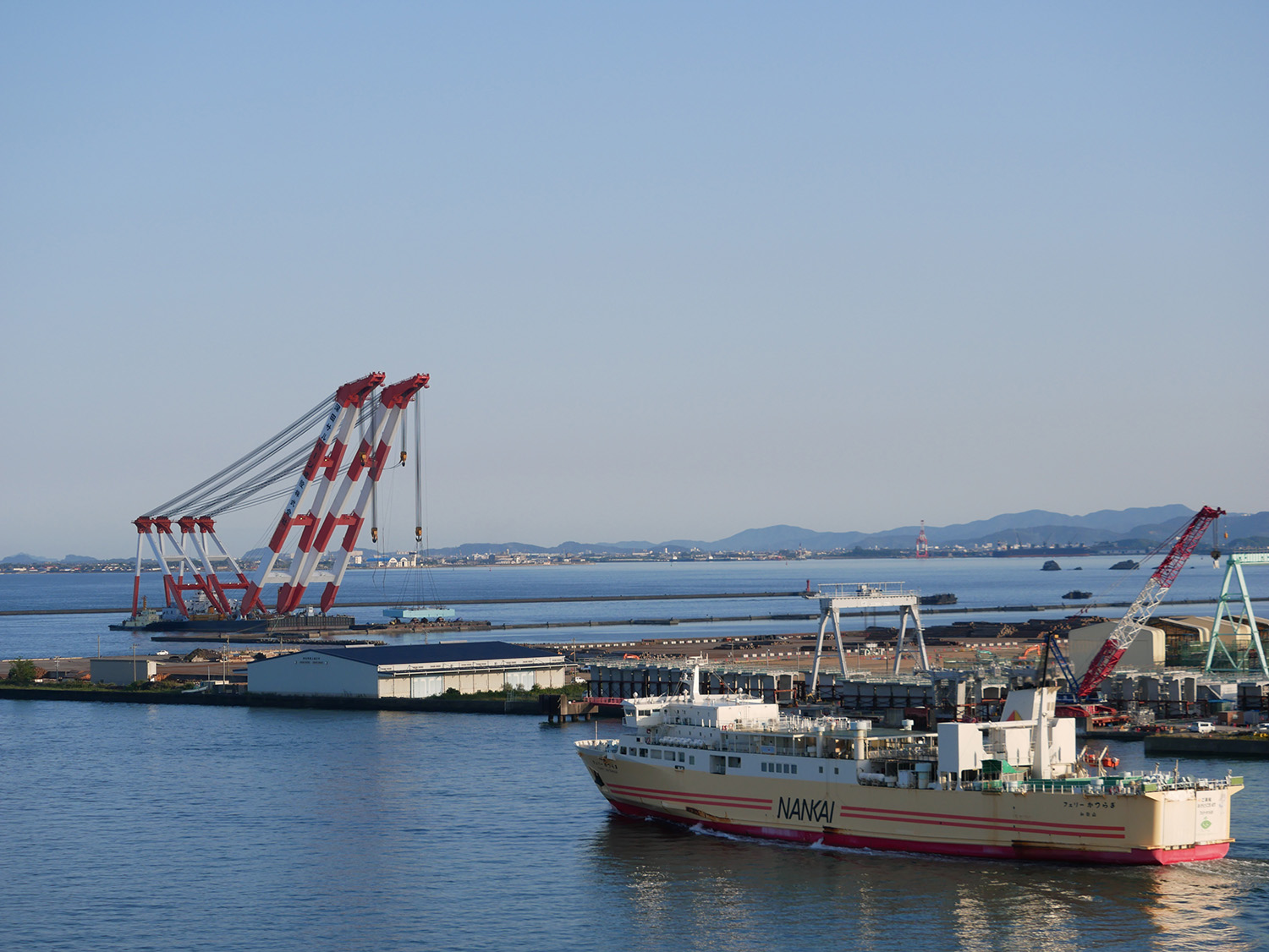 架設する最終ブロックは多度津から台船に載せて輸送し、新町川右岸から2kmほど離れた水切り場として確保している岸壁に停泊。架設日前日(4日)には朝からFC船を用いて玉掛け作業を行った。(右写真、大柴功治撮影)