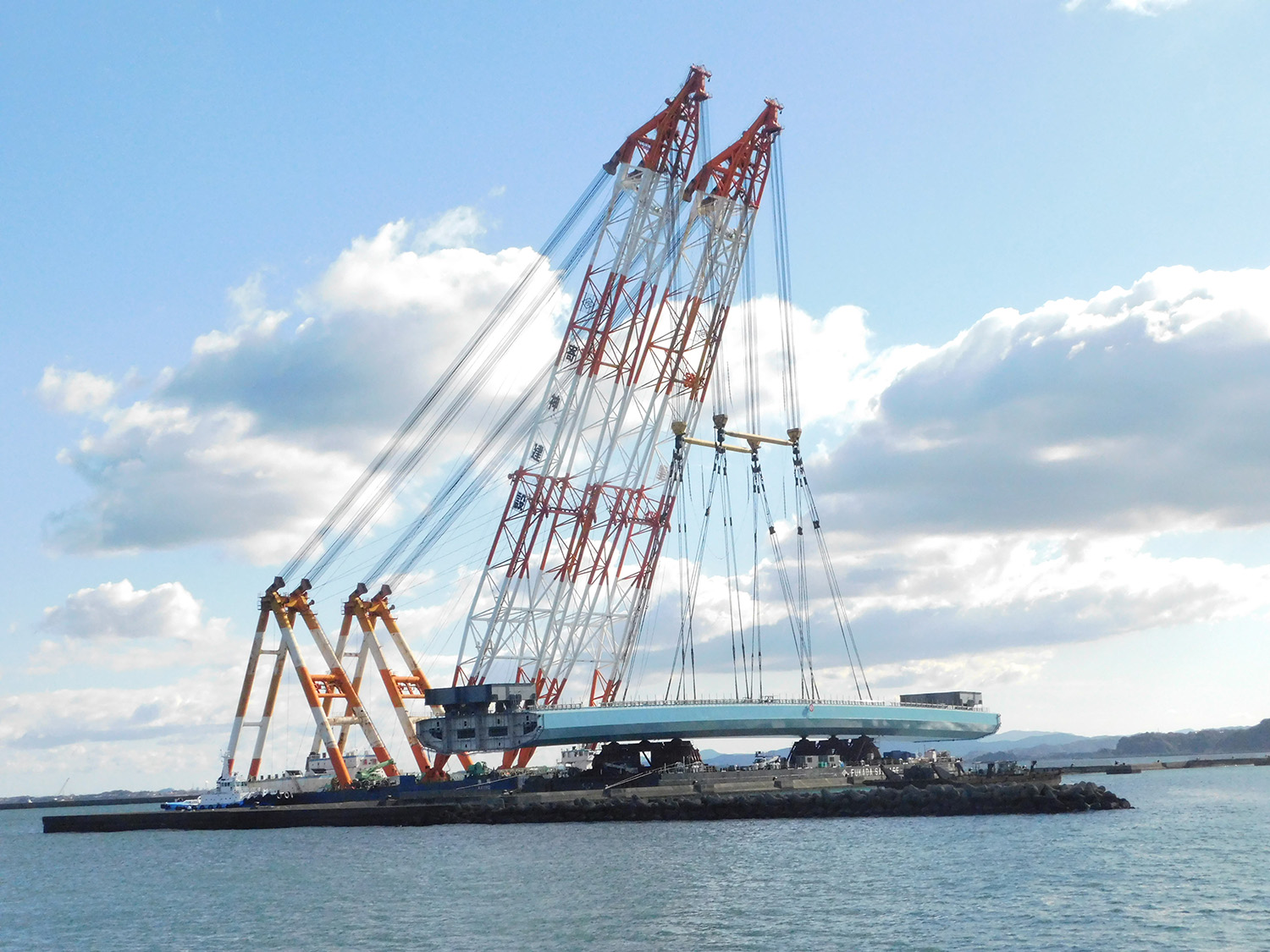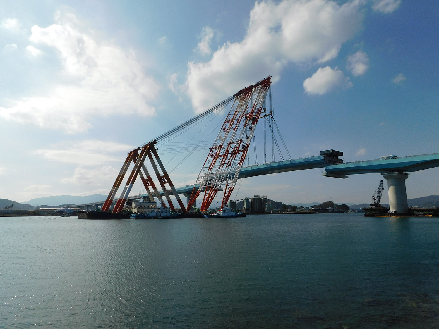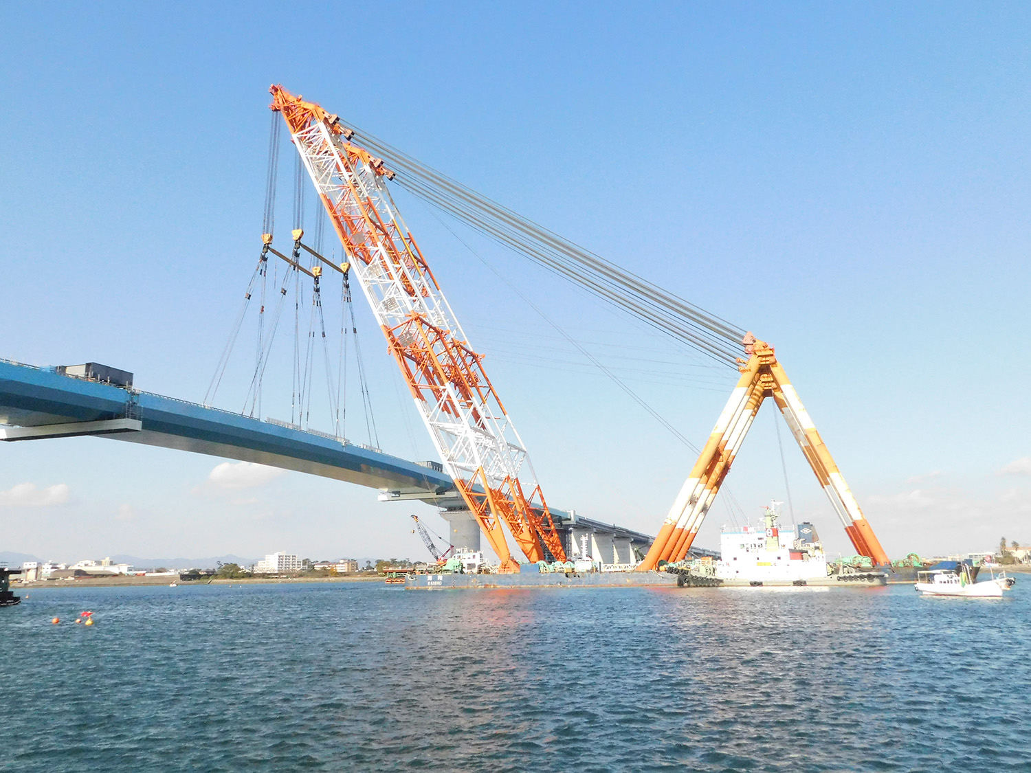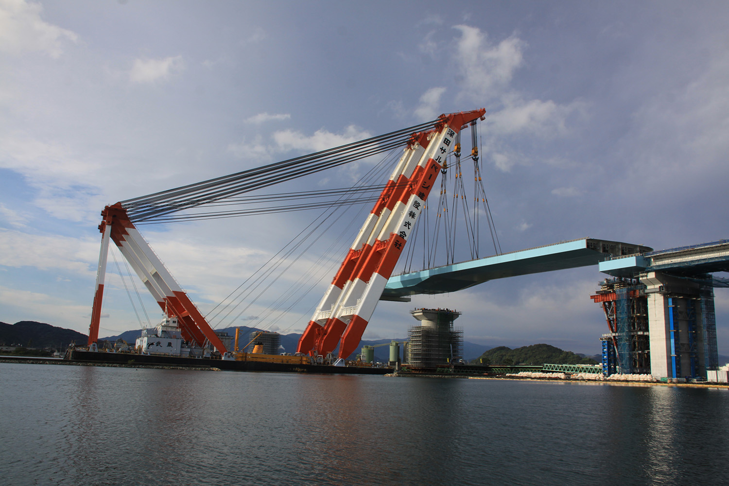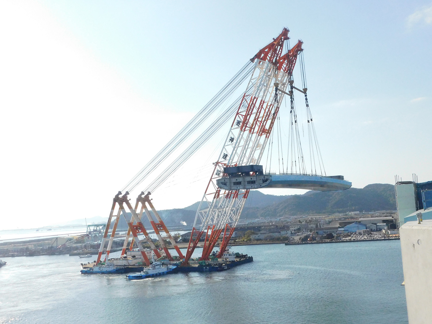 最終ブロックの吊荷重は、3,400t超と新町川橋の架設4ブロック中最大である。桁そのものの重量は、3ブロック目より軽いものの、セッティングビームなど付属する治具が多いためだ。そのため、当JVは、全てのFC架設を『武蔵』で行う予定であったが、「最終的な重量積算をすると本ブロックの架設のみは『武蔵』では施工できないことが分かった」(同)。単純な重量だけ見れば、最終ブロックの重量は『武蔵』の定格荷重以下に収まるが、「架設に使うフック(4点、1点当たり925t)それぞれに懸かる個別荷重を算出した結果、平面形状のRによって、若干であるが、重量バランスが偏ることが分かり」(同)、個別フックによっては定格荷重を超過することから、日本最大のFC船である寄神建設の『海翔』を用いた(『海翔』も4フックだが、1点当たりは1,025tとなる)。ちなみに吊り点は、最小の1ブロックのみ8点吊りとし、それ以外の3ブロックは16点吊りとした。それでも吊重量は『海翔』の定格荷重の84%に達する重量であるため、施工には慎重さが求められた。