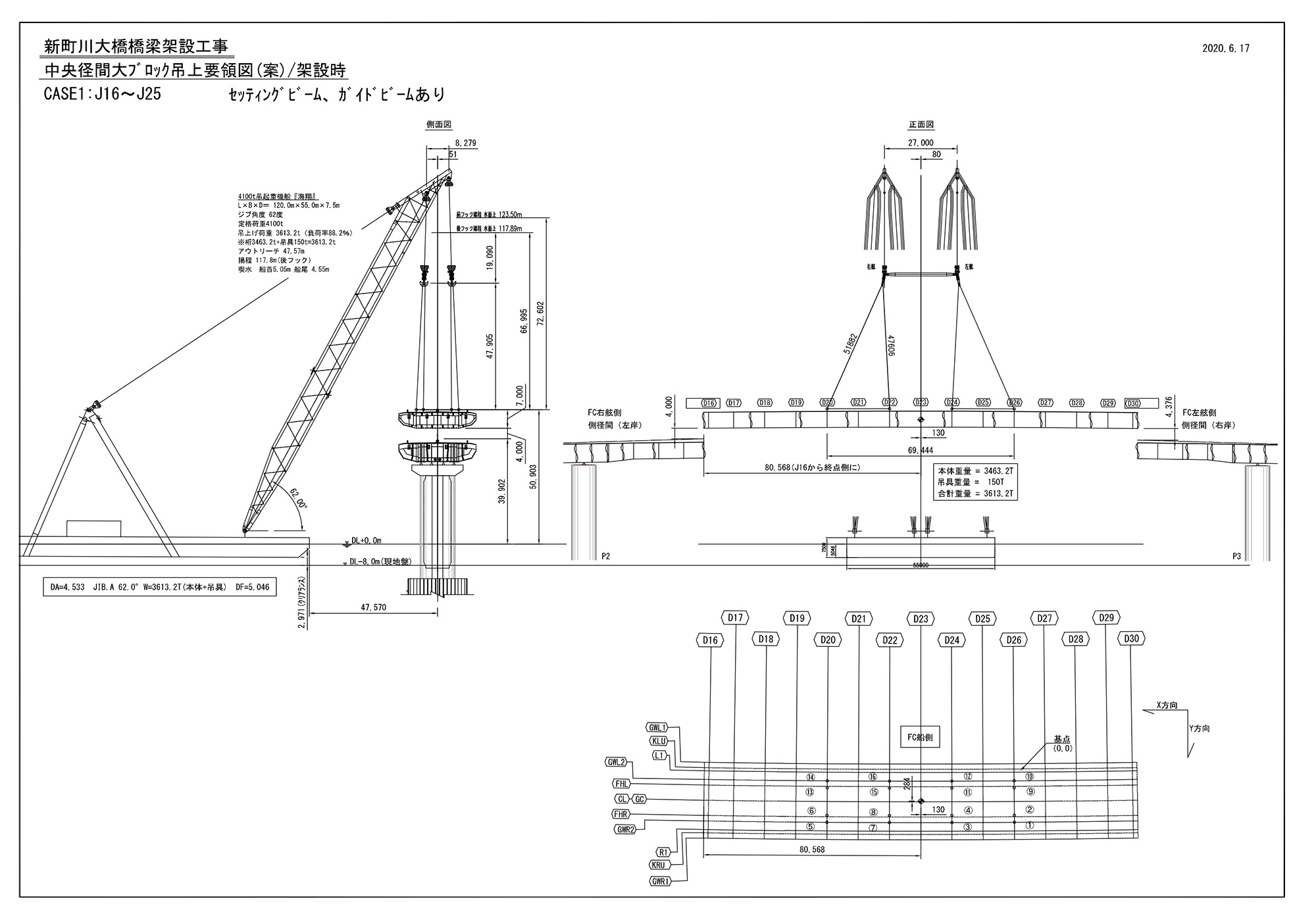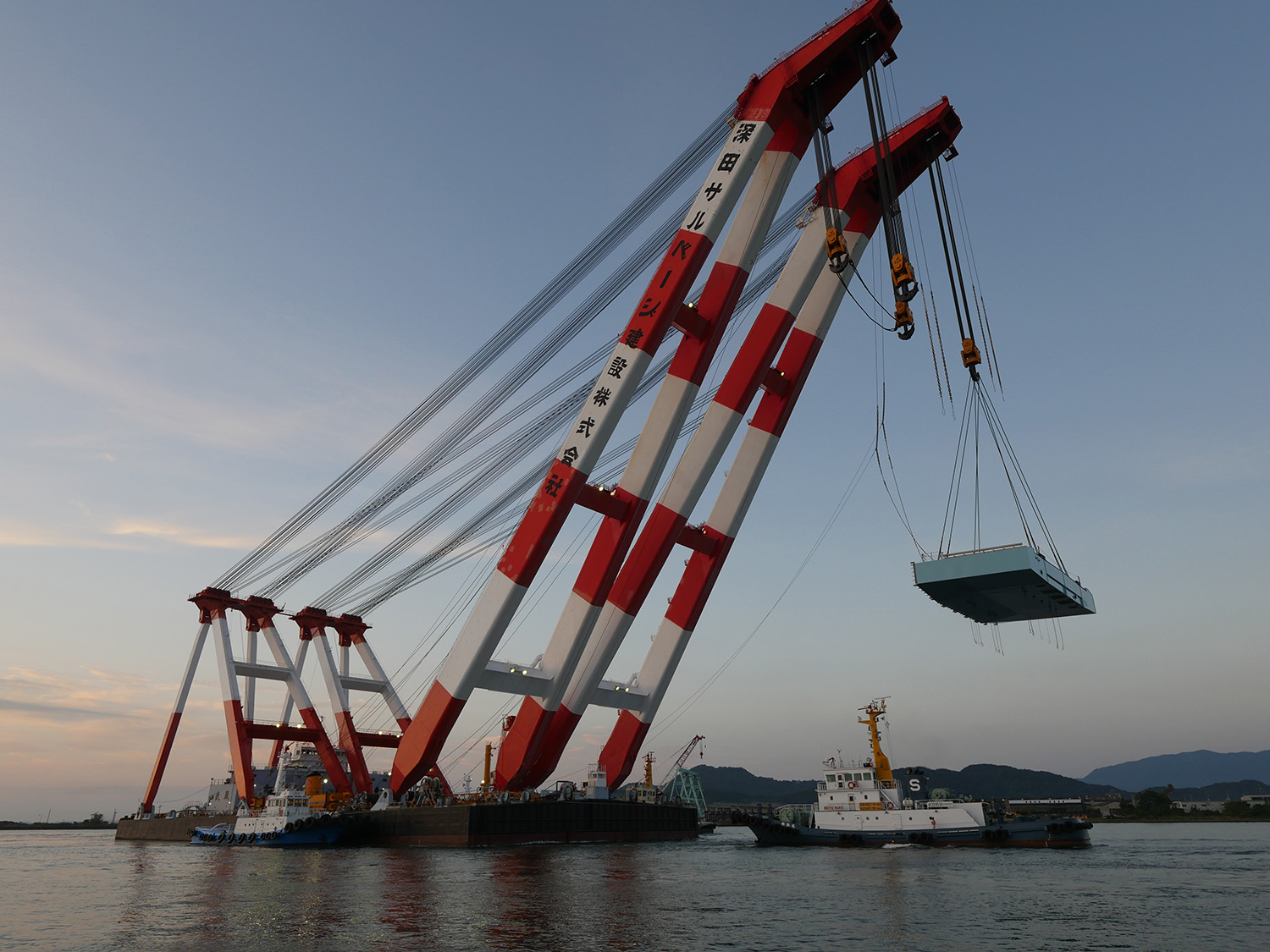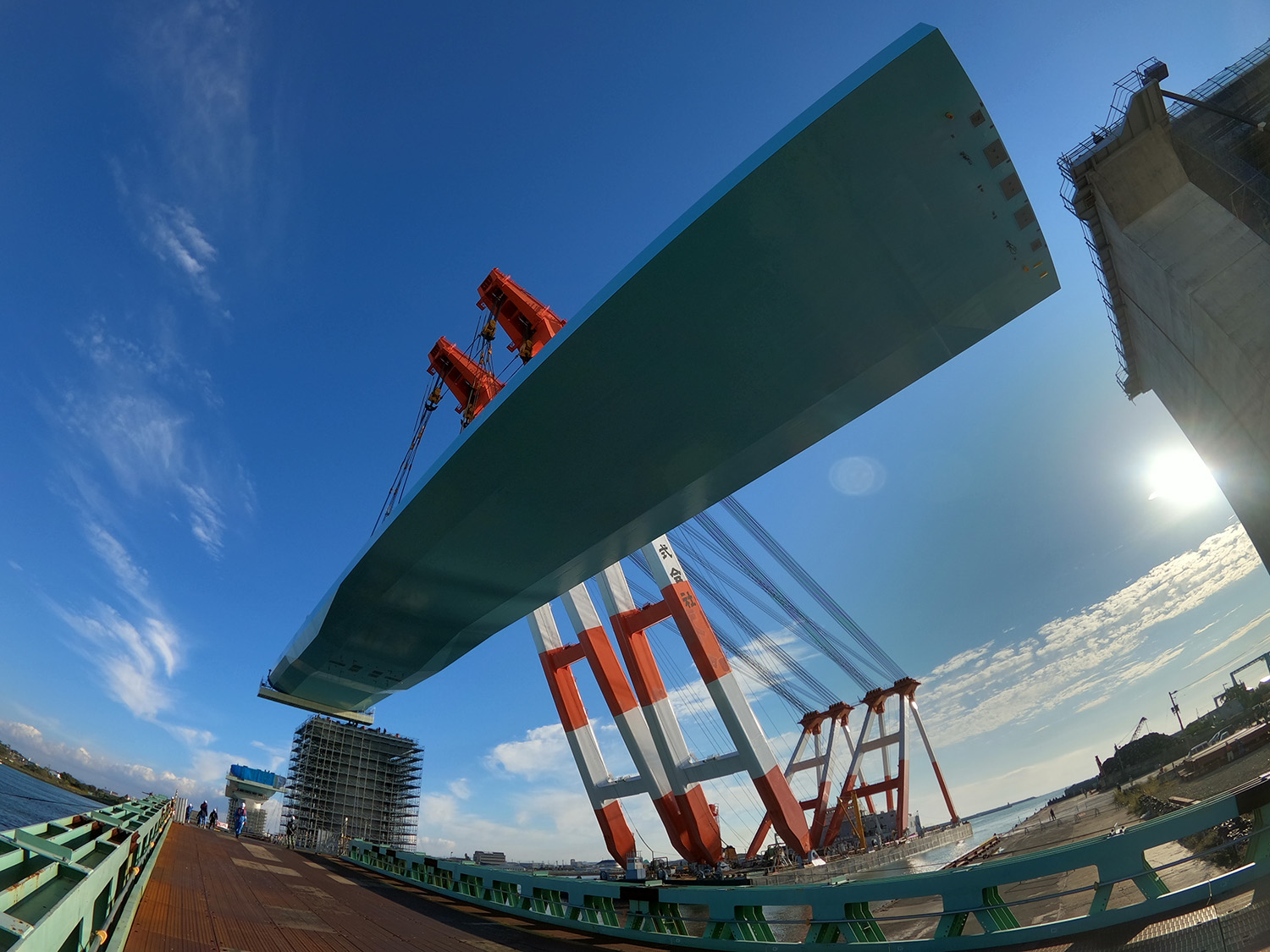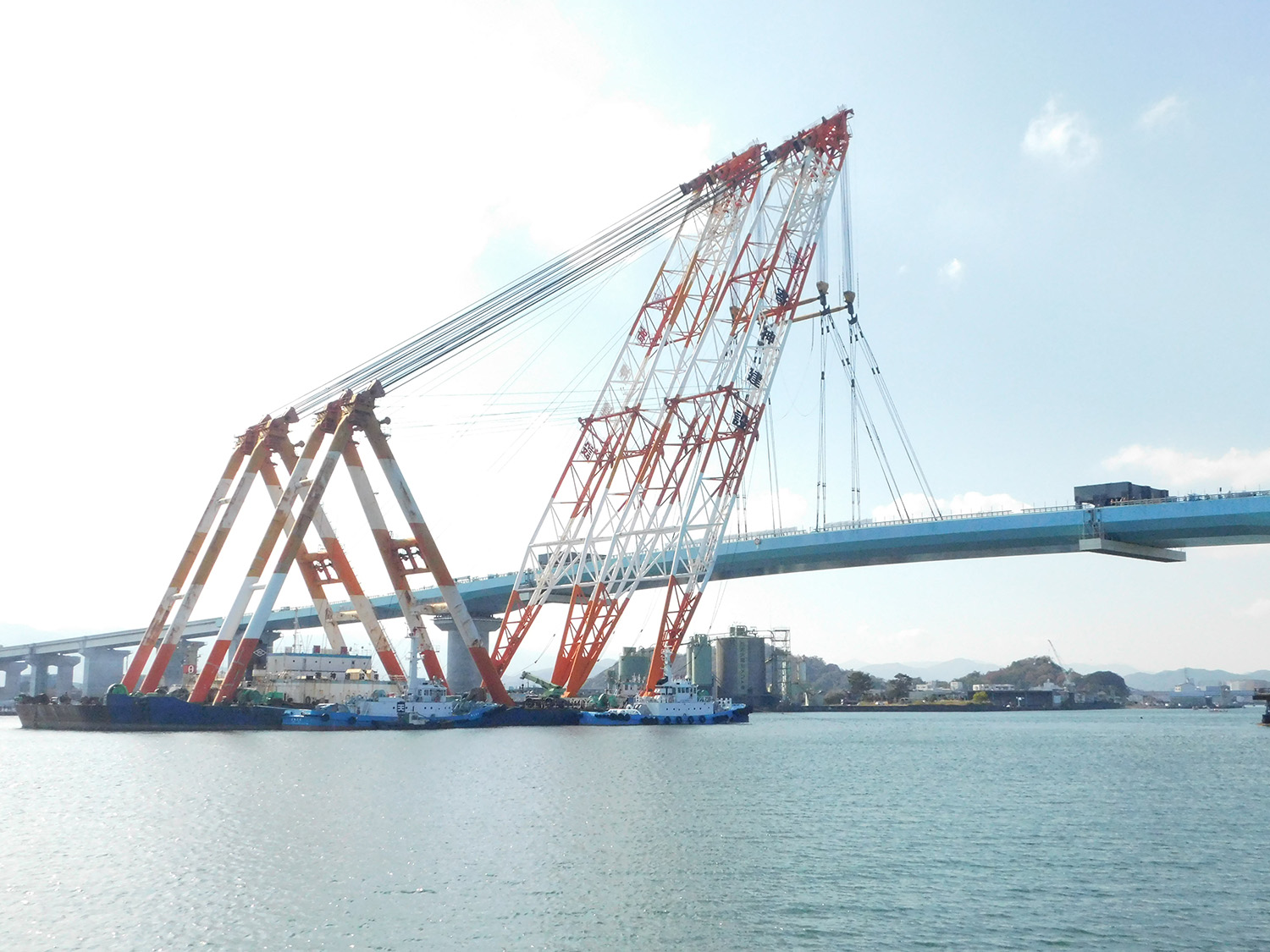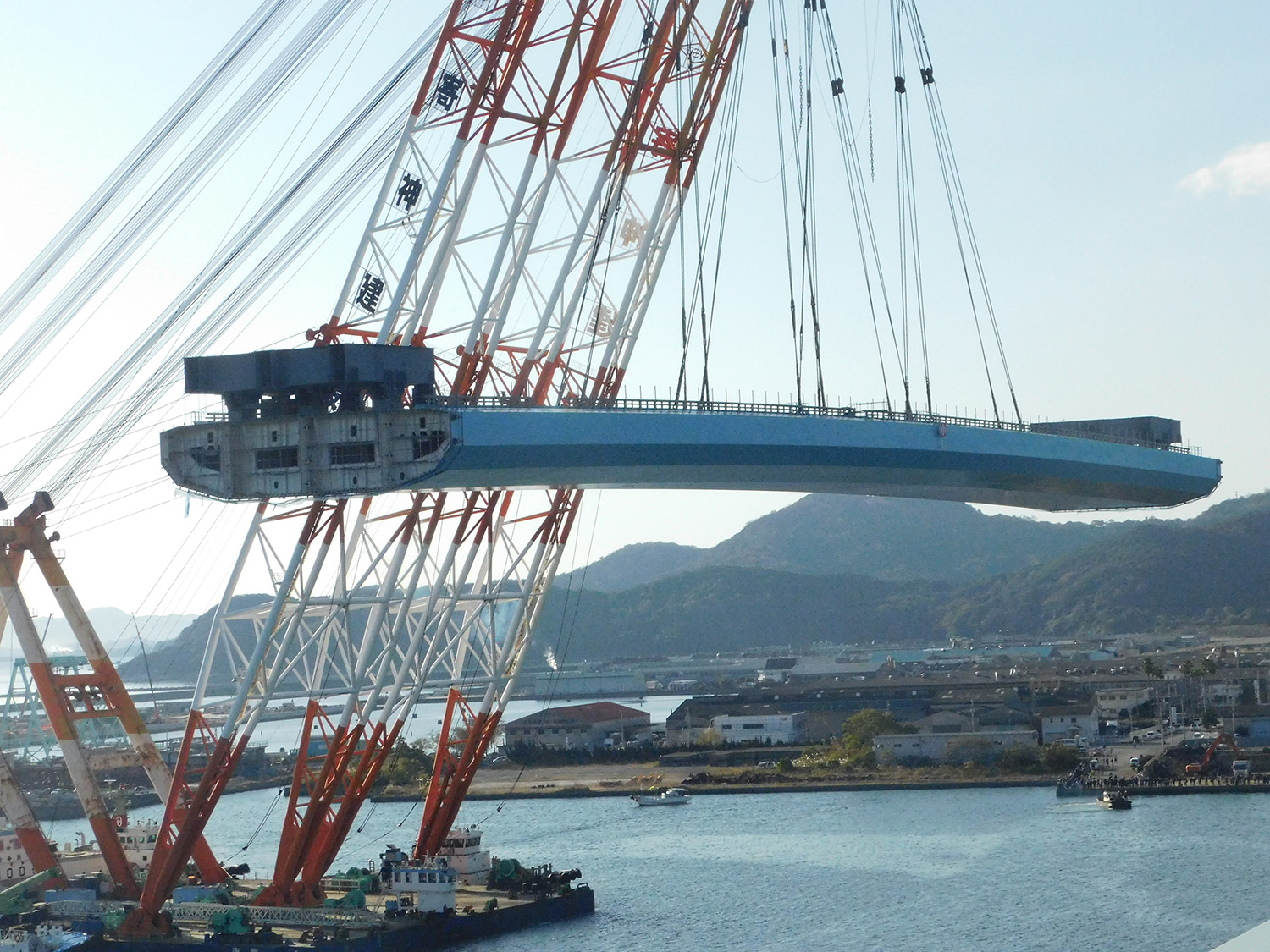 最終ブロックの吊荷重は、3,400t超と新町川橋の架設4ブロック中最大である。桁そのものの重量は、3ブロック目より軽いものの、セッティングビームなど付属する治具が多いためだ。そのため、当JVは、全てのFC架設を『武蔵』で行う予定であったが、「最終的な重量積算をすると本ブロックの架設のみは『武蔵』では施工できないことが分かった」(同)。単純な重量だけ見れば、最終ブロックの重量は『武蔵』の定格荷重以下に収まるが、「架設に使うフック(4点、1点当たり925t)それぞれに懸かる個別荷重を算出した結果、平面形状のRによって、若干であるが、重量バランスが偏ることが分かり」(同)、個別フックによっては定格荷重を超過することから、日本最大のFC船である寄神建設の『海翔』を用いた(『海翔』も4フックだが、1点当たりは1,025tとなる)。ちなみに吊り点は、最小の1ブロックのみ8点吊りとし、それ以外の3ブロックは16点吊りとした。それでも吊重量は『海翔』の定格荷重の84%に達する重量であるため、施工には慎重さが求められた。