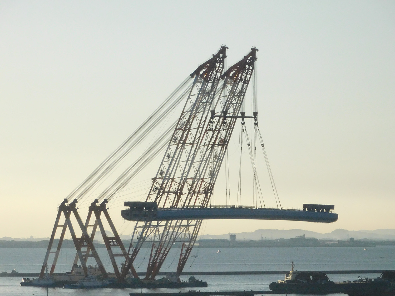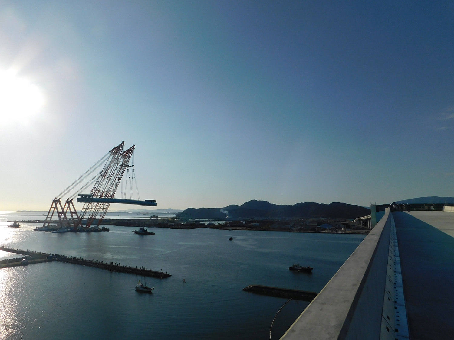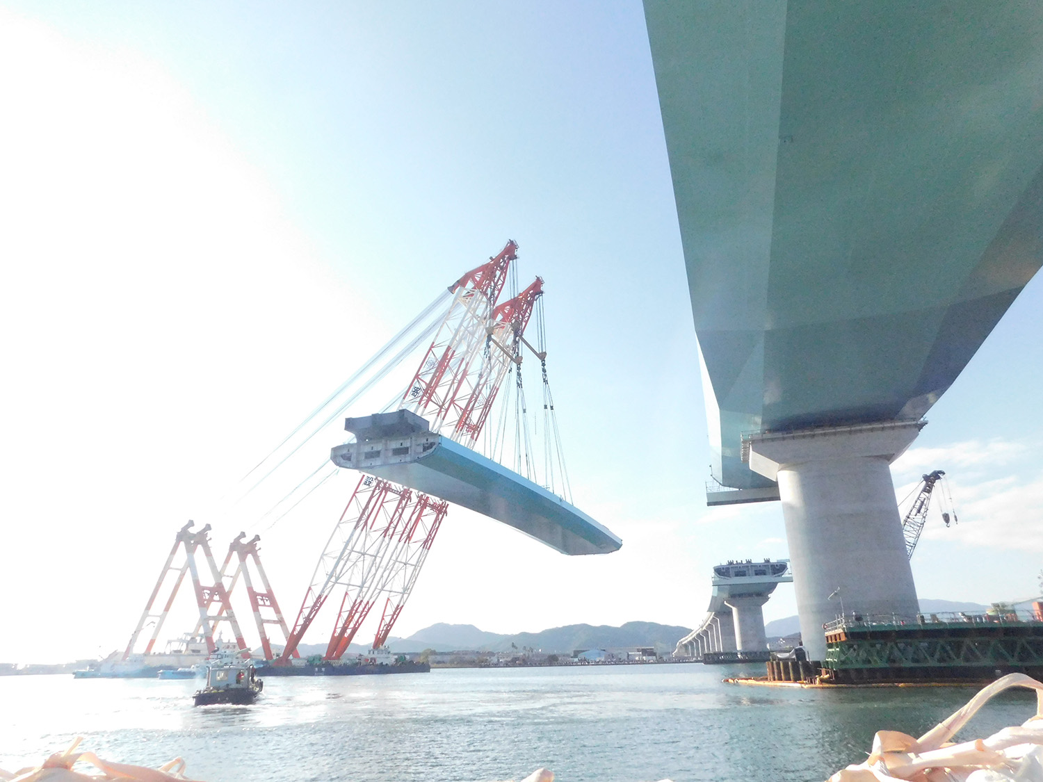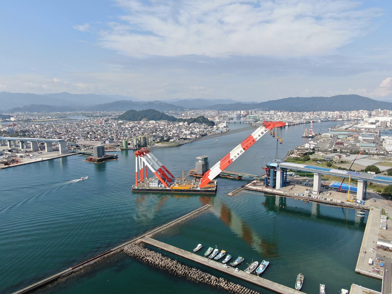 架設当日は、7時から吊上げ作業を開始、7時半過ぎにはFC船の係留を解除した。新町川橋上流の徳島港から8時に出港した南海フェリーの通過を待ち、8時15分過ぎから係留地から架設地まで約2kmの吊曳航を始めている。なお、航路は21時まで全面封鎖を行った。9時頃からワイヤーによる曳航のための作業を行い、10時から所定位置まで前進してブロックを吊り下ろしていった。橋軸方向、橋軸直角の調整を行いながら、13時半にはセッティングビームを架設済みブロック上に設置したジャッキにタッチさせ、荷重を預け終えた後、FC船側の荷重を開放して玉掛けを外す作業を行った。