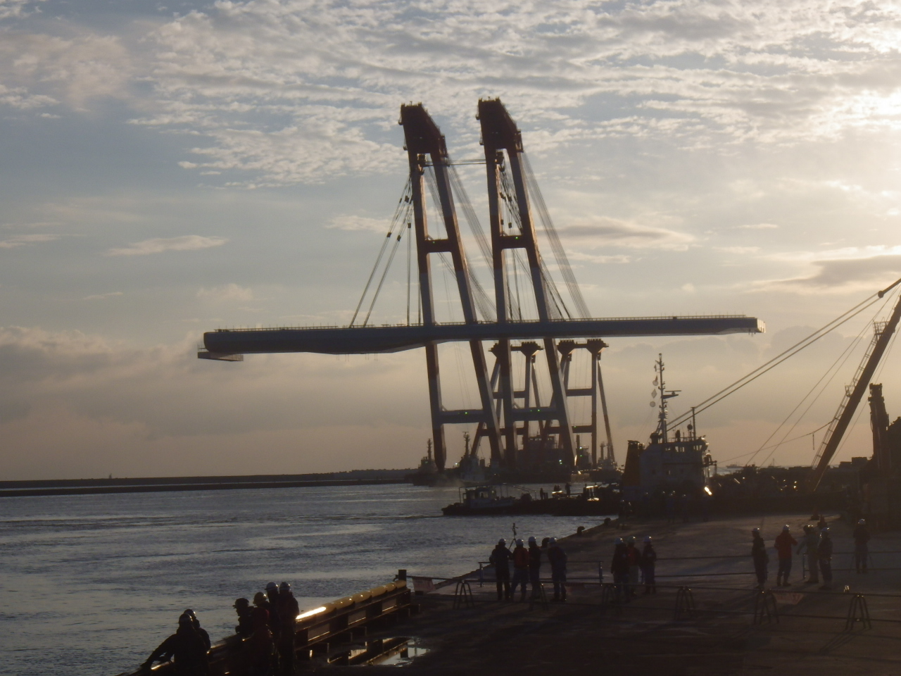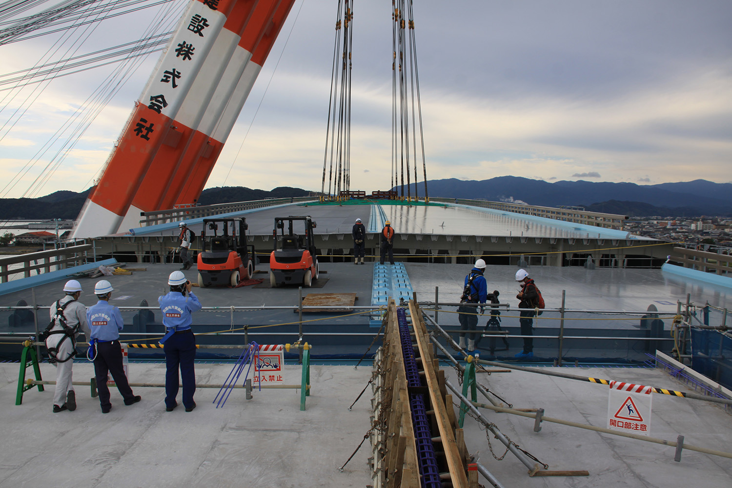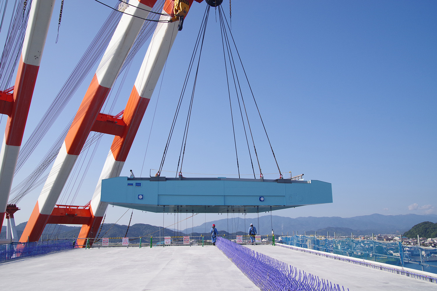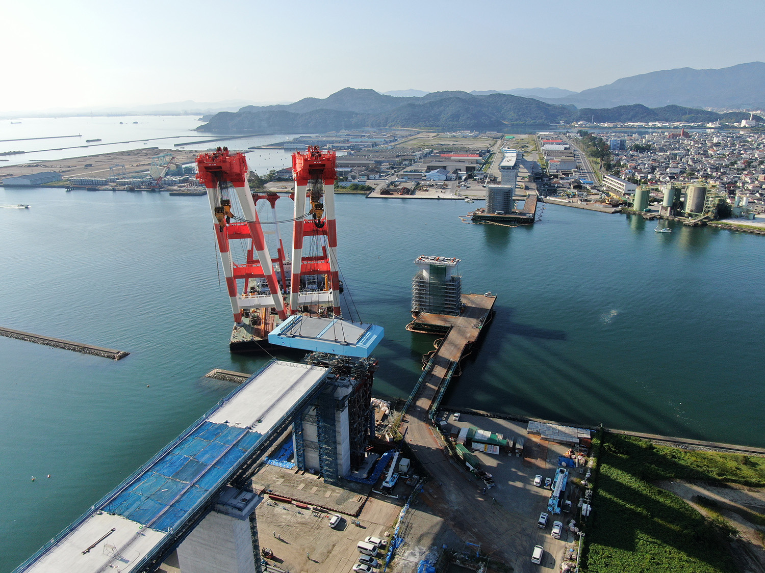 架設当日は、7時から吊上げ作業を開始、7時半過ぎにはFC船の係留を解除した。新町川橋上流の徳島港から8時に出港した南海フェリーの通過を待ち、8時15分過ぎから係留地から架設地まで約2kmの吊曳航を始めている。なお、航路は21時まで全面封鎖を行った。9時頃からワイヤーによる曳航のための作業を行い、10時から所定位置まで前進してブロックを吊り下ろしていった。橋軸方向、橋軸直角の調整を行いながら、13時半にはセッティングビームを架設済みブロック上に設置したジャッキにタッチさせ、荷重を預け終えた後、FC船側の荷重を開放して玉掛けを外す作業を行った。