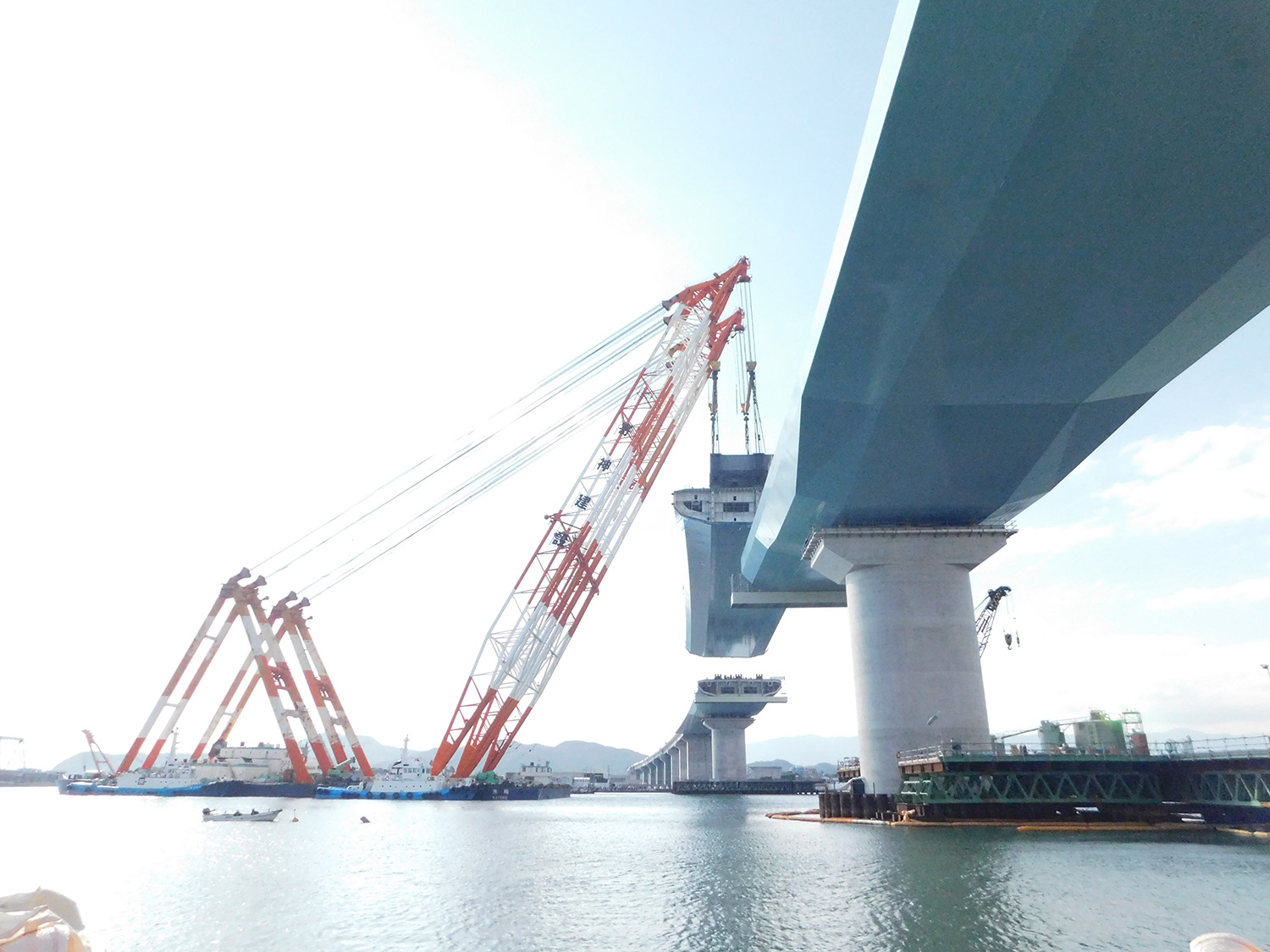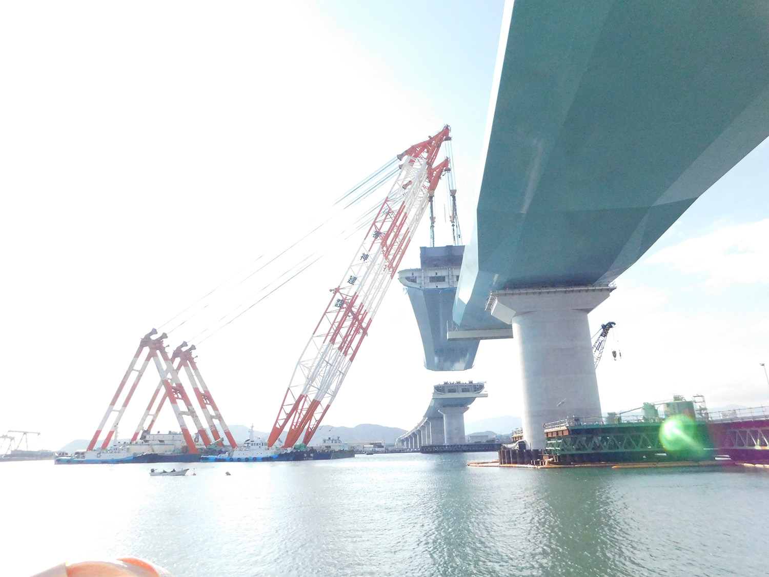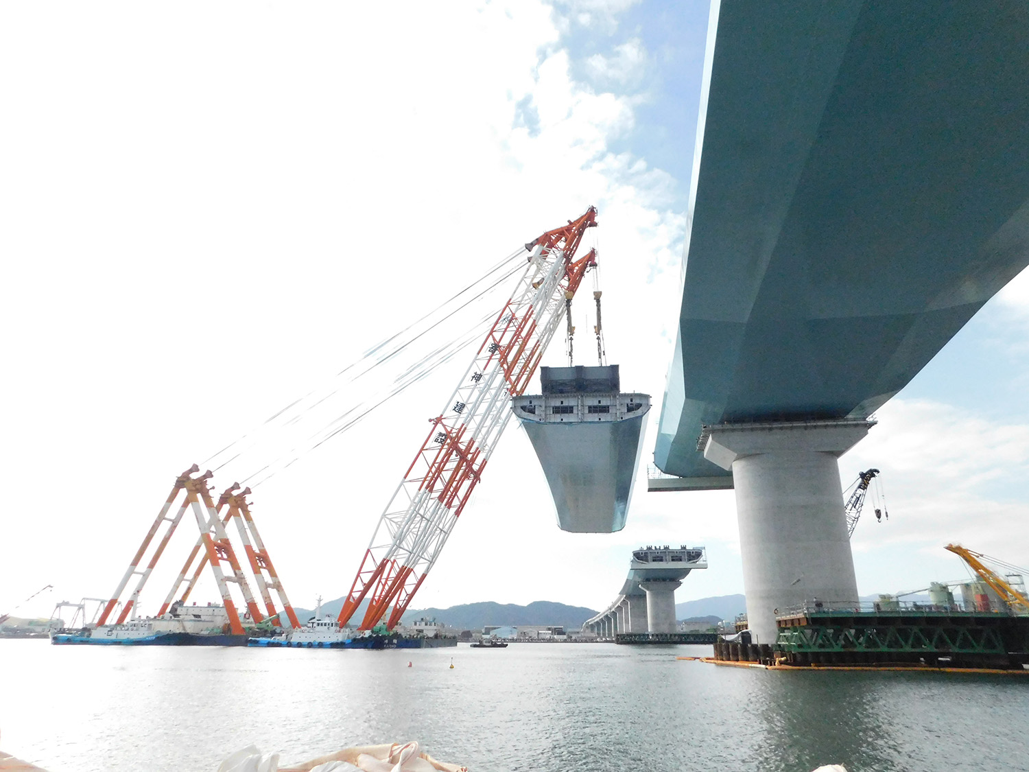 元請は川田工業・横河ブリッジ・MMBJV。一次下請は架設工が深田サルベージ建設、河内橋梁。溶接工が島川工業。海上輸送工が大新土木。重機工が佐々木運輸機工。ジャッキ工が大瀧ジャッキ。防護柵製作・設置工が大久保産業。架設工の二次下請は寄神建設。