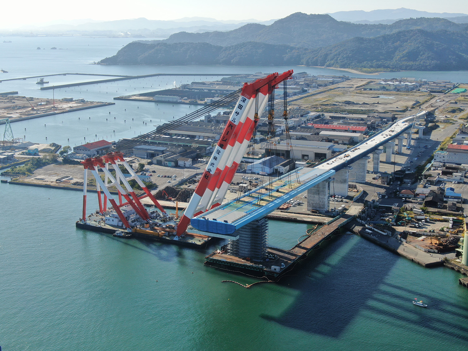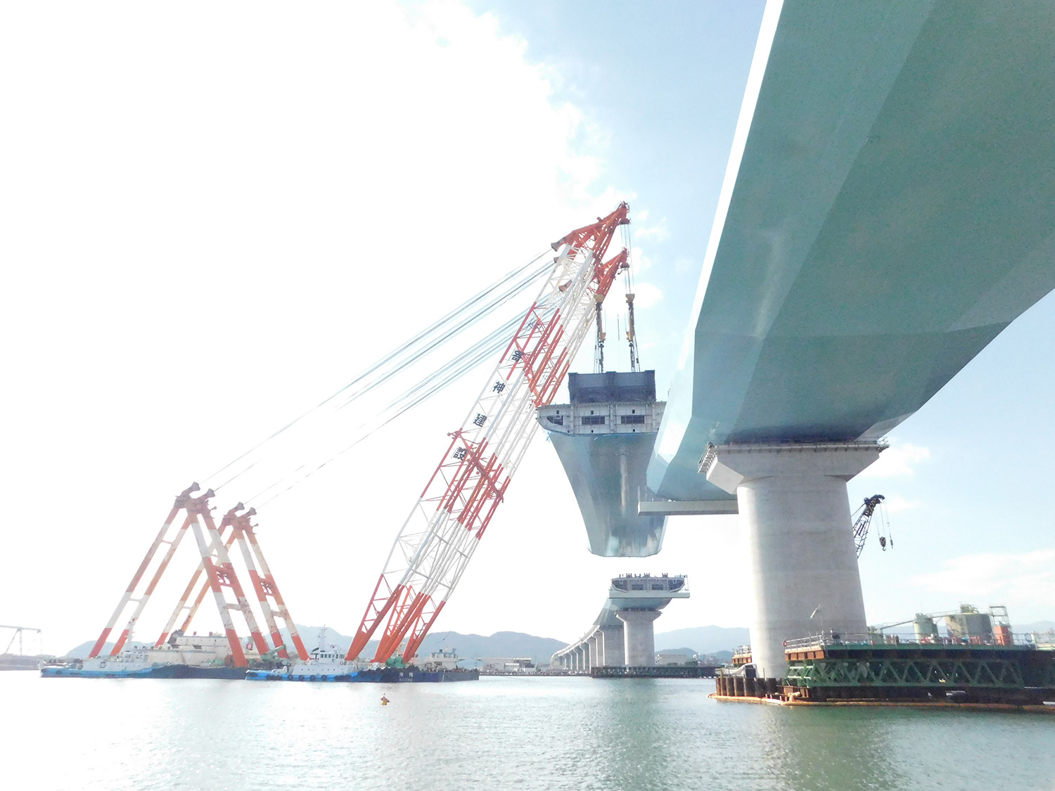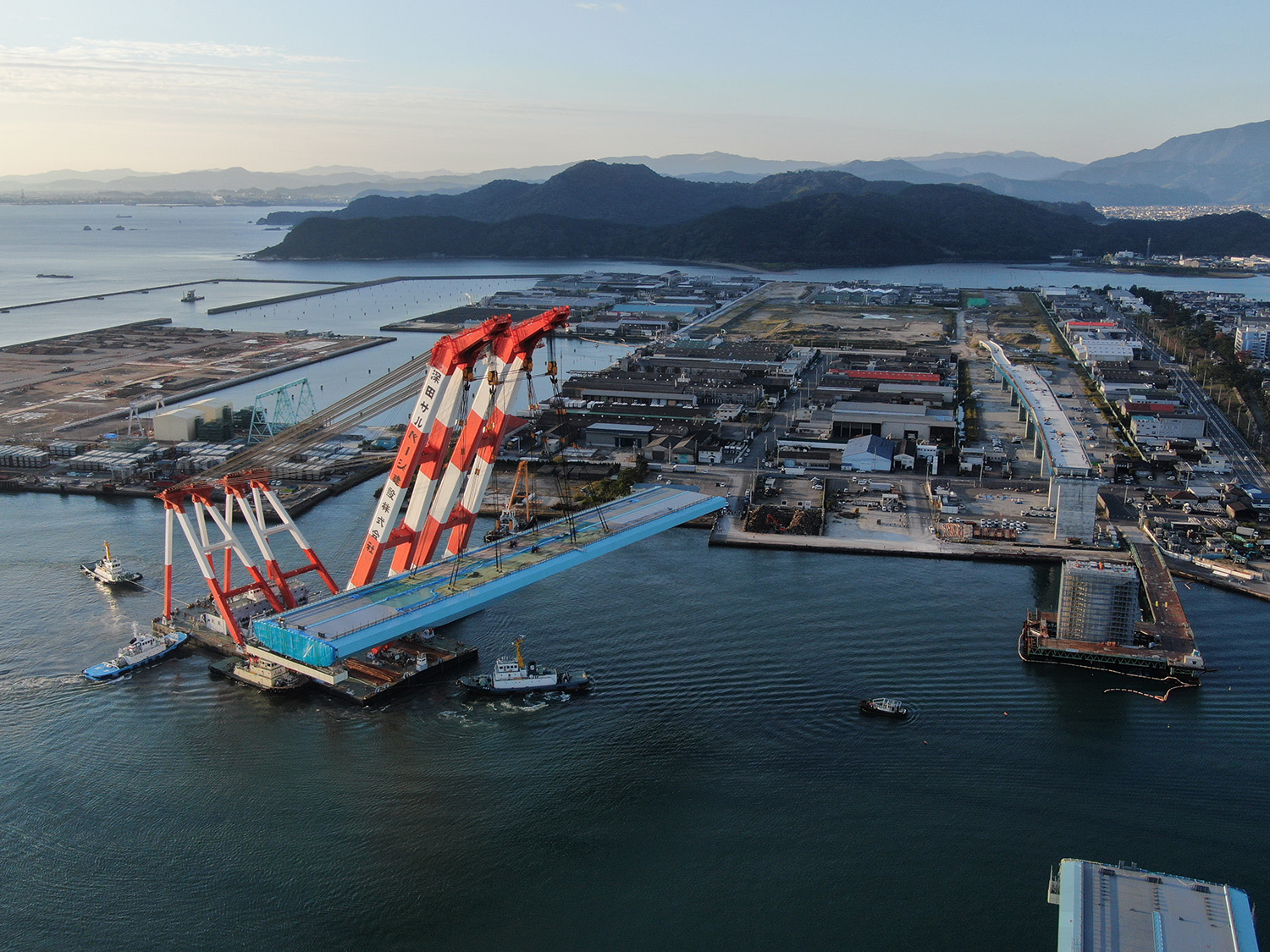元請は川田工業・横河ブリッジ・MMBJV。一次下請は架設工が深田サルベージ建設、河内橋梁。溶接工が島川工業。海上輸送工が大新土木。重機工が佐々木運輸機工。ジャッキ工が大瀧ジャッキ。防護柵製作・設置工が大久保産業。架設工の二次下請は寄神建設。