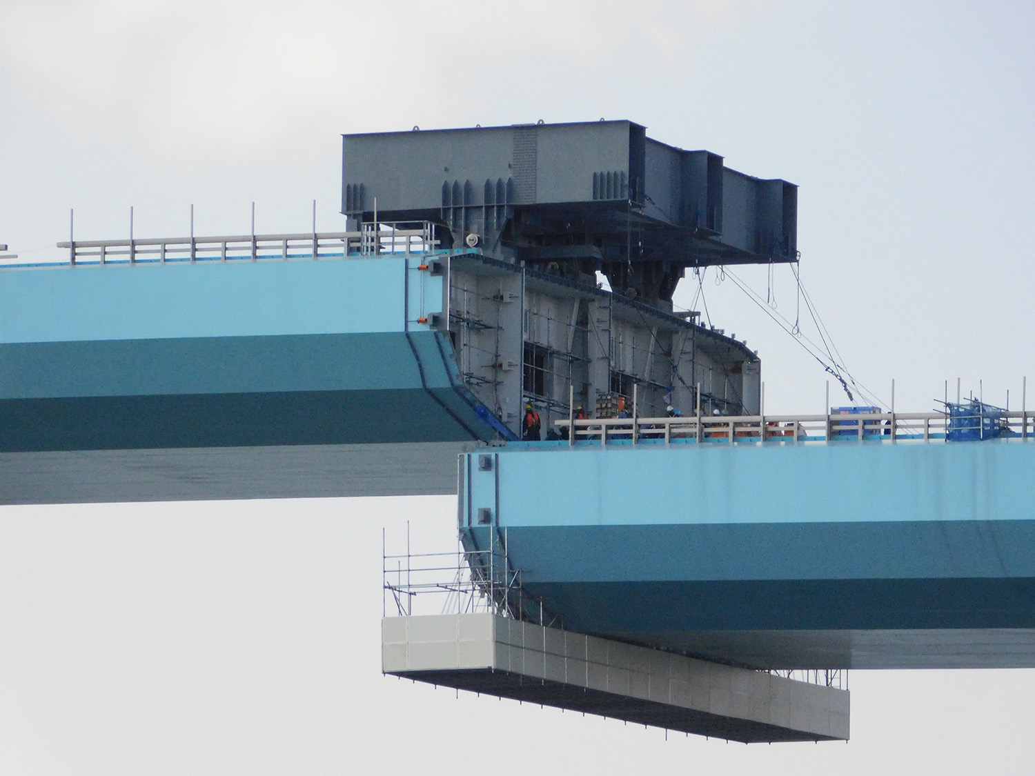 最終ブロックの架設は、右岸側のブロックを50mmセットバックして余裕を作り、左岸側は正規の位置として落とし込んだ。具体的には、左岸側はJ16、右岸側はJ25で左右両ブロックと閉合するが、J16側は架設用のエレクションピースを固定し、J25は50mmセットバックとして仮連結した。セットバックを片側のみ、しかも最小限としたことで、「施工後のセットフォーの作業量を減らす」(同JV)ことができる。さらに中央径間ブロックの落とし込み時は、「側径間の仕口は両端(中央径間との接続部)とも上に反り返る様に逆ハの字になっている。そこに中央径間を落とし込むわけだが、これは下に向かって反っているため「ハ」の字型になっている。落とし込み桁には300~400mmのたわみも生じており、この仕口と50mmのセットバック、さらにたわみによって生じた隙間(遊間)を利用して」(同JV)スムーズに架設することができた。