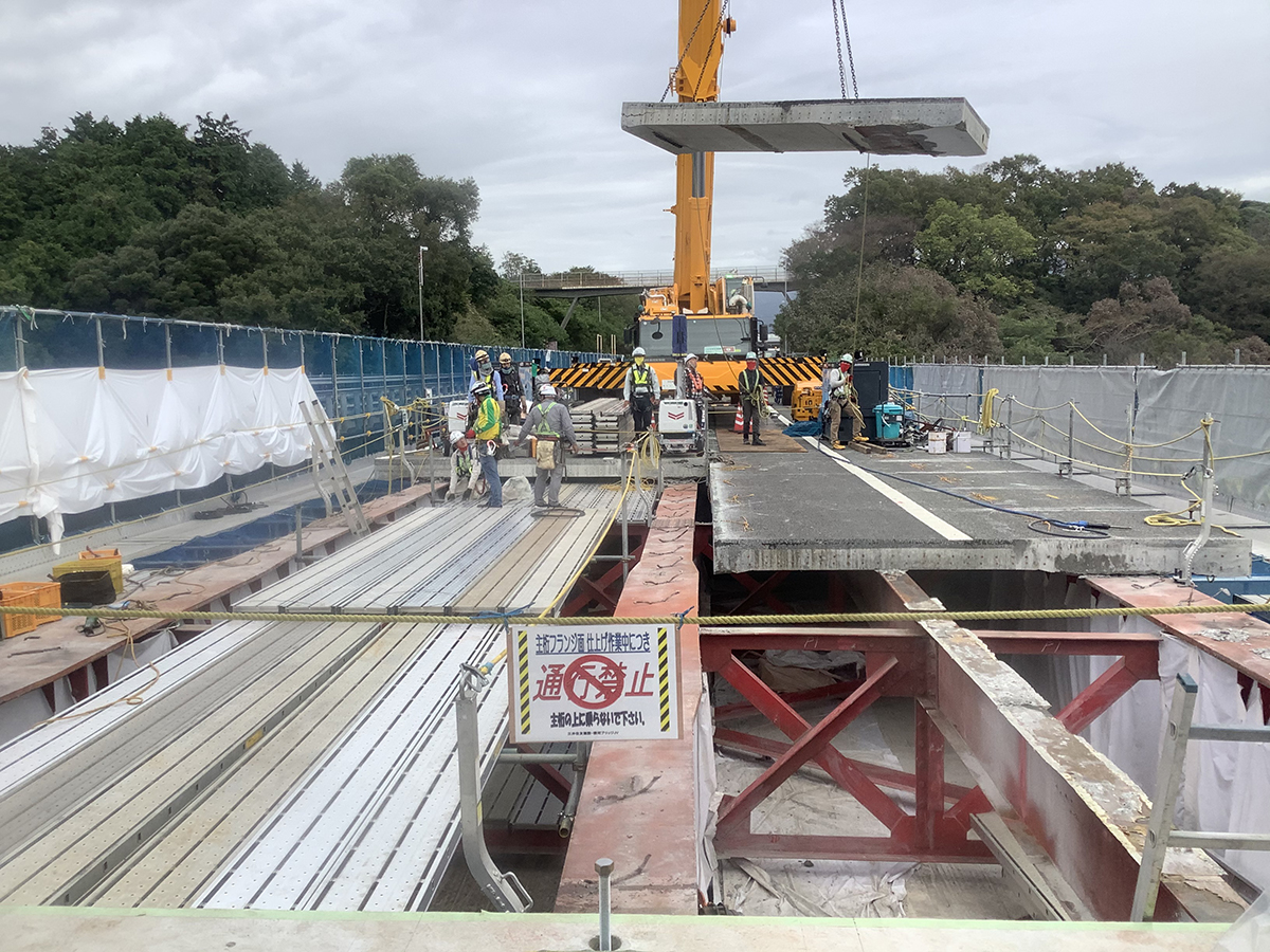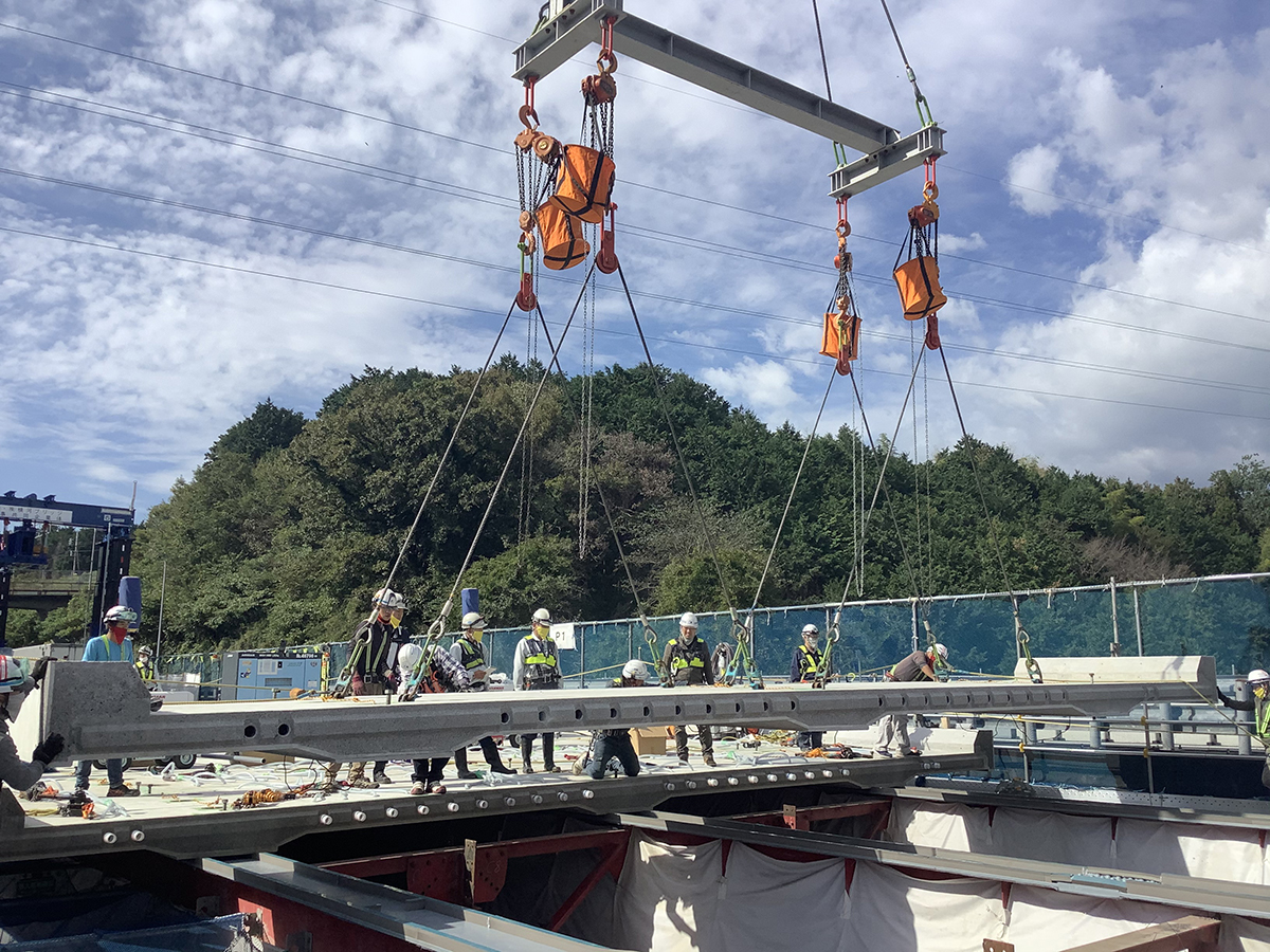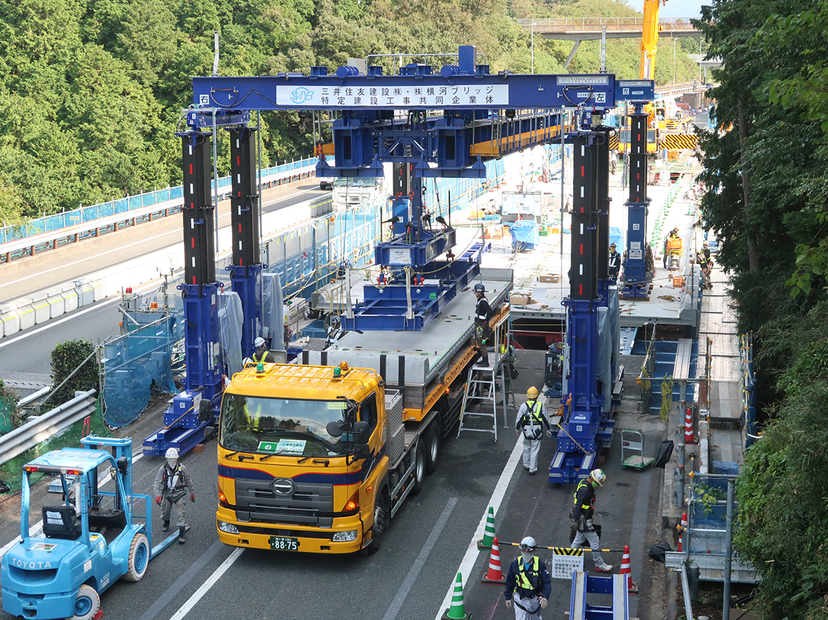 さらに、「天候の影響を受けないために予備日を工程のなかに入れなくてすむことに加えて、PC緊張済みの床版上に重機などが乗り入れることができるため、壁高欄の設置などの次工程を早く進めることができる」(元請の三井住友建設・横河ブリッジJV)ので、全体として工程短縮につながるという。