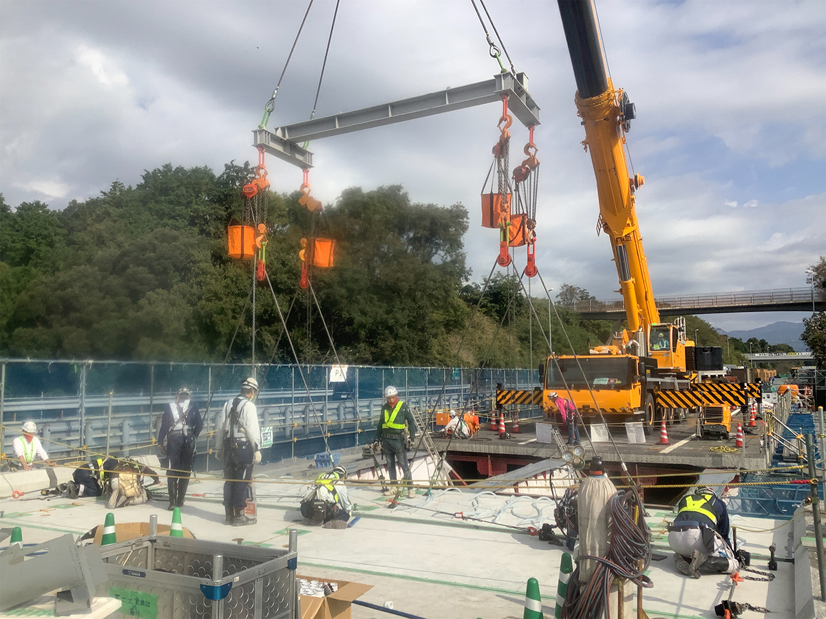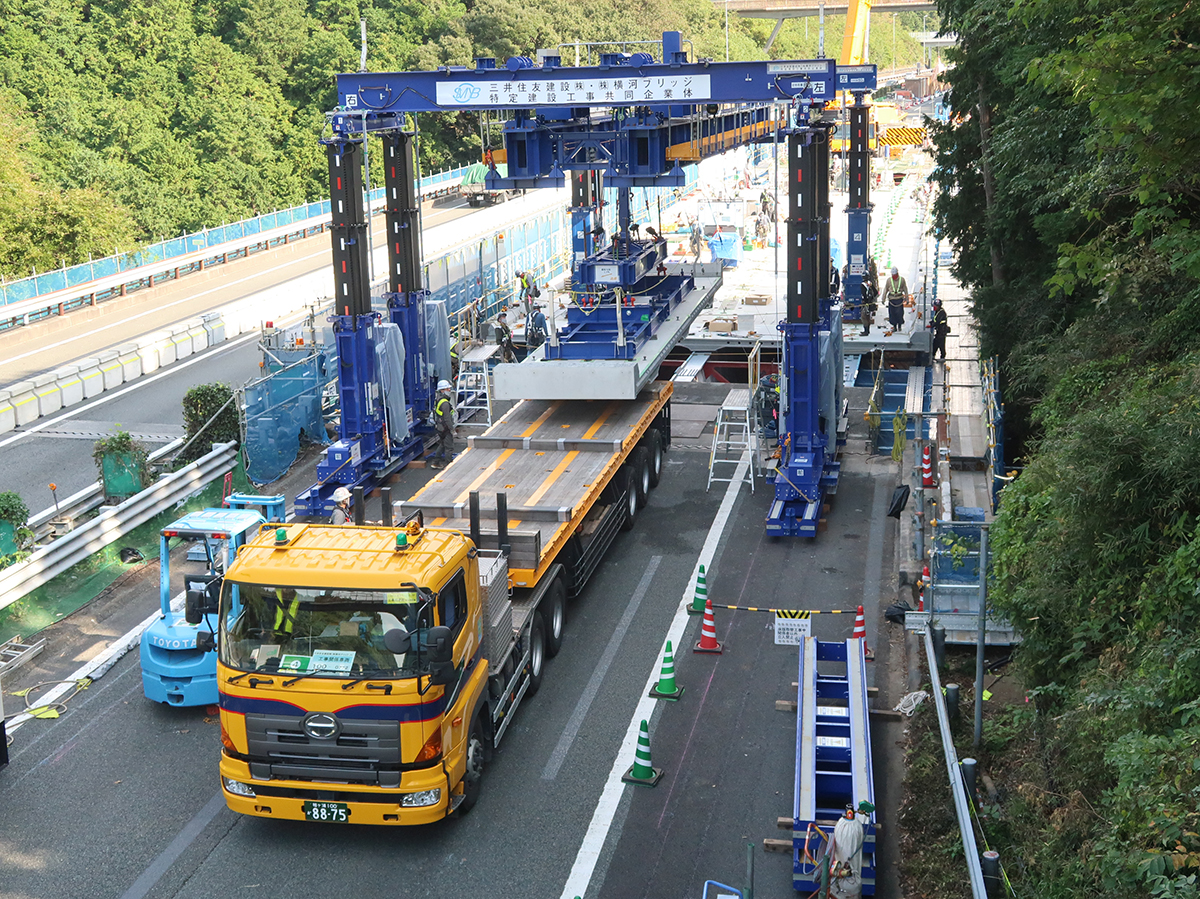 施工全般では「試験施工で課題を細部まで洗い出し、それを踏まえて作業をしているので問題はなかった。施工当初は床版3枚の架設に約3時間半かかったが、位置調整や引き込み時のタイミングなどの習熟度があがることにより(完了間近の時点では)2時間程度でできるようになった。また、低い位置で床版が動くので安心感があり危険も少ない」(元請の三井住友建設・横河ブリッジJV)という。