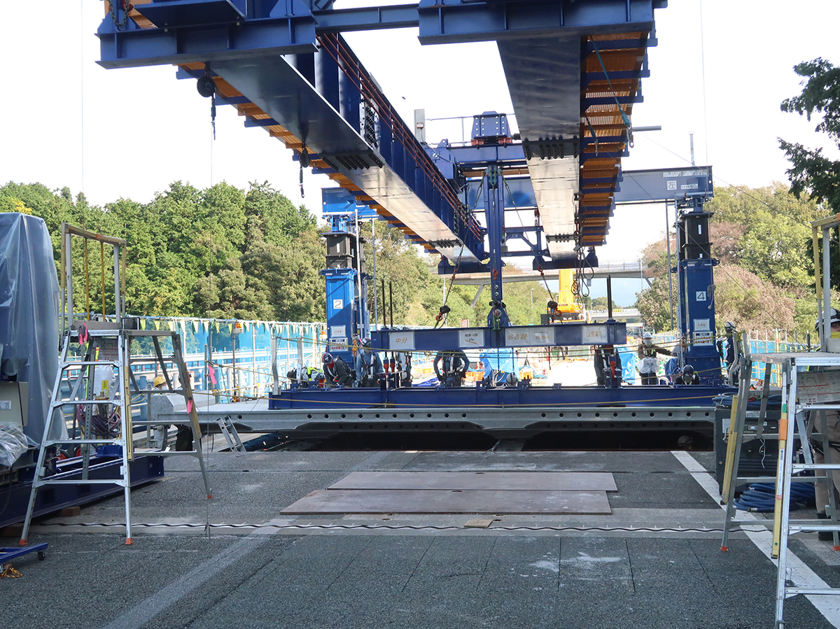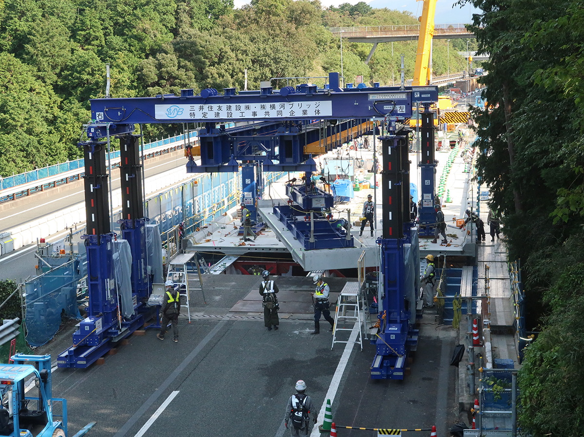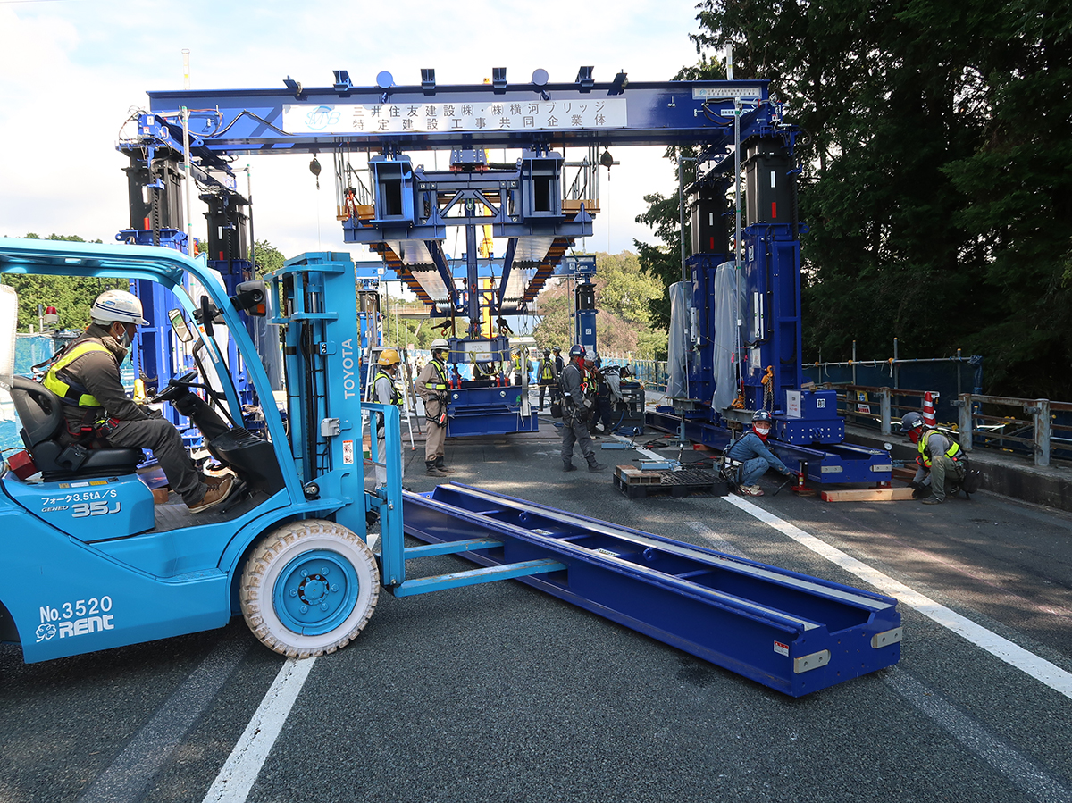 床版架設機について、NEXCO中日本東京支社は「本現場のような上空制限がある箇所や家屋が近接しているなどの制限がある箇所では安全に施工ができる」と評価した。