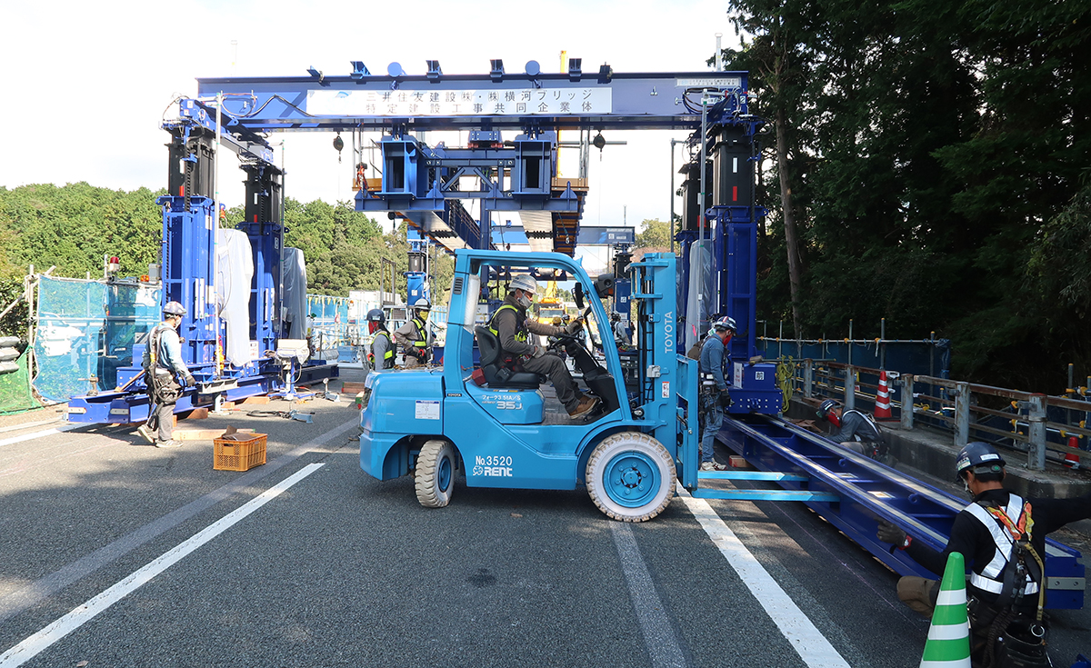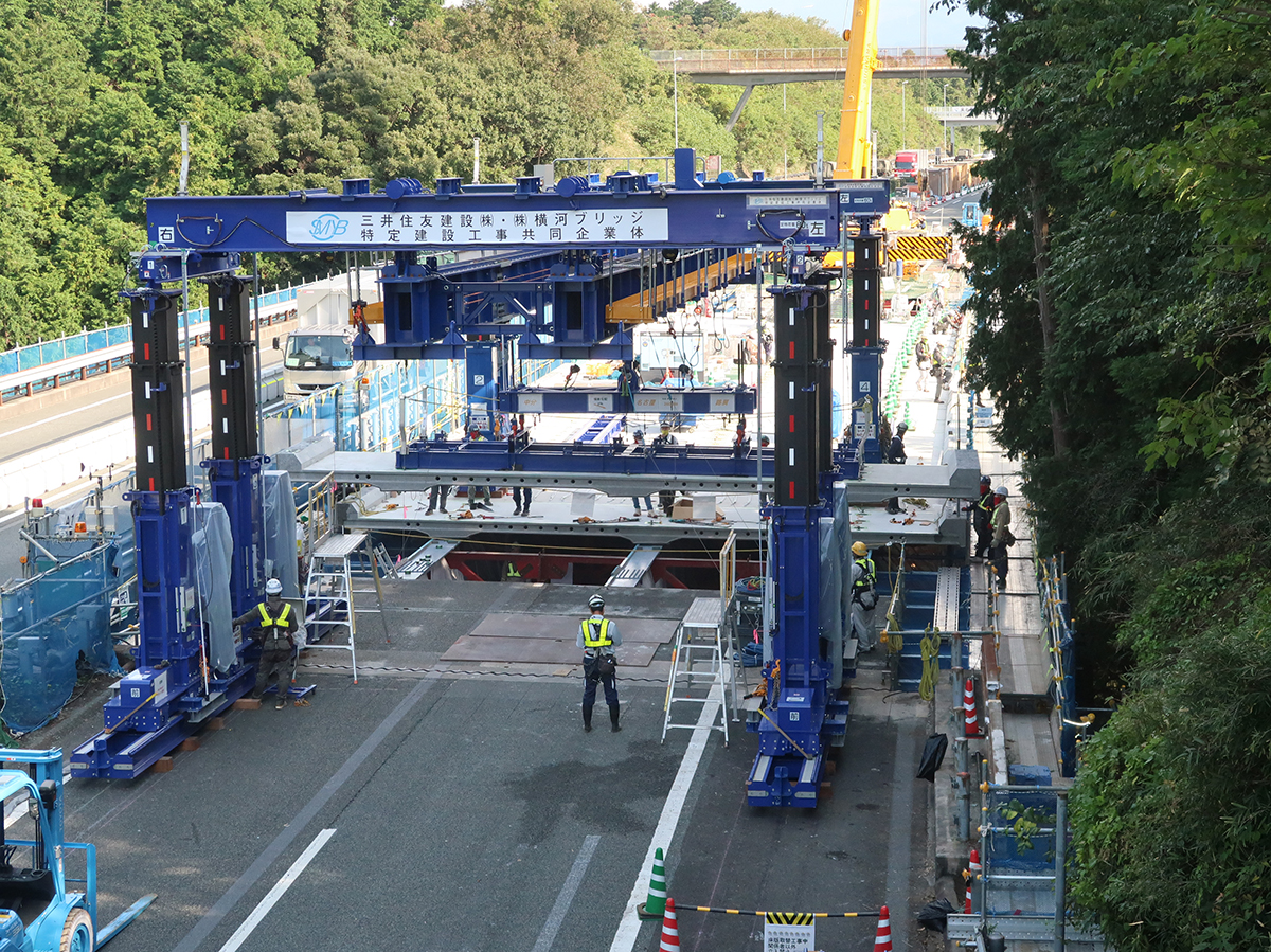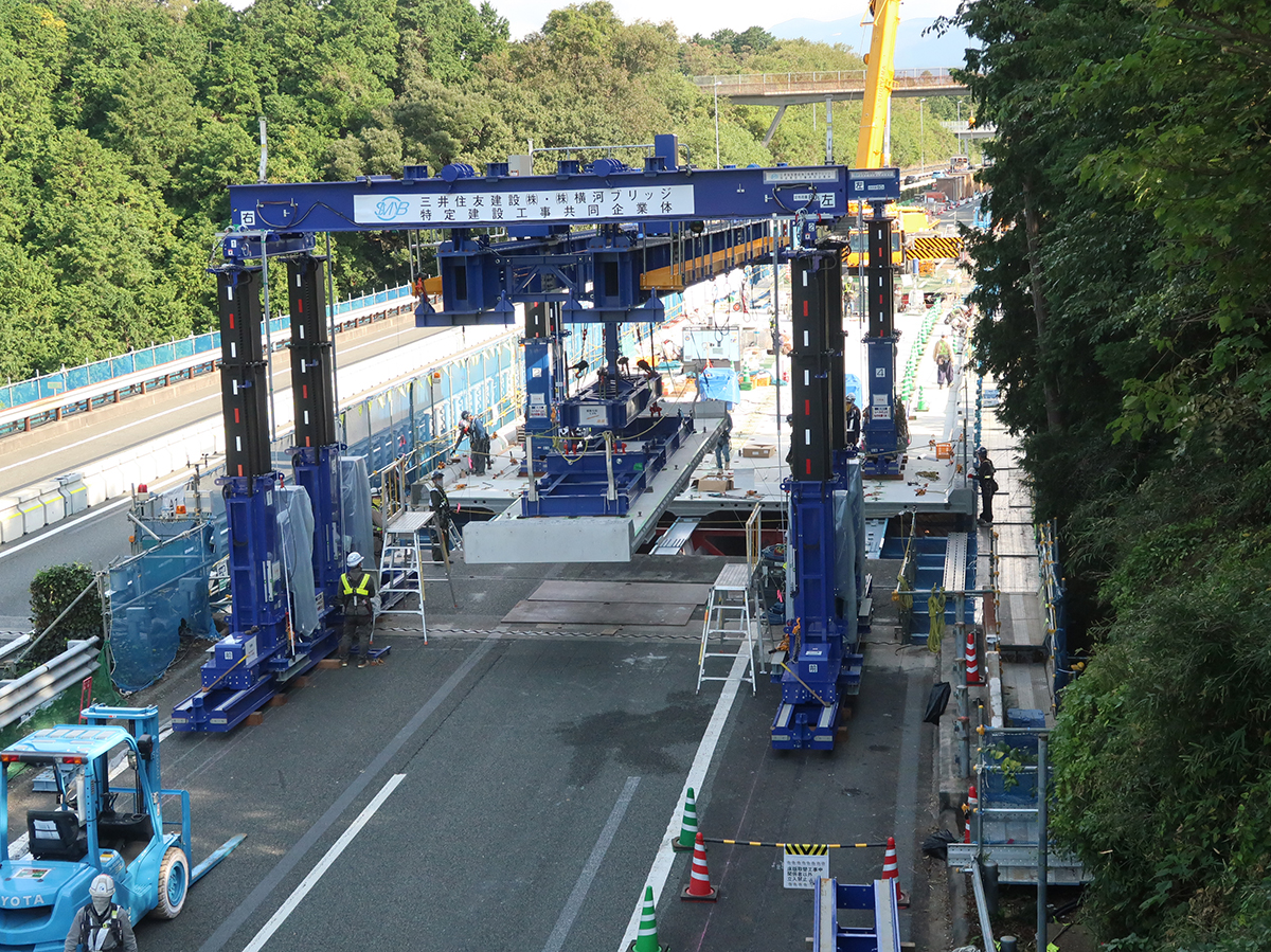 床版架設機について、NEXCO中日本東京支社は「本現場のような上空制限がある箇所や家屋が近接しているなどの制限がある箇所では安全に施工ができる」と評価した。
