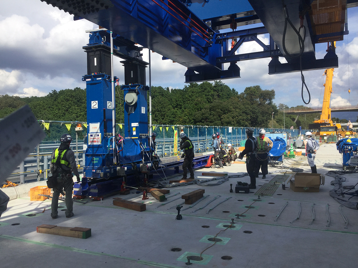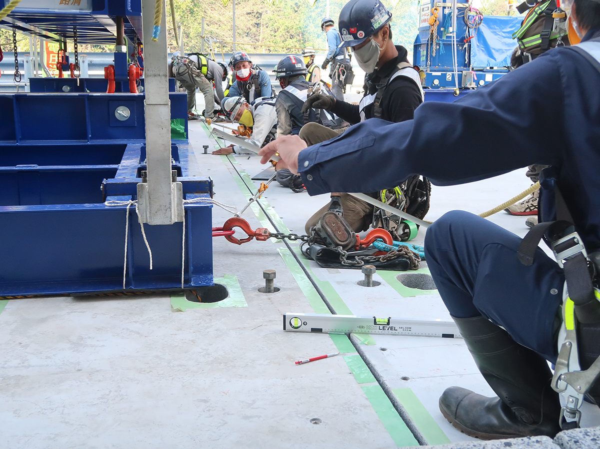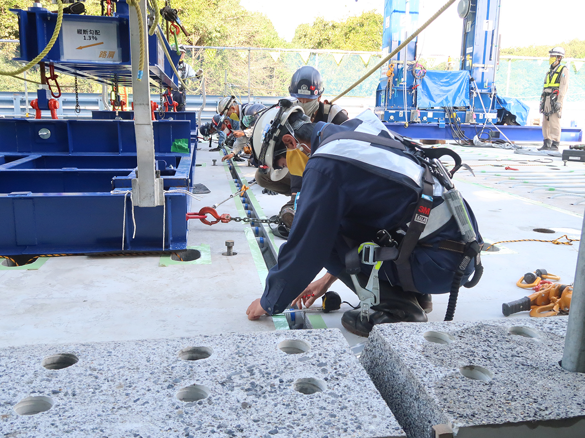 標準目地幅は10mmでシースの仕口合わせも行うことから、床版を所定位置に収める際には慎重な作業が要求された。1.3%の縦断勾配調整と2.0%の横断勾配調整を行いながら徐々に床版を下げていき、桁に床版が均等にタッチできることを確認したうえで架設済み床版側へと引き寄せている。橋軸直角方向の位置調整は吊り金具で左右それぞれ最大30cm可能となっており、架設機のリフターをミリ単位で上下左右に操作するとともに、レバーブロックを用いて人力での微調整を行った。