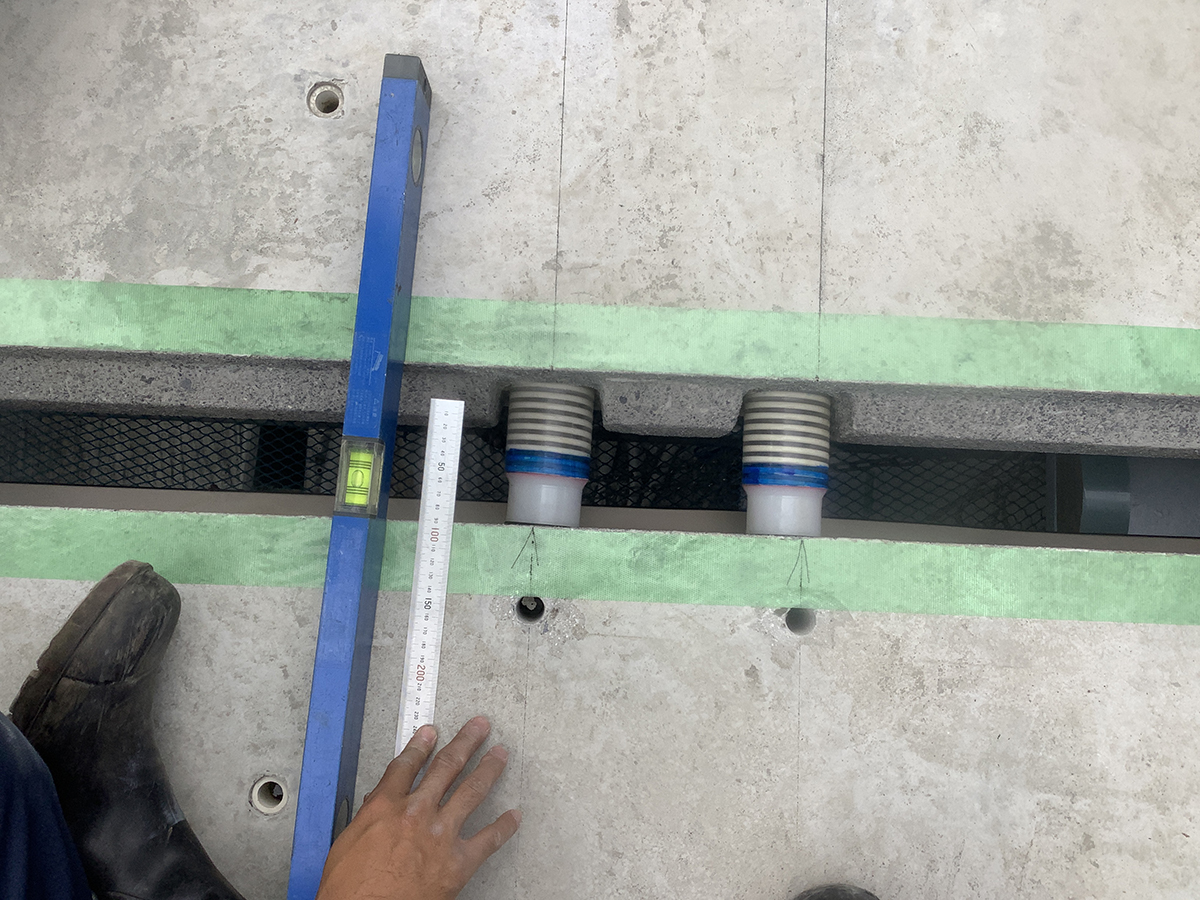 シースの仕口を合わせた後は、目地幅が10mmとなるようにレバーブロックでさらに引き寄せていく。その際、作業員が水平器で床版の高さ方向の確認を行うとともに、メジャーで橋軸直角方向各点の床版間幅を計測して均一に引き寄せられているかを何度も確認しながらミリ単位での作業を行った。
