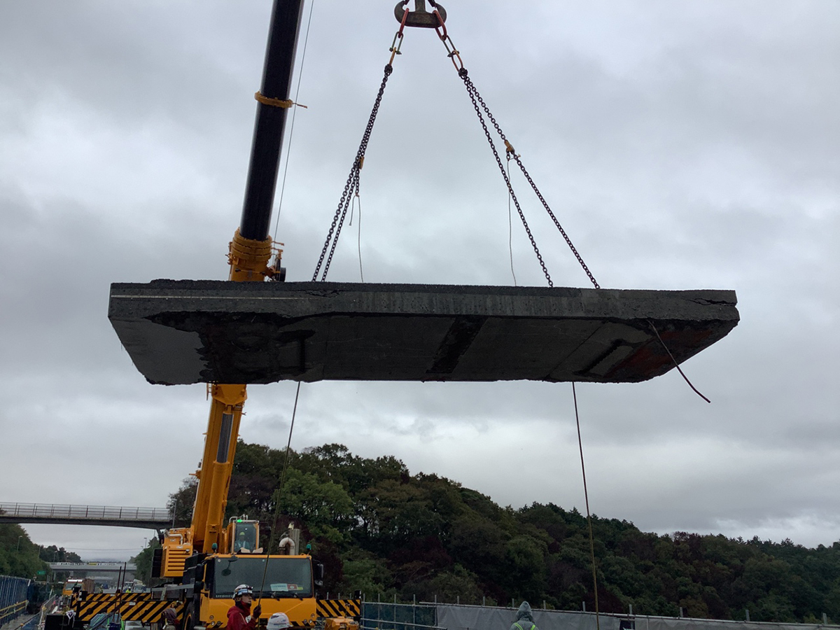 220t吊クレーンでの床版取替では1日あたり7枚(14ブロック)を撤去し、5~6枚を架設していった。本工事での架設総枚数は52枚で、そのうちの38枚をクレーンで施工している。P1近傍では高圧線との離隔に注意を払わなければならず、仕口合わせでの位置調整でも床版架設機での施工と同様に慎重な作業が要求された。