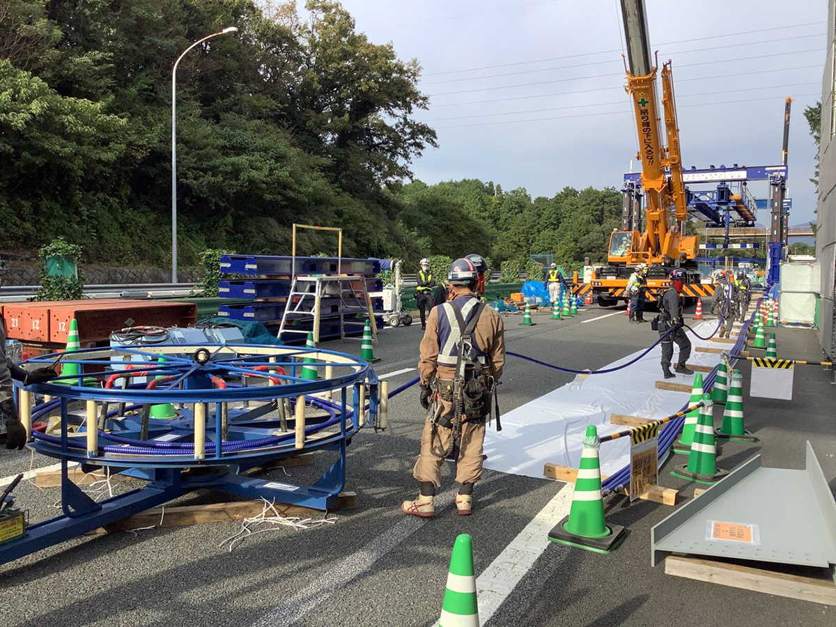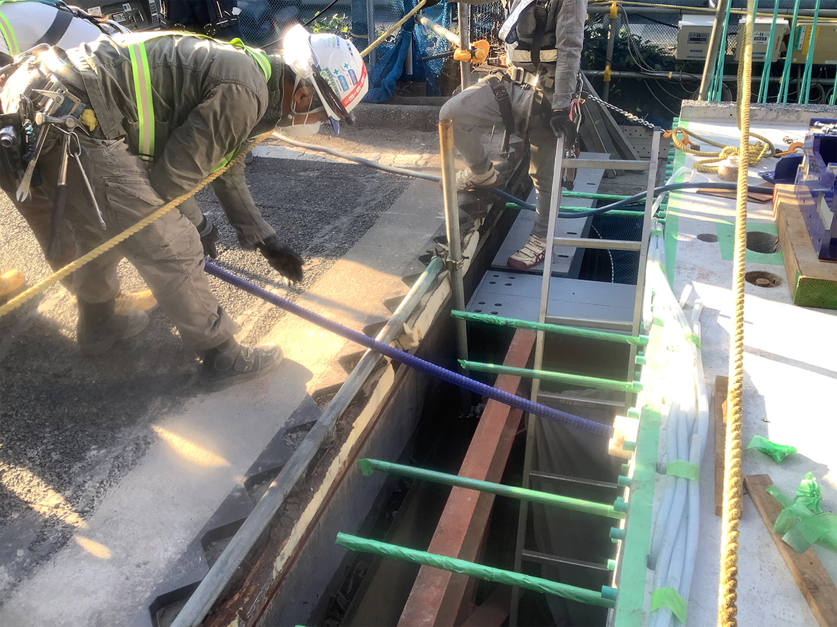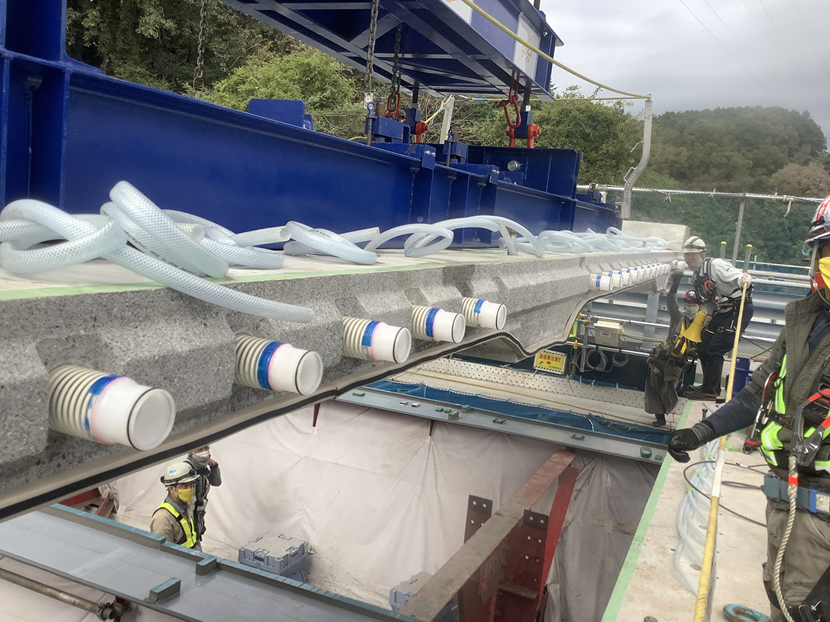 前述のとおり、床版間の接合は2方向PC構造を採用している。NEXCO中日本東京支社では2019年度冬施工の東名高速・下長窪橋(下り線)で2方向PC構造を採用しており、本現場が東京支社では2例目となる。採用理由は「天候による工程遅延リスク低減と接合部の疲労耐久性向上を図る」(NEXCO中日本東京支社)ためで、下長窪橋(下り瀬)工事では、ループ継手と比較して1日の作業時間の削減に寄与したという。