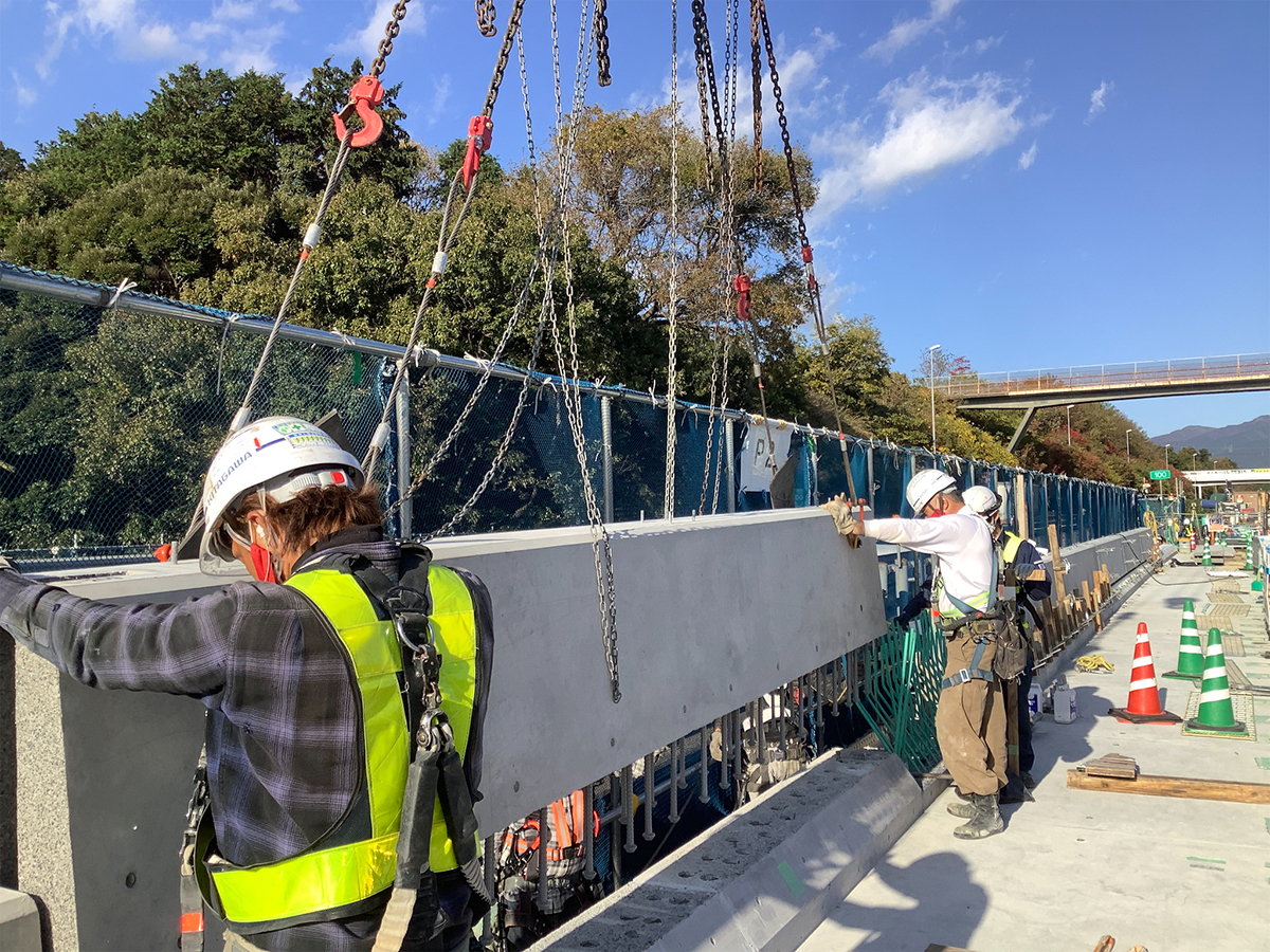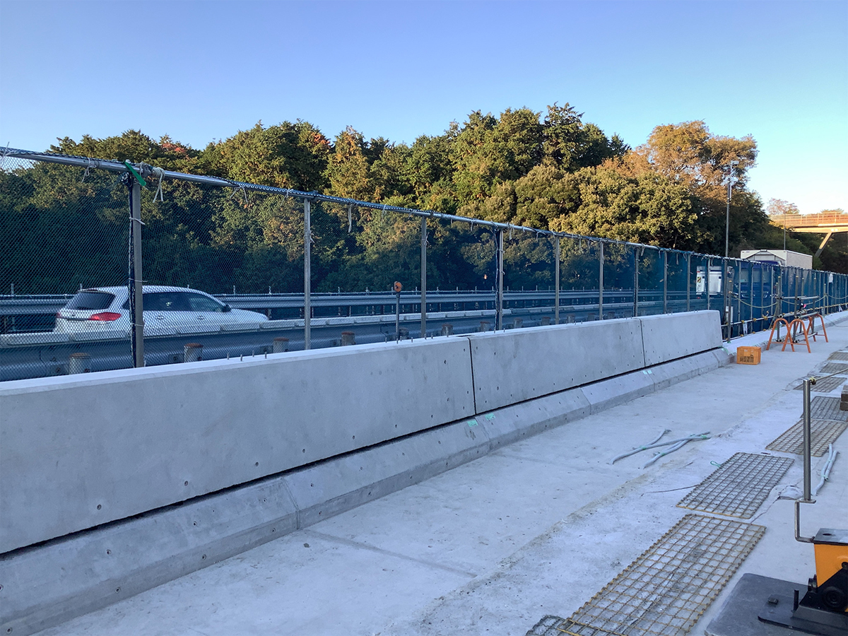 プレキャスト壁高欄「EQ-Wall」の設置。路肩側は通信管路6条に対応したものになっている