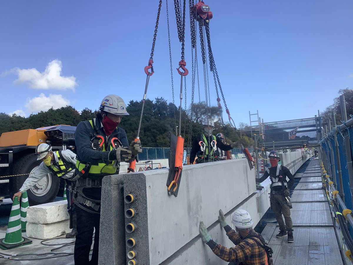 壁高欄は、三井住友建設が開発したプレキャスト壁高欄「EQ-Wall」を採用。1ブロックの延長は床版2枚分の4.8mで、PC緊張が完了した箇所から25t吊クレーンを用いて架設していった。場所打ち部は、伸縮装置部と壁高欄の伸縮目地がある支点上周りのみで、早強コンクリート(50N)で打設した。