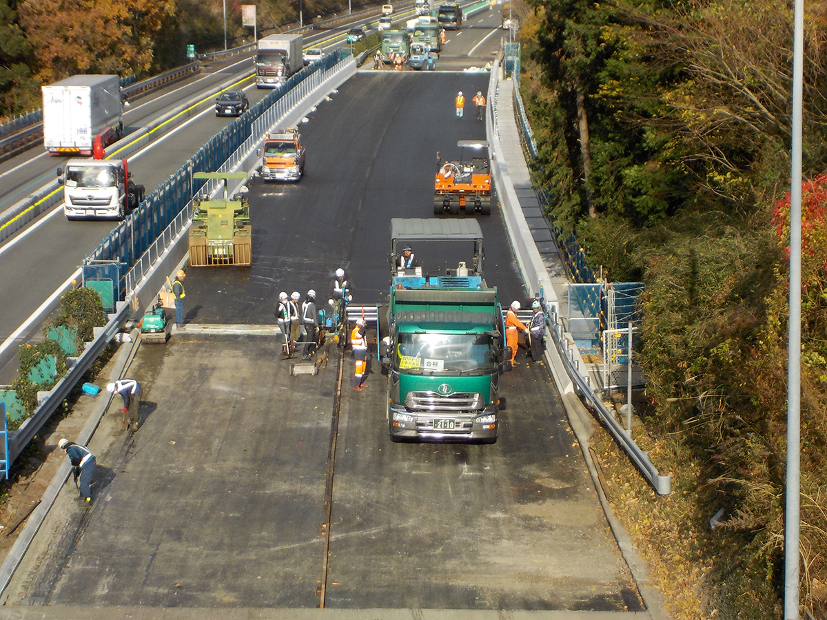 床版防水は高性能床版防水工法(グレードⅡ)を採用し、「ハイブリッドウレアNT2000」を用いて施工した。同工法は、日本特殊塗料と照見工業(施工も担当)が共同開発したものでウレアウレタンタイプの塗膜系防水層となっており、手塗り施工が可能で飛散防止が図れることが特徴となっている。舗装は、基層が橋梁レベリング層用混合物(FB13)、表層は高機能舗装Ⅰ型用混合物としている。採用足場は、パネル吊式足場「SKパネル」。