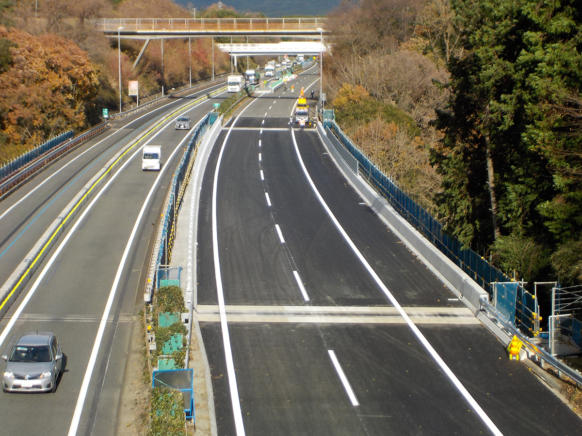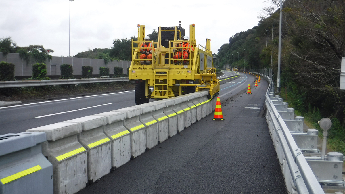 本工事にあたっての車線規制区間は約6km(対面通行規制4.5km)で、対面通行区間の仮設防護柵の設置にはロードジッパーシステムを活用している。規制開始前の約2カ月前から1基あたり延長1,000×高さ810×幅460mm、重量680kgのコンクリート製防護柵を走行車線規制で、1日あたり150~200m分を路肩に仮置き。対面通行規制開始にあわせて、防護柵切替用車両(BTM:Barrier Transfer Machine)を用いて路肩から中央に移動させた。BTMでは1時間あたり約5㎞の防護柵移動が可能(線形などにより多少異なる)で、今回は準備・後片づけも含め約4時間で作業を完了させた。
