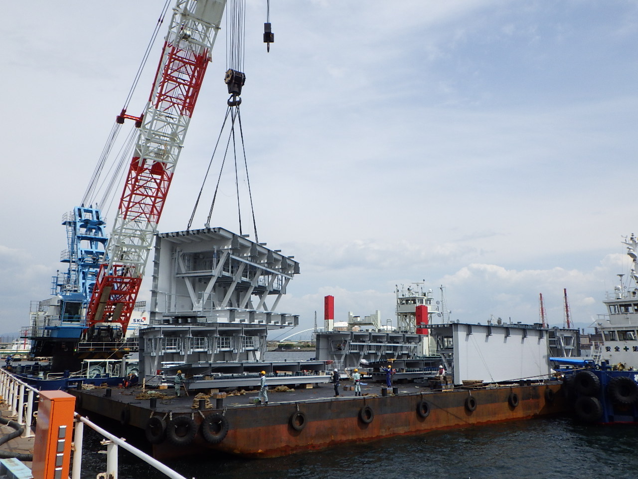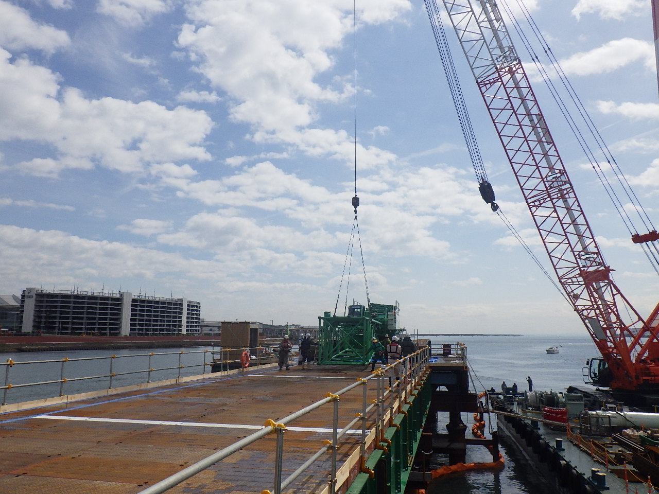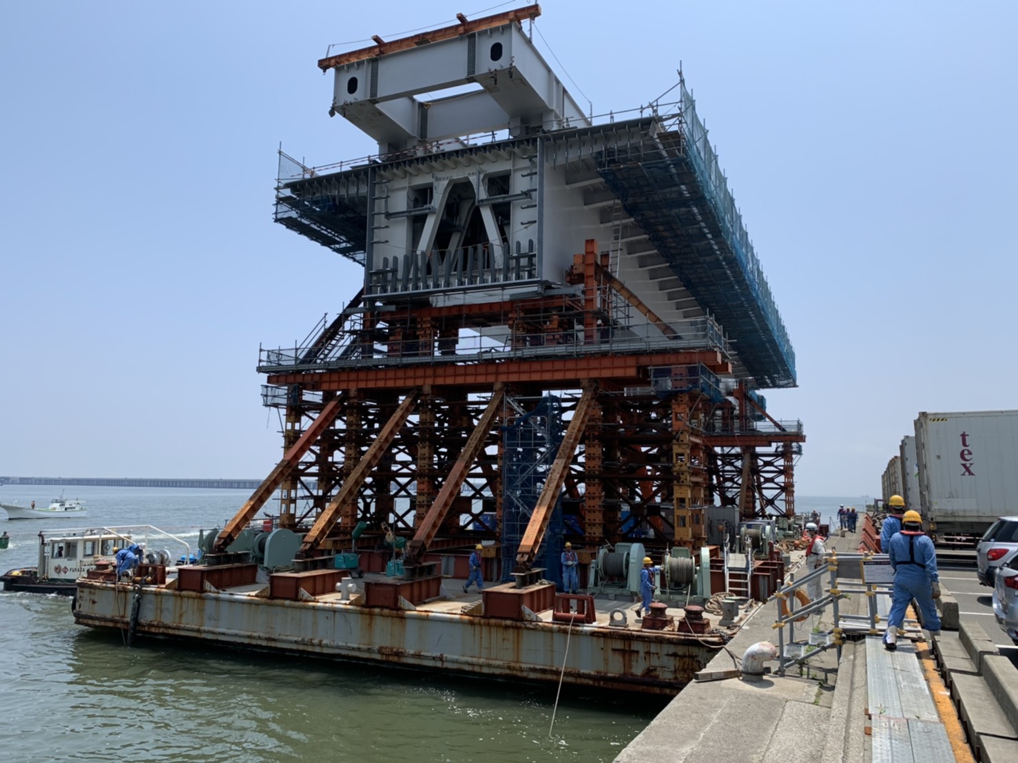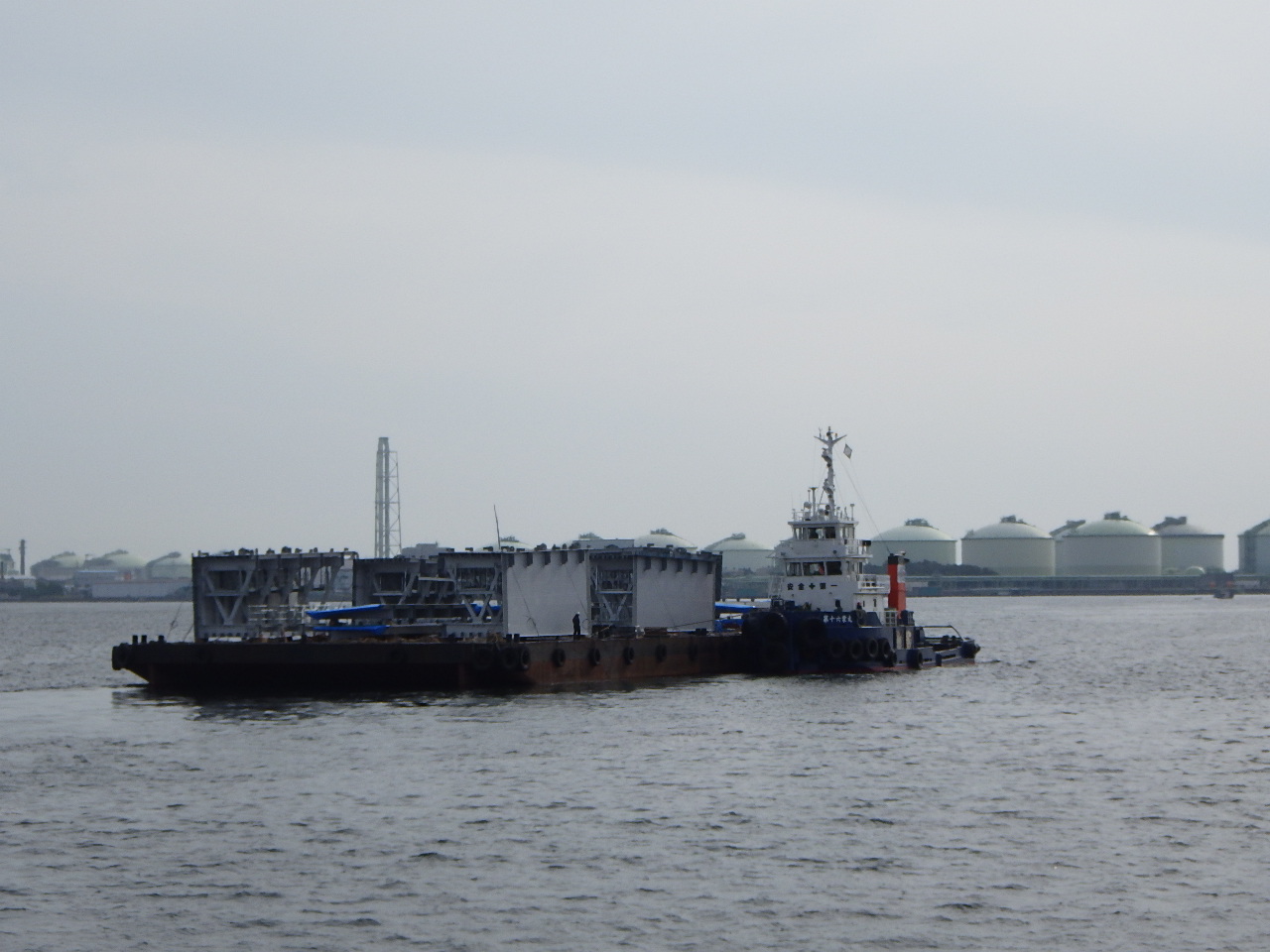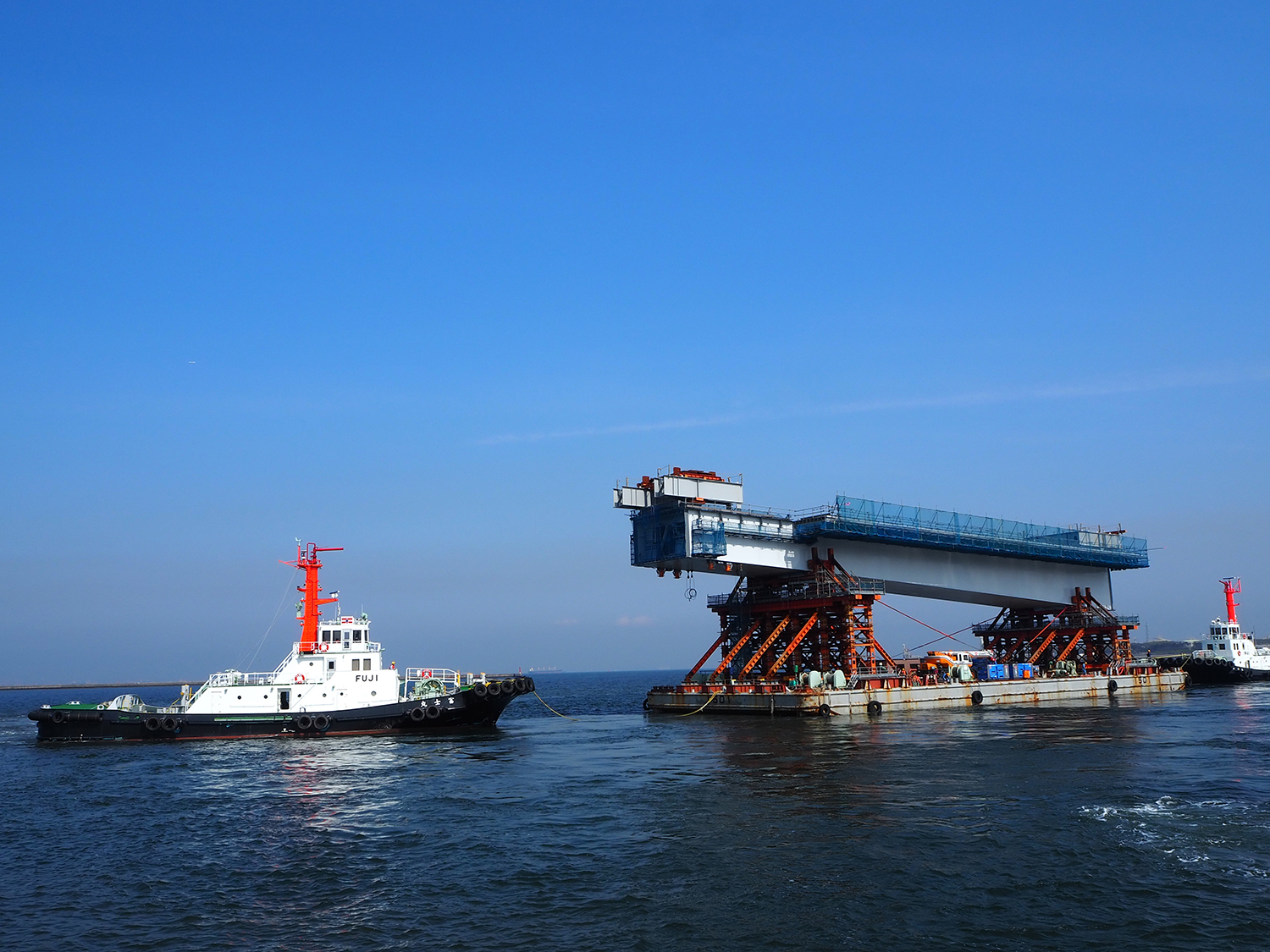 基本的に浜出し後、岸壁にてラッシングおよびサーベイを実施、半日かけて曳航し、浮島にある日本物流の岸壁に停泊後、一時間かけて現場近くまで曳航し、潮位が有利になる時間を待って架設することを繰り返した。