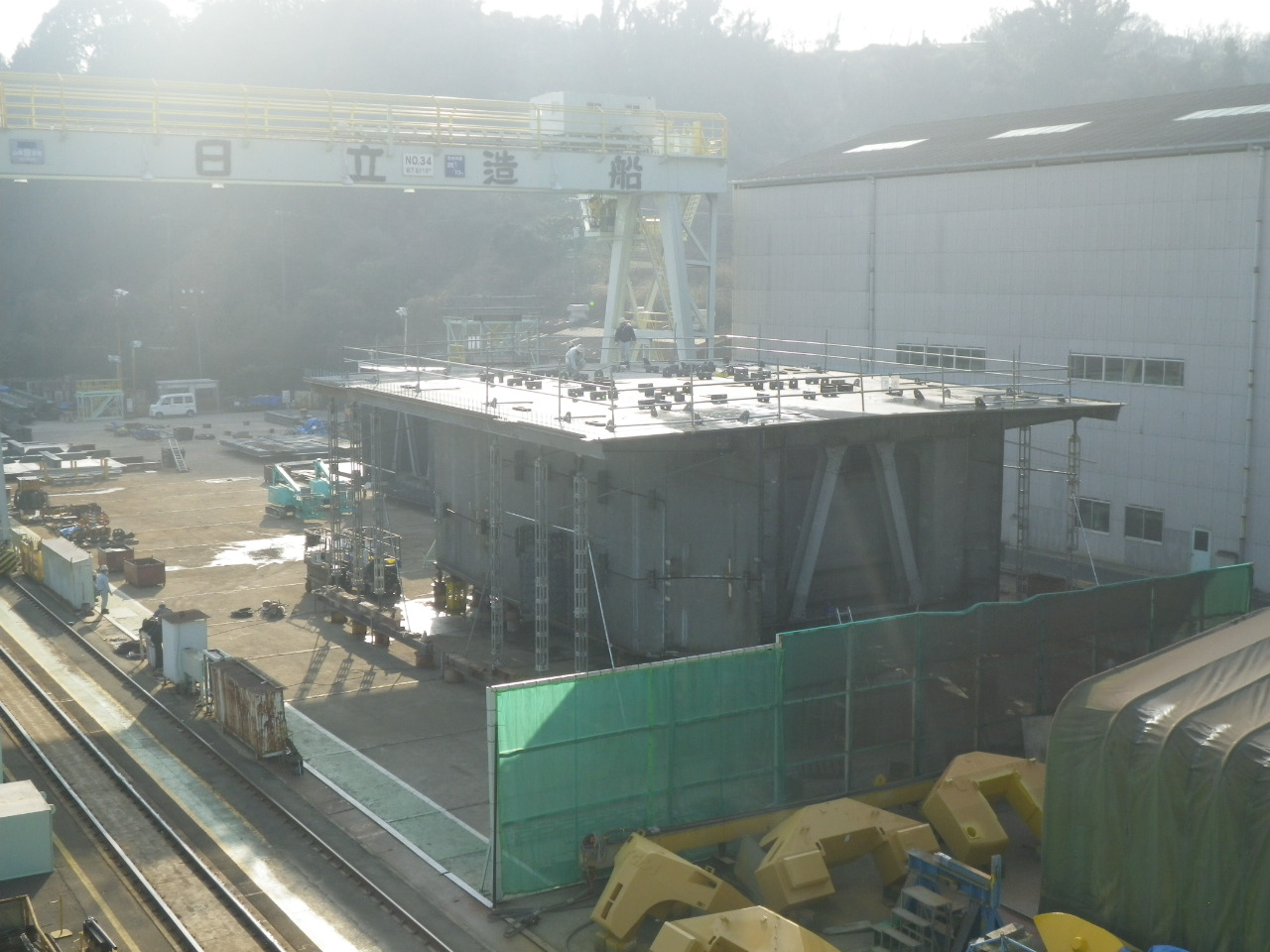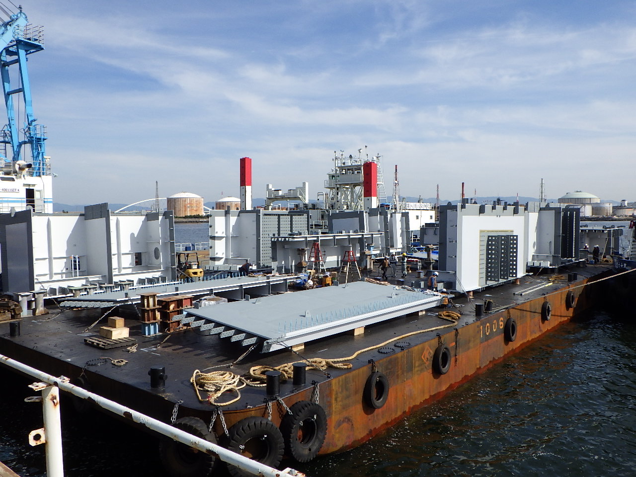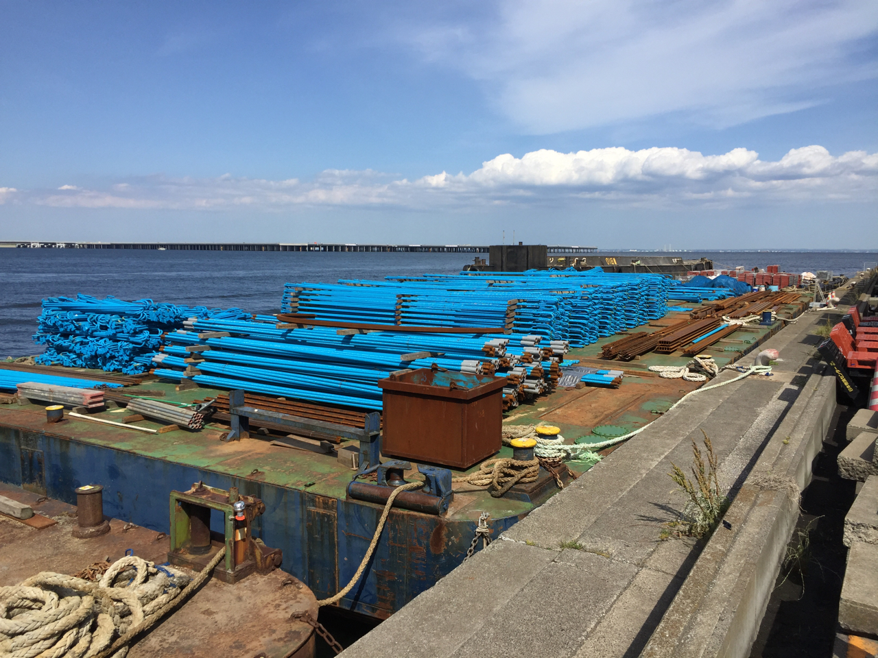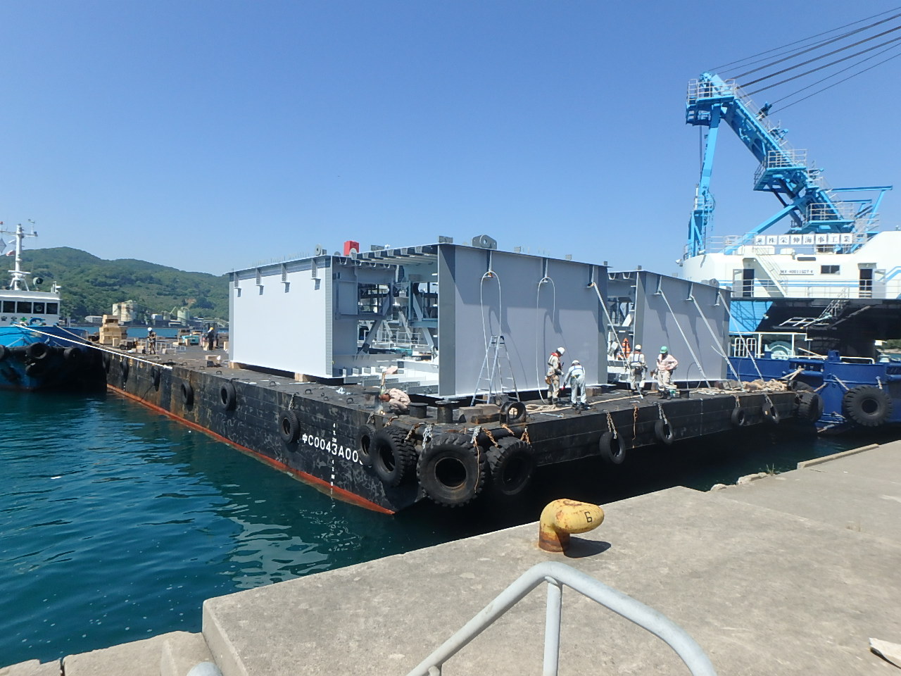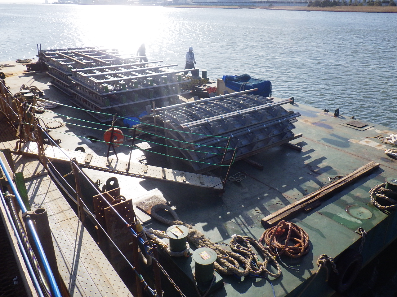 基本的に浜出し後、岸壁にてラッシングおよびサーベイを実施、半日かけて曳航し、浮島にある日本物流の岸壁に停泊後、一時間かけて現場近くまで曳航し、潮位が有利になる時間を待って架設することを繰り返した。