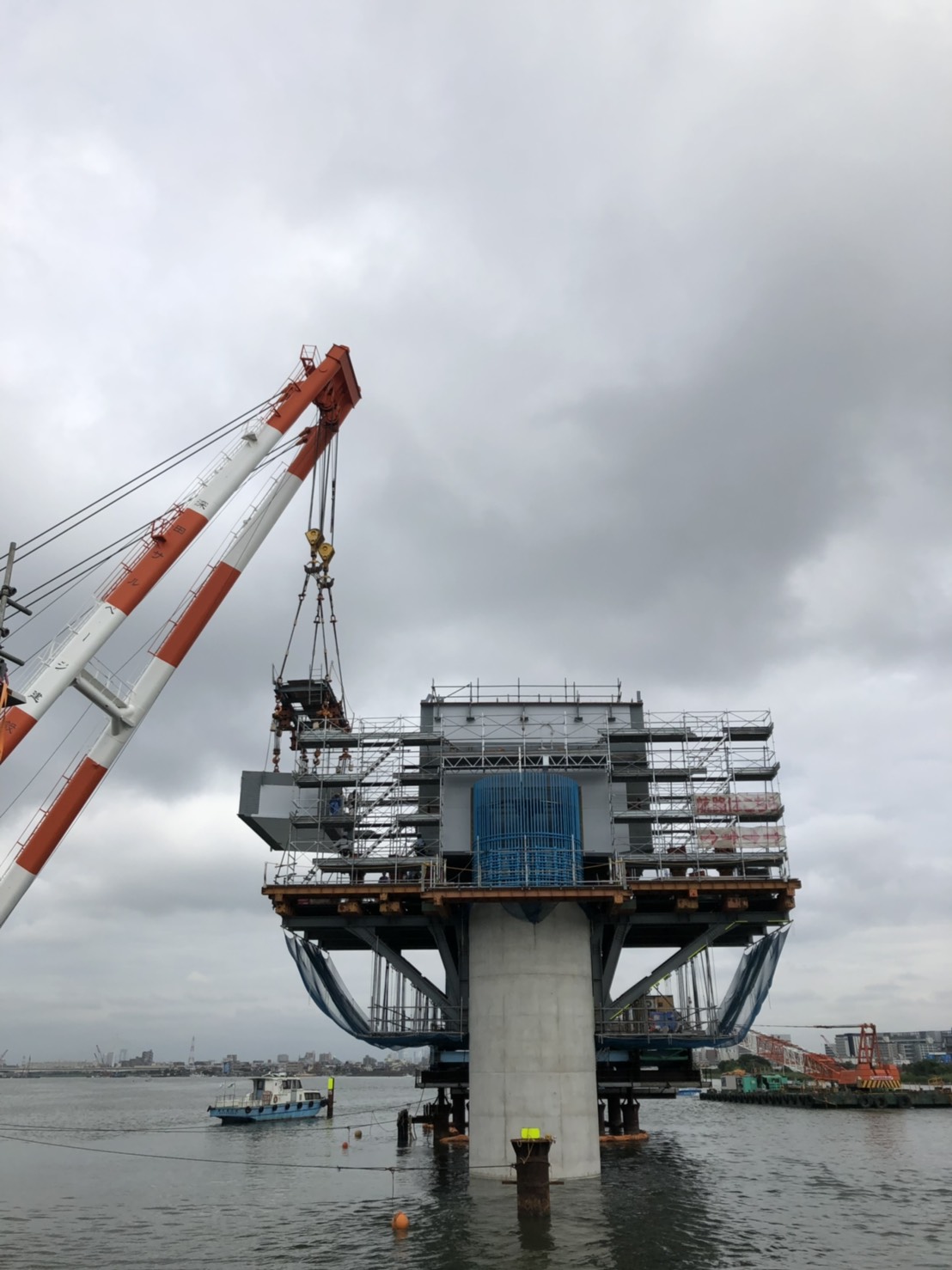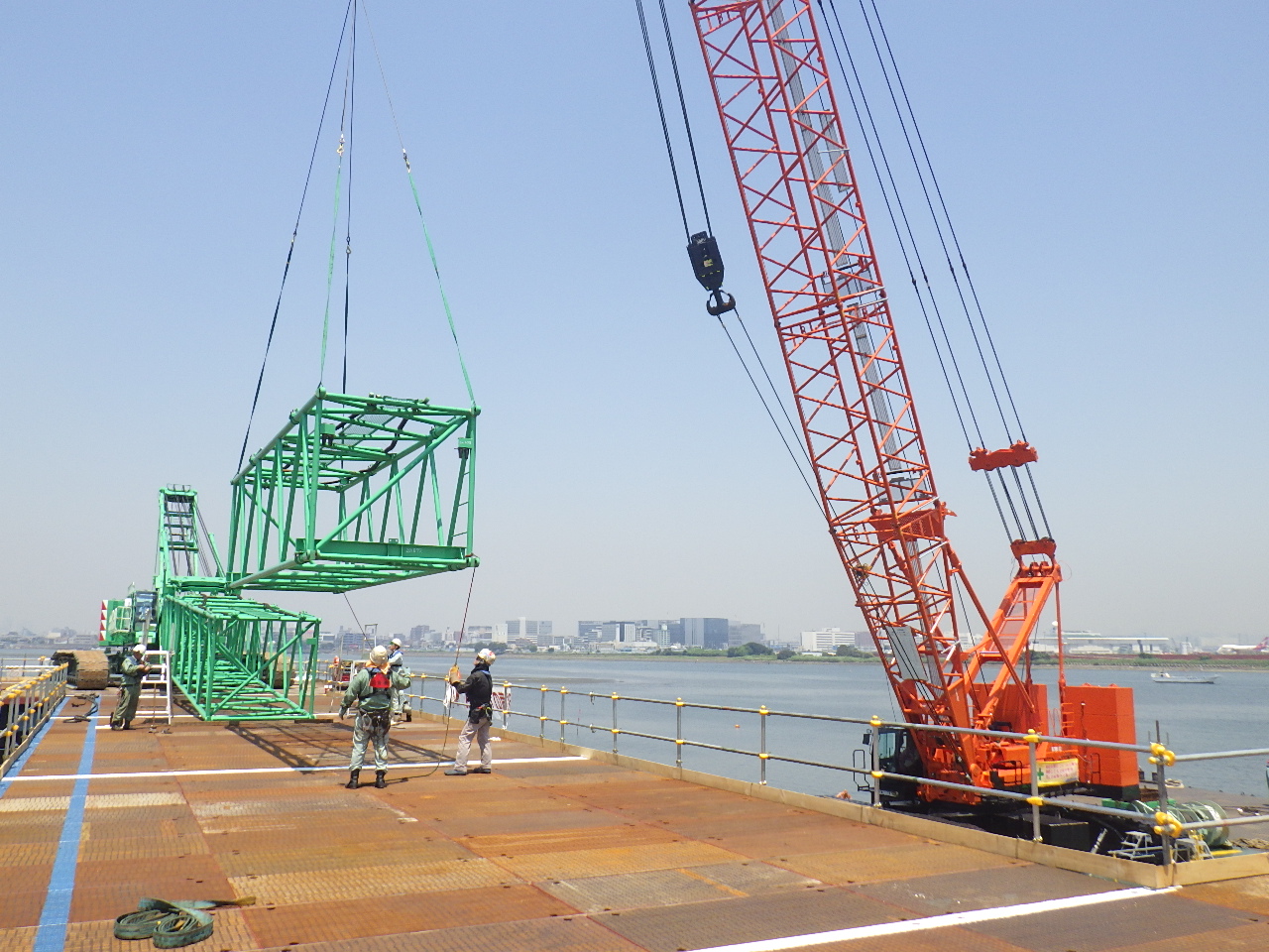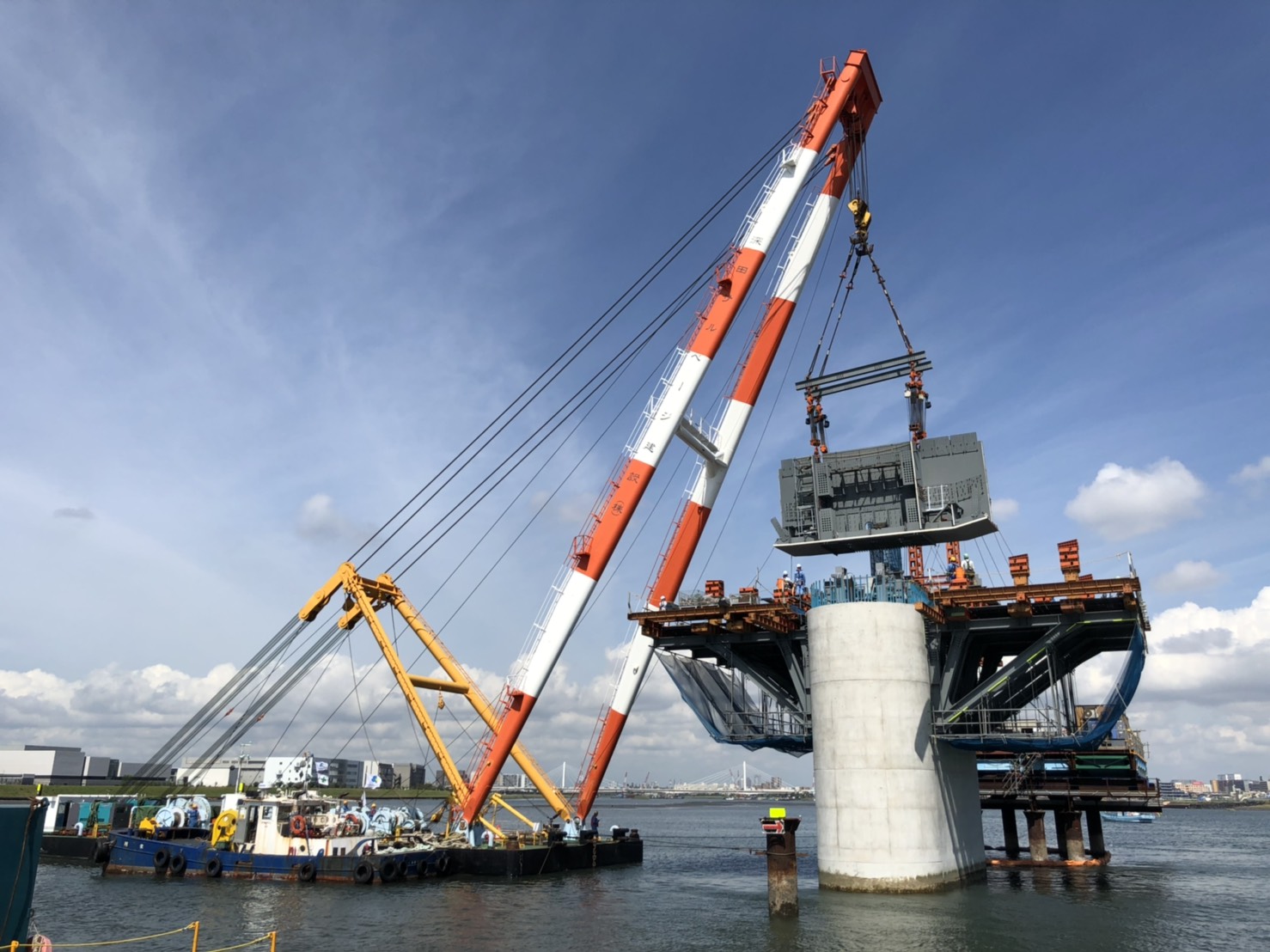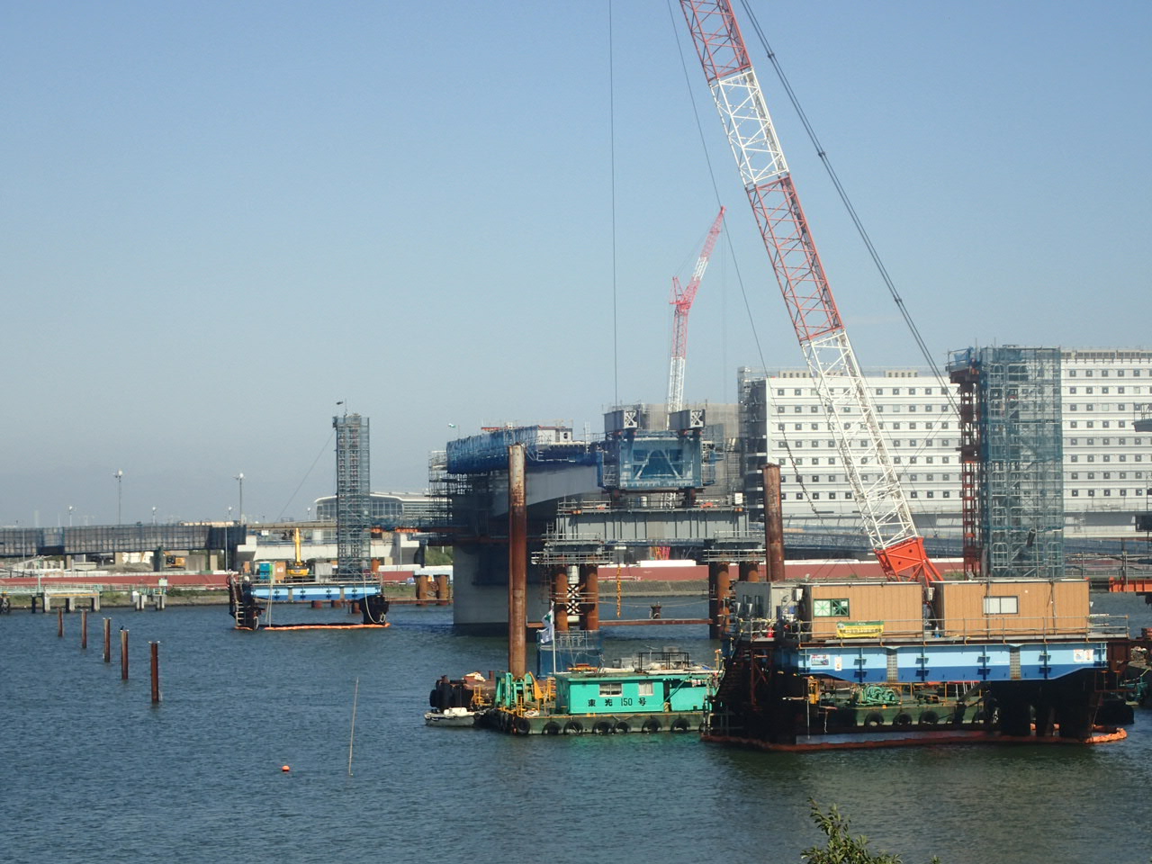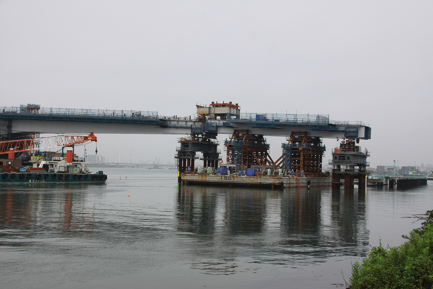 そのため、柱頭部はクレーン付き台船と120tFC船によるクレーン架設、予め浚渫によって水深を確保した河川部は大ブロック架設、側径間部は羽田側が台船で架設した桁からP5上まで650t・mトラベラクレーンによる張出架設、殿町側は生態系保持空間の真上に位置するため、径間の真ん中までは650t・mトラベラクレーンを用いて張出架設し、P2側(殿町川陸上部)から送り出し架設して空中で閉合する。架設順序は、中央径間を先行し、その後側径間部については、羽田側はさらに大ブロック架設を行い、最後の都道環状8号線を跨ぐ部分を含む70m強については、環状8号線を夜間通行止めとした上でトラベラクレーンにより張出架設する。