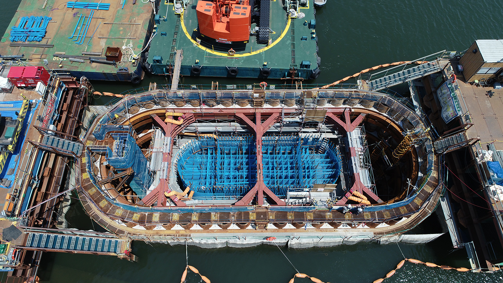 第5ブロックを積んだ台船がベント間に進入していく(右写真以外、井手迫瑞樹撮影)