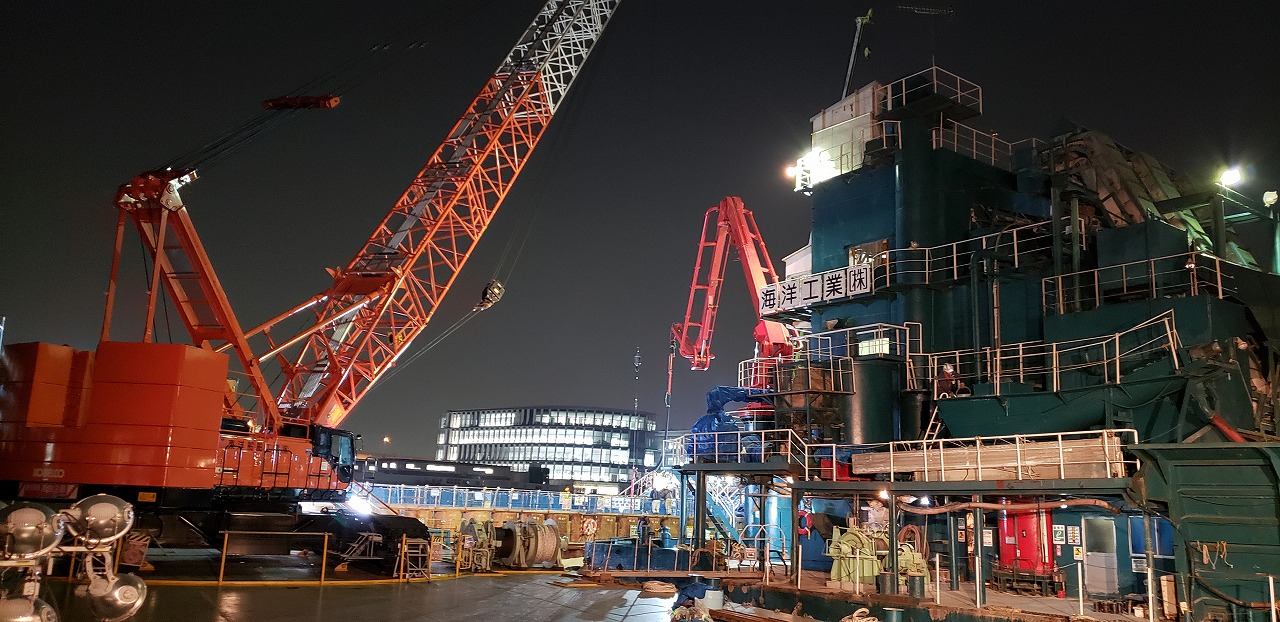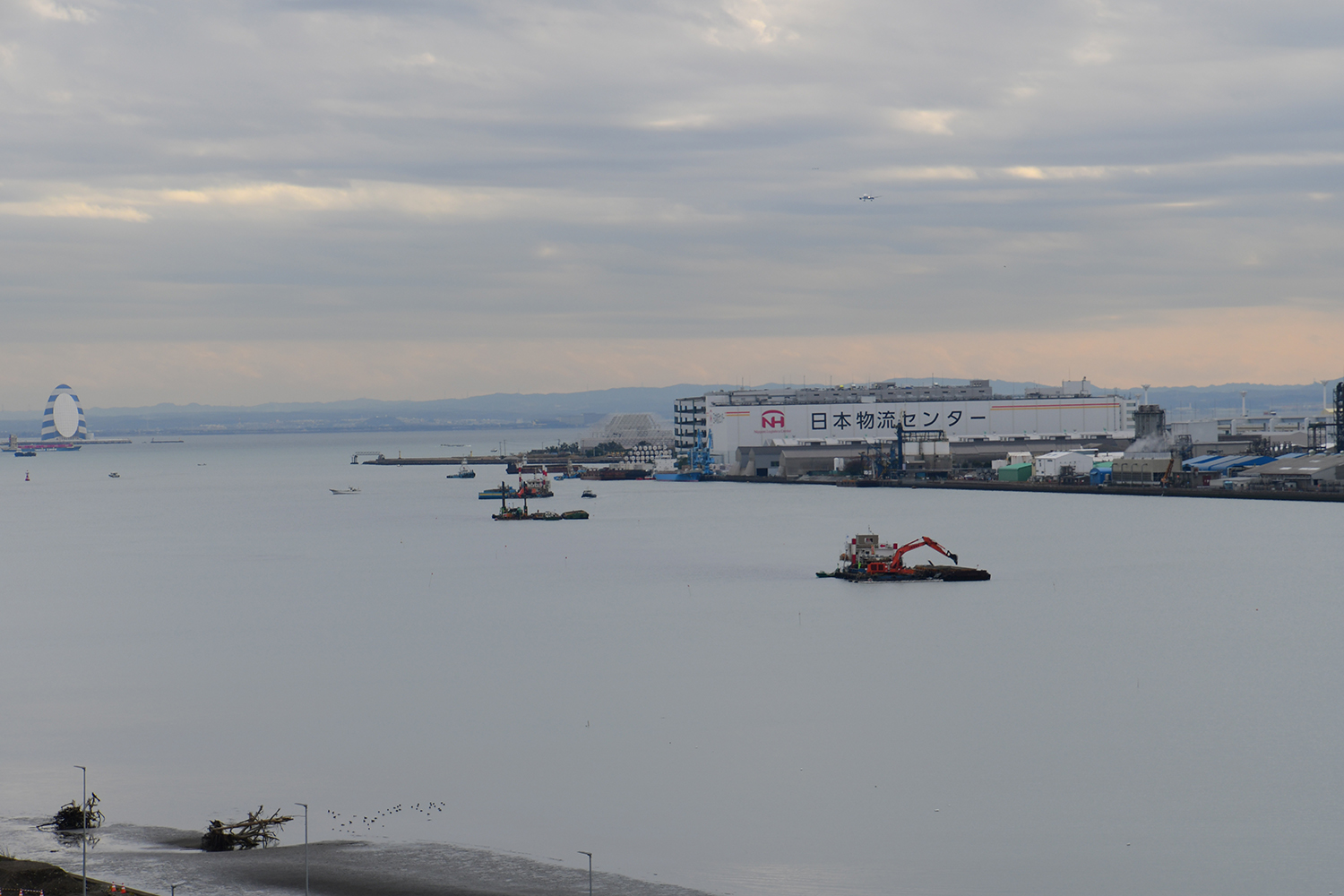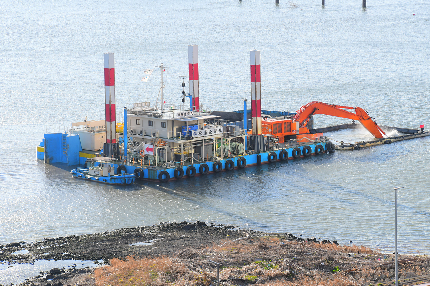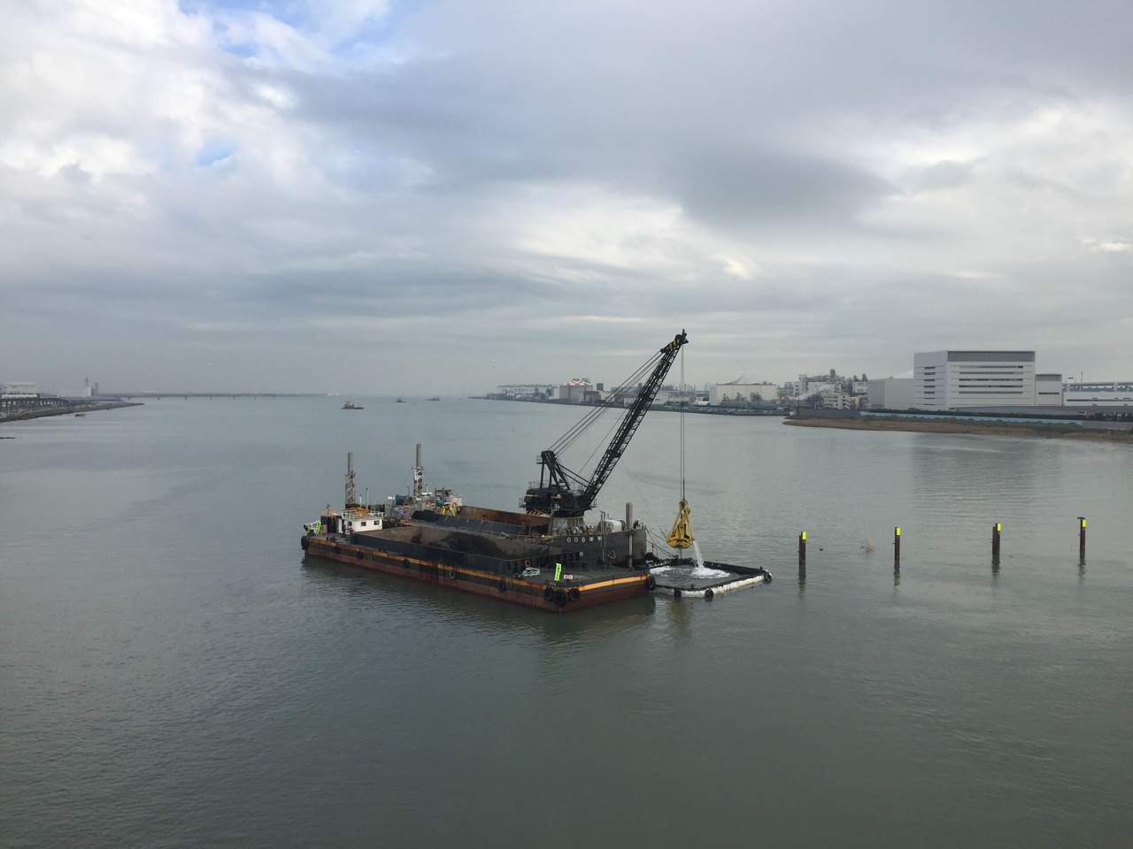 しかし、そこはマリコン大手である五洋建設が親になっているJVである。はるばる九州の長崎から空いているバックホウ船やガッドバージ船を手配すると共に、土運船についても広島など中国地方から確保してきた。最終的には総計5船団(1船団=バックホウ船1隻+土運船2隻)を集めた。細長く大きな船舶を入れがたい航路部はバックホウ船で浚渫し、面的に広く確保する必要があるP3、P4周りはガッドバージ船および100t起重機船を入れて、ドレッジャーバケットを用いて迅速に浚渫した。