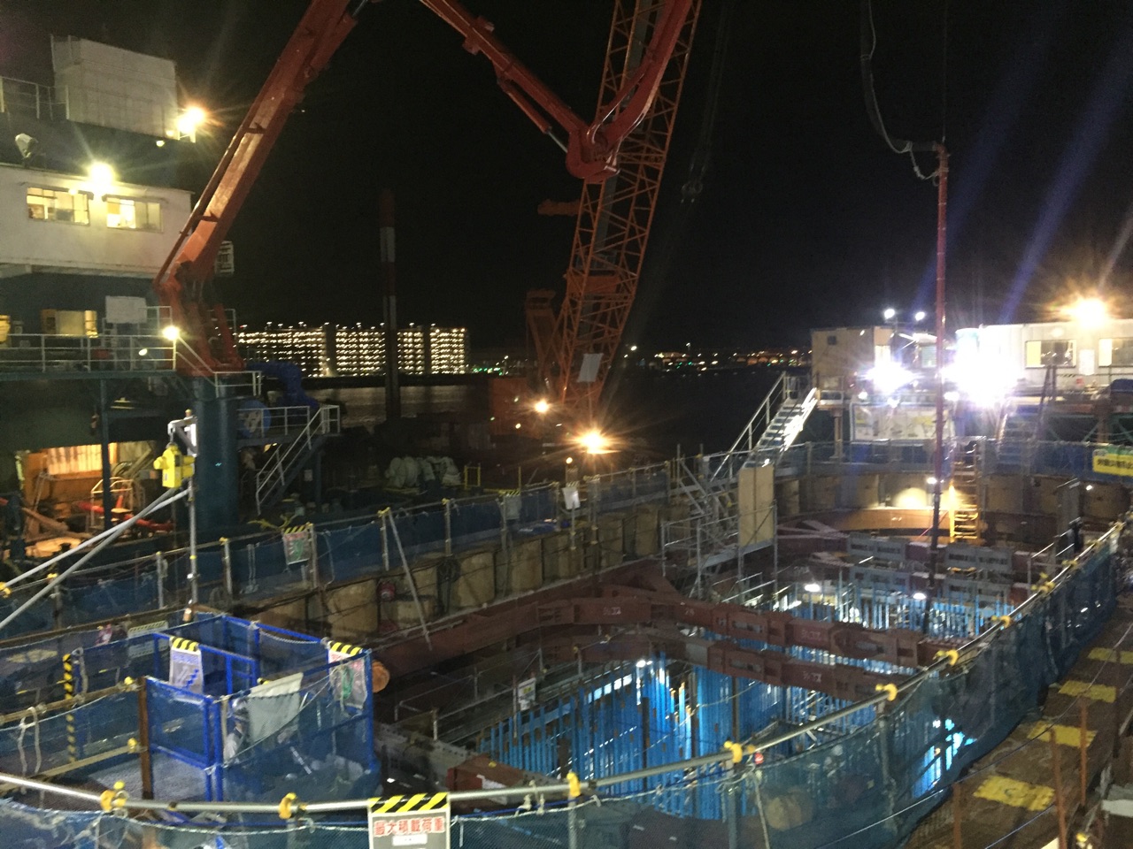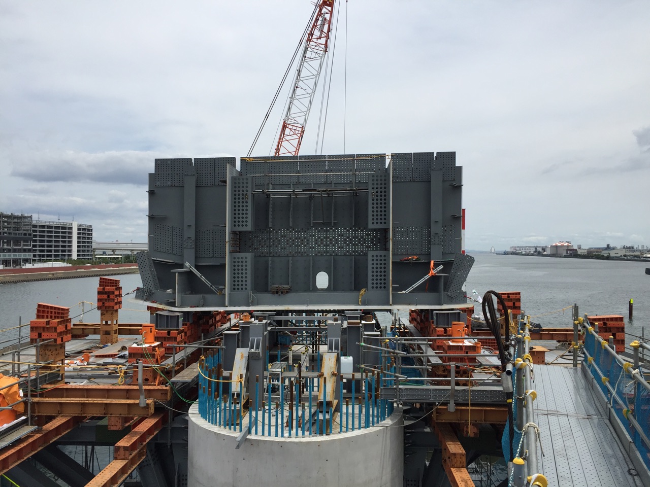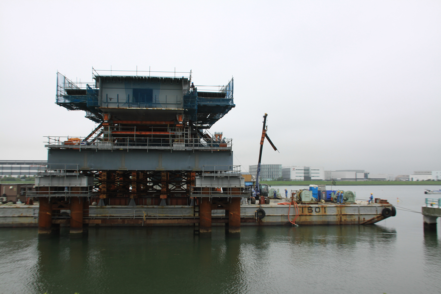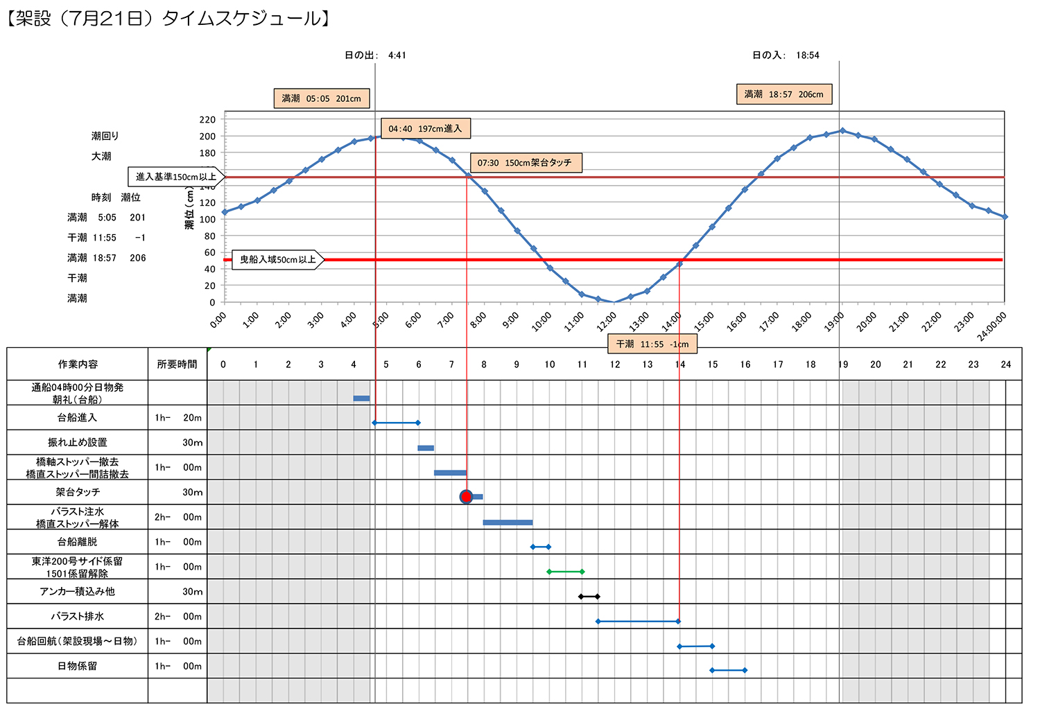 4時半に架設を開始し、B6-B7ベント間には、ちょうど潮位の上がるピークでありA.P. (東京湾霊岸島量水標の目盛による基準面零位を基準とする基本水準面(Arakawa Peil))201㎝に達した満潮時前後に進入した。これが架台にタッチする予定の7時半には同150㎝まで下がり、10時前には曳舟の入域が困難となる同50㎝以下まで下がってしまう。そのため「50~150㎝の潮位の中で勝負をかけなくてはならない」(陶山健太現場代理人)。時間との勝負だ。