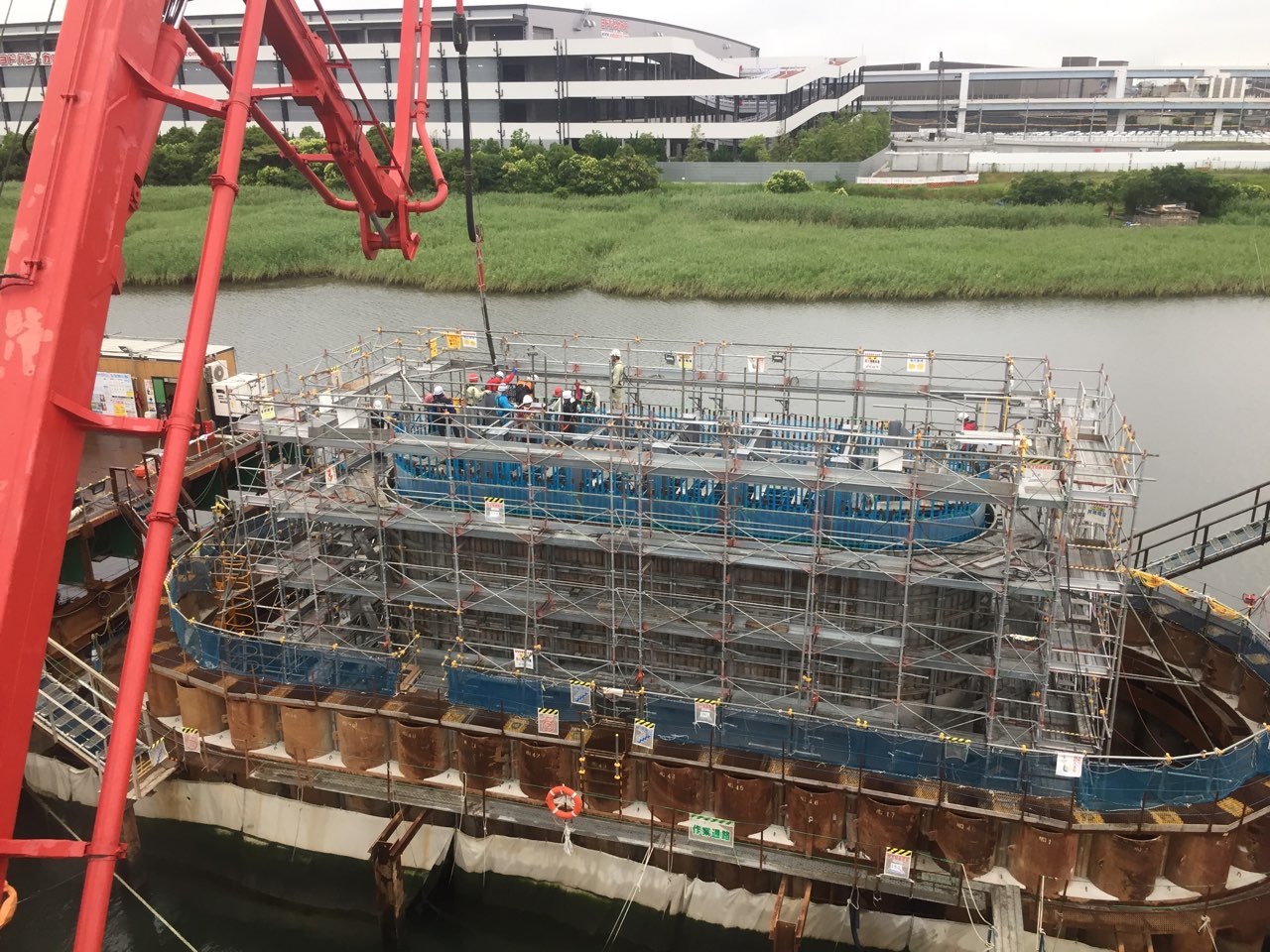 1回目の大ブロック架設は、幸いなことに台風19号が襲う1週間程度前の2019年9月30日に架設することができた。2回目以降は、台風の襲来後、浚渫を行った上で2020年4月から再開した。