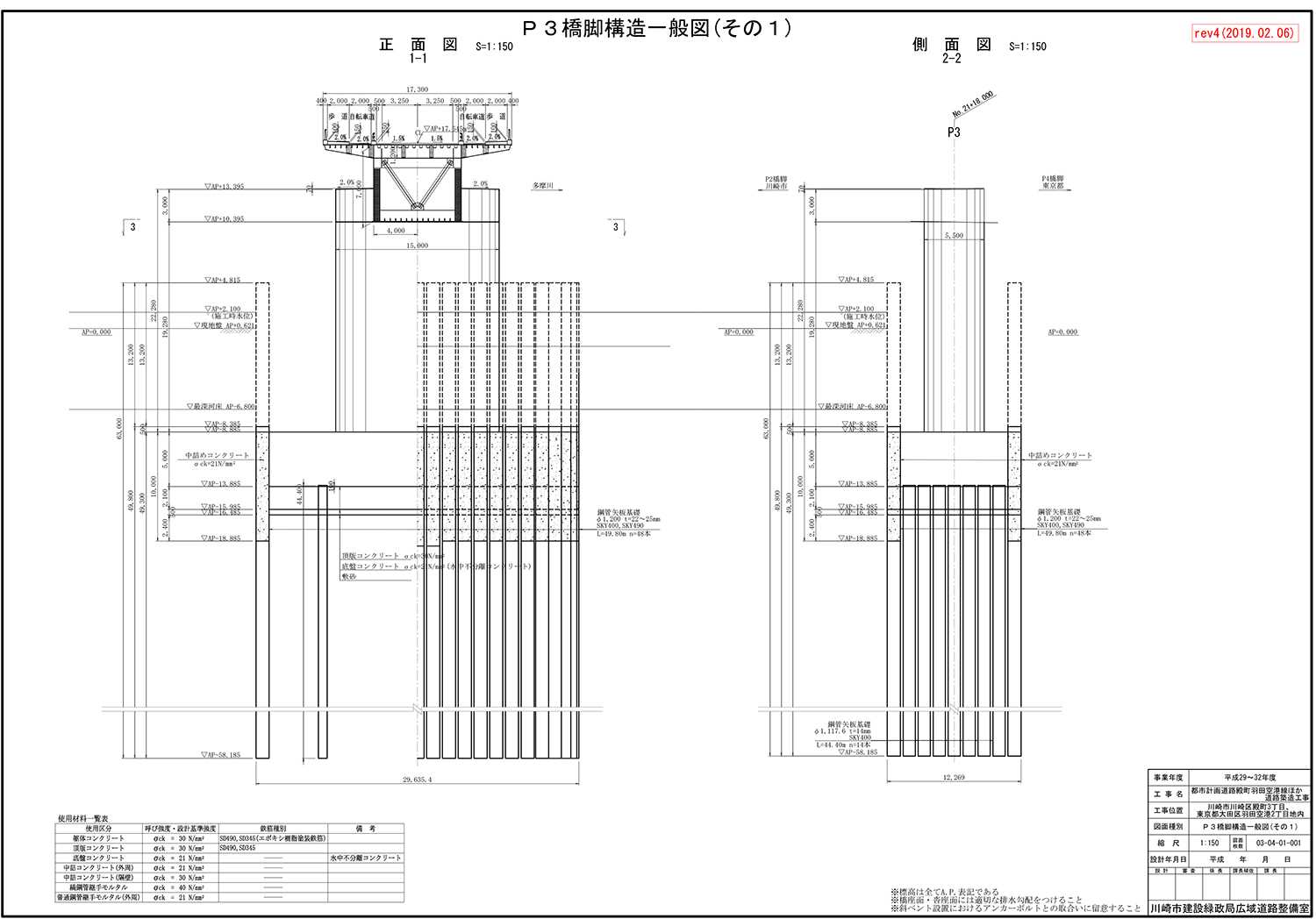 鉄筋はD51を使用し、150mmピッチで配置した。そのため㎥で300㎏を超えることはない。鉄筋量はP3橋脚で440t+ヘッドバー220t、P4で460t+ヘッドバー220tとした。
