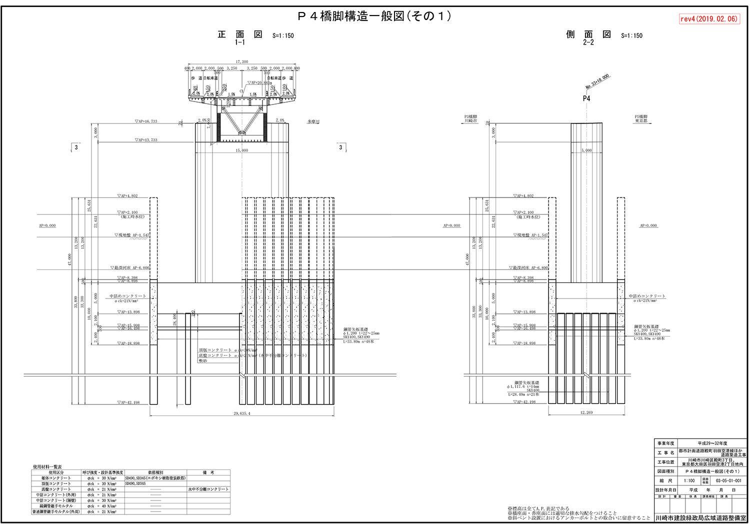 P3とP4は汽水域に建設するため防食対策としては純かぶり90mmを取ると共に、エポキシ樹脂塗装鉄筋(安治川鉄工製)を柱部分に採用している。さらに塩害対策及び摩耗対策として、飛沫帯(L.W.L-1.0m(A.P-1.0m))から橋脚天端まで含浸材(T&C工法 NETIS:HKK-110001-V)を塗布した。