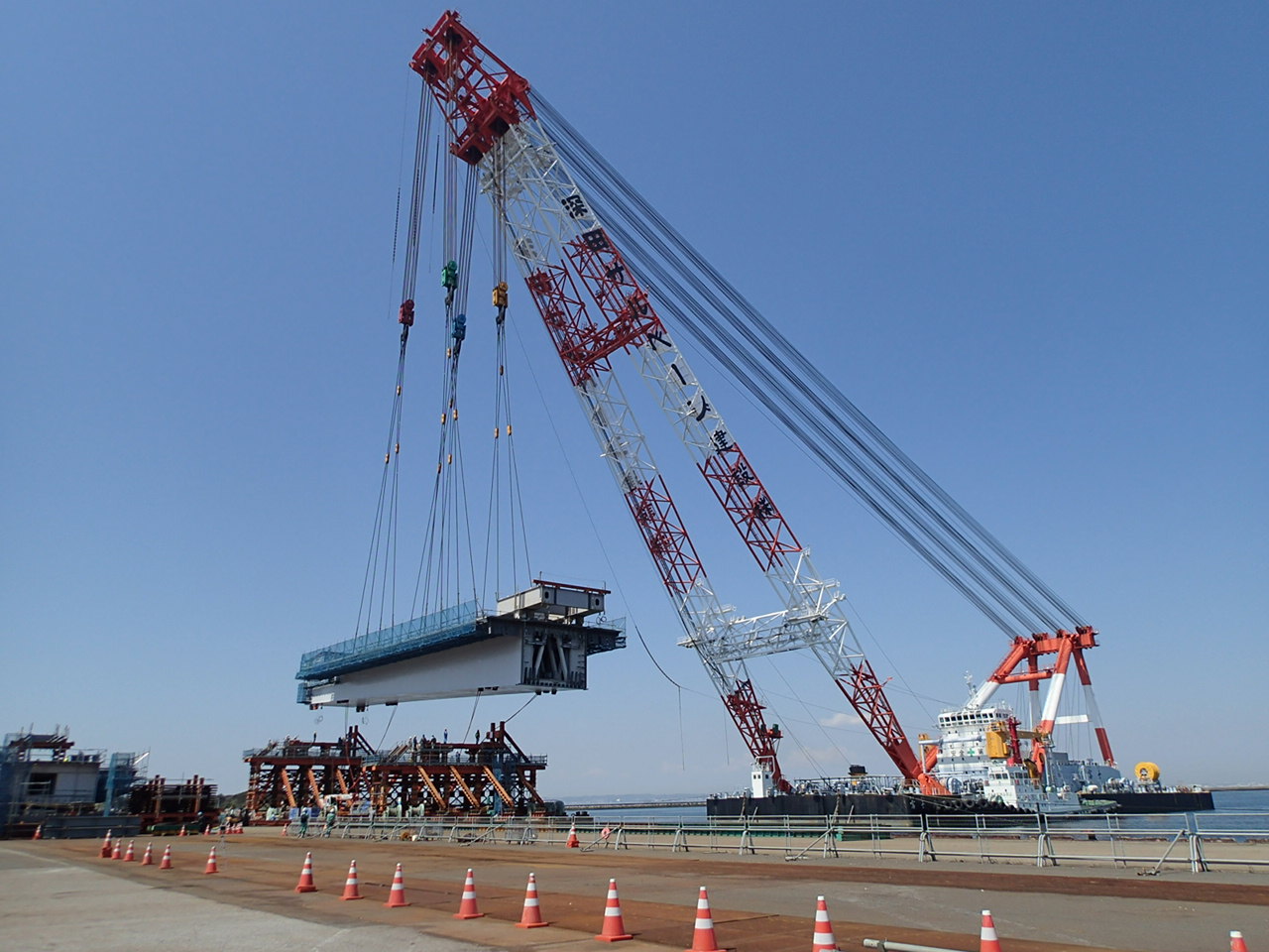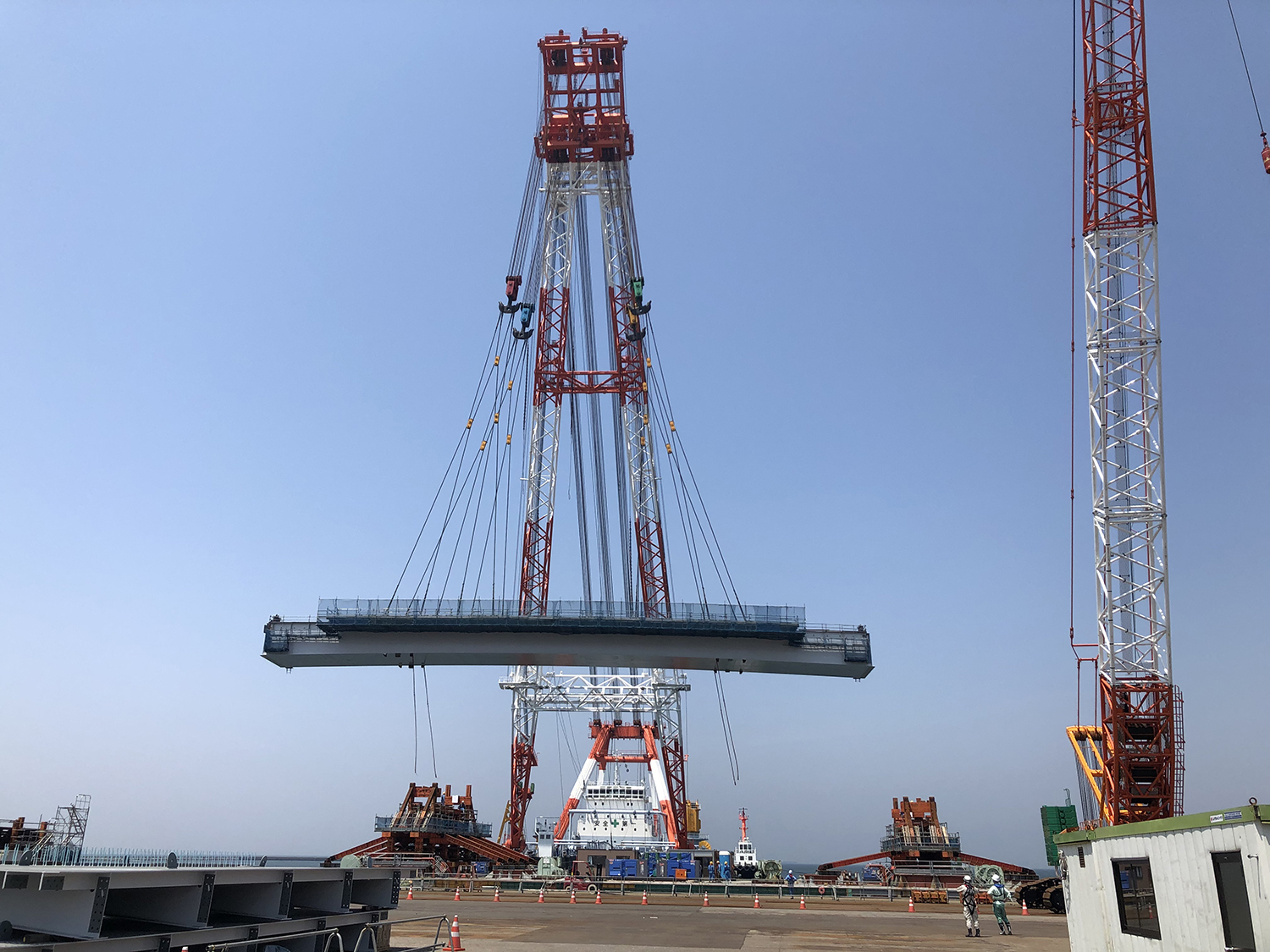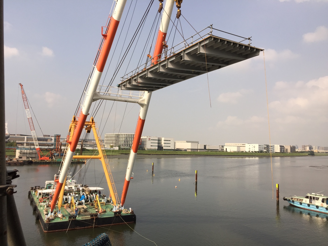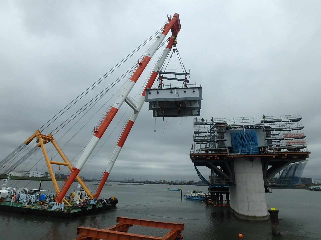 台船架設のうち、中央径間中央部に位置する3ブロック目の架設については、先に架設した両ブロックの端部に吊り上げ設備を予めセットし、台船上の桁を吊上げ架設した。吊上げ架設を採用したのは、ブロック間のクリアランスが小さくかつ、剛結構造のためセットバック・セットフォワードができないため、より精度を確保できる施工法として潮位を利用するだけでなく鉛直に吊り上げられる同工法を用いた。ジャッキダウンを行う方法もあるが、それだけ架台の高さが必要となり、輸送時の安定性を考慮し現実的ではないと判断した。