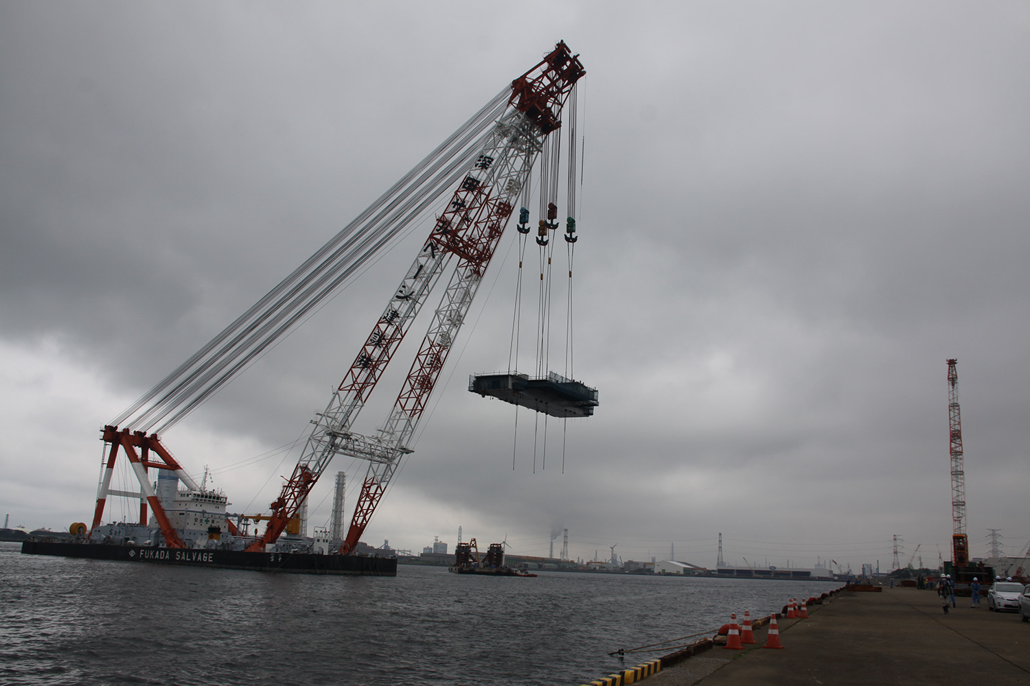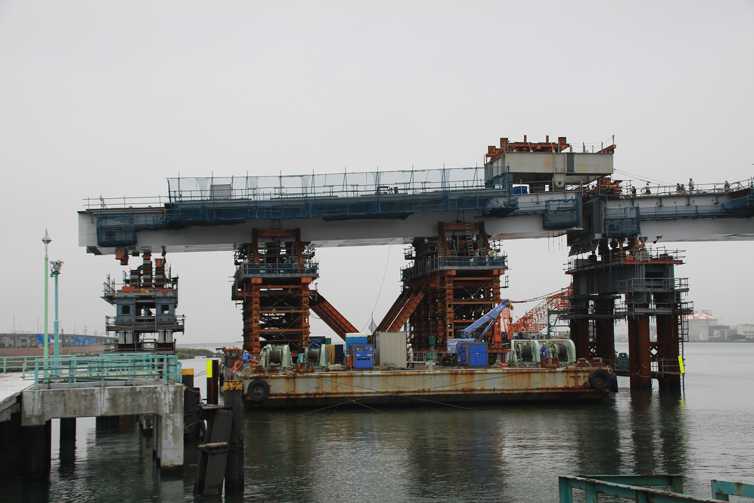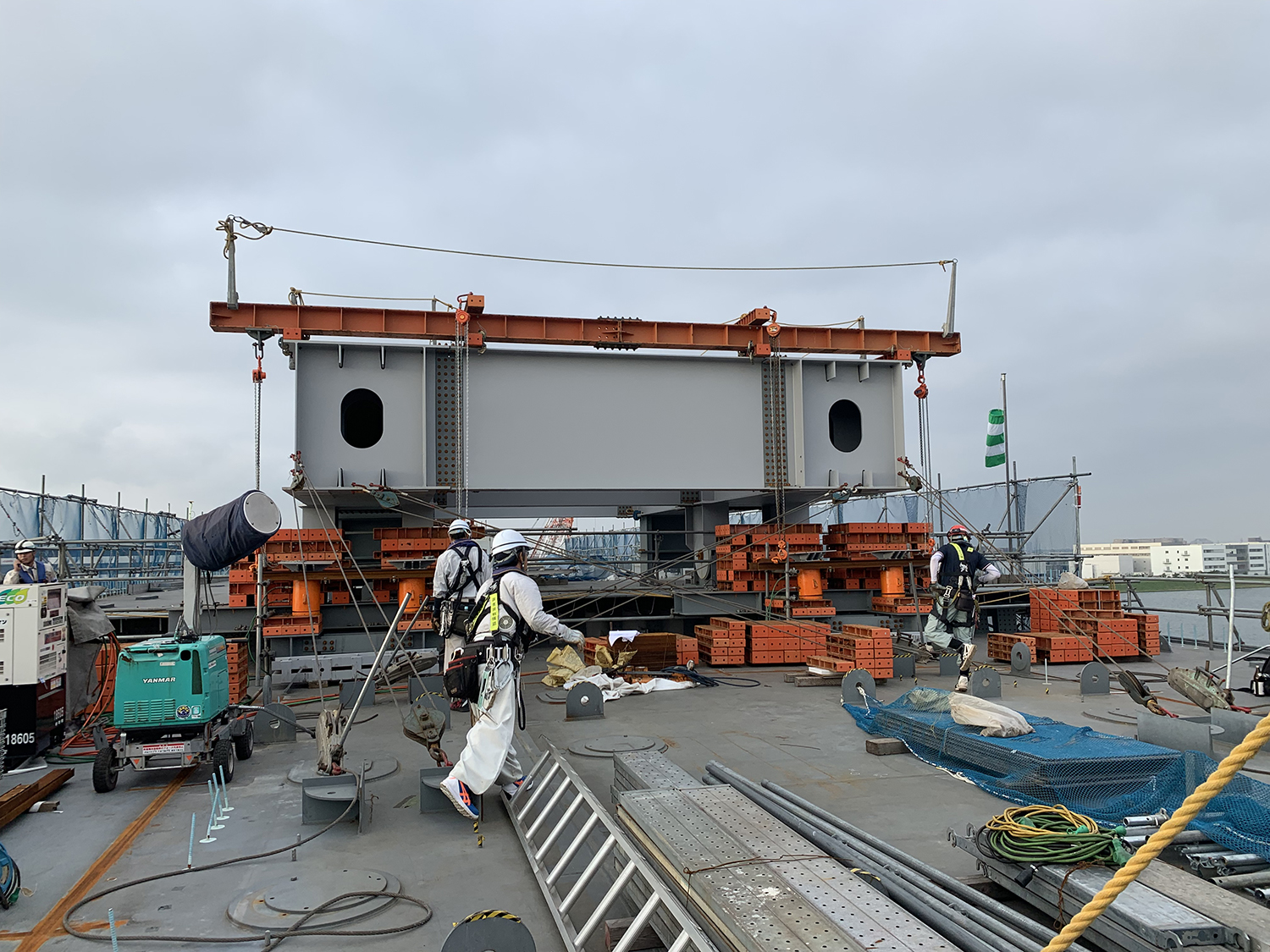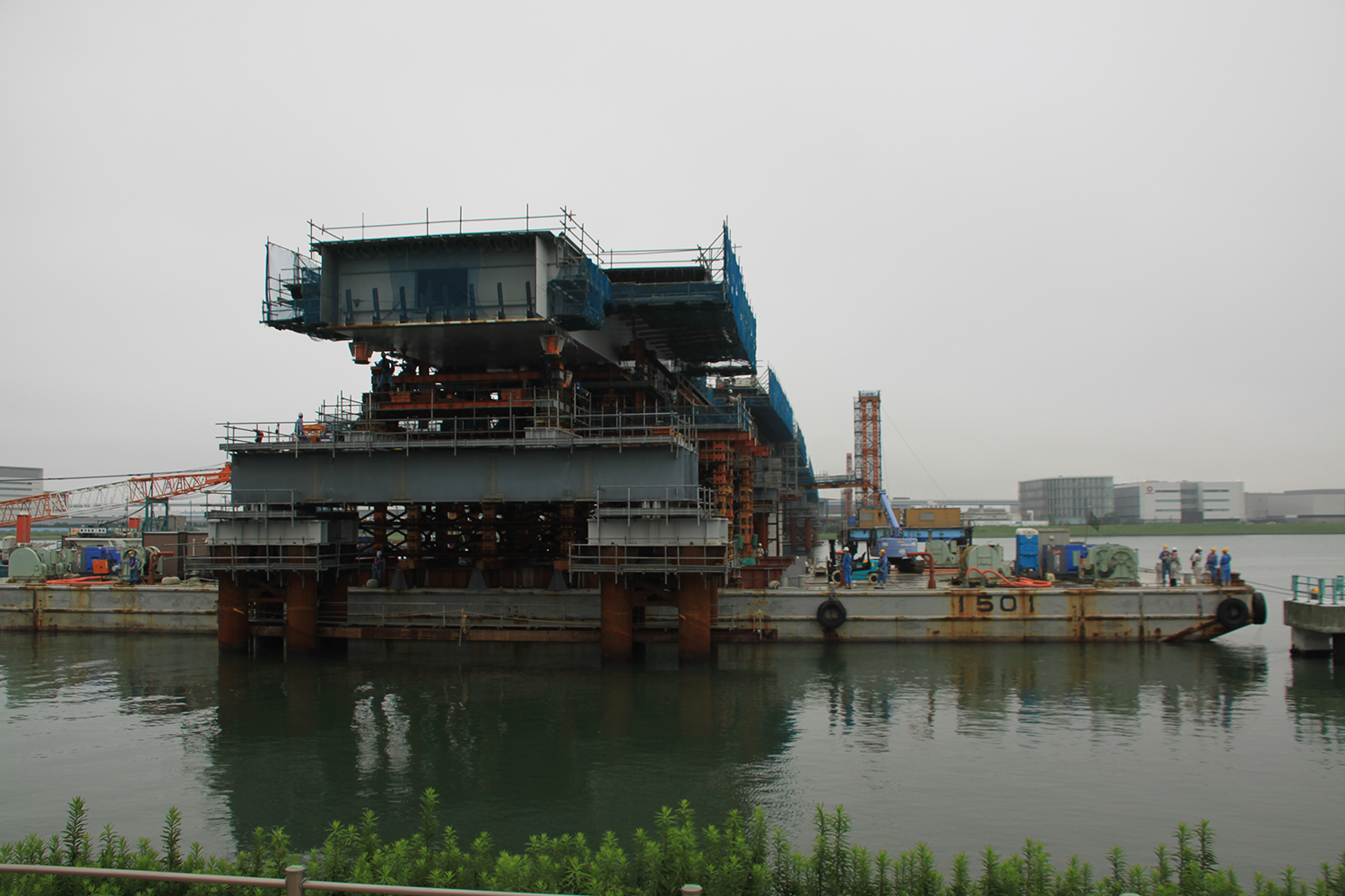 台船架設のうち、中央径間中央部に位置する3ブロック目の架設については、先に架設した両ブロックの端部に吊り上げ設備を予めセットし、台船上の桁を吊上げ架設した。吊上げ架設を採用したのは、ブロック間のクリアランスが小さくかつ、剛結構造のためセットバック・セットフォワードができないため、より精度を確保できる施工法として潮位を利用するだけでなく鉛直に吊り上げられる同工法を用いた。ジャッキダウンを行う方法もあるが、それだけ架台の高さが必要となり、輸送時の安定性を考慮し現実的ではないと判断した。