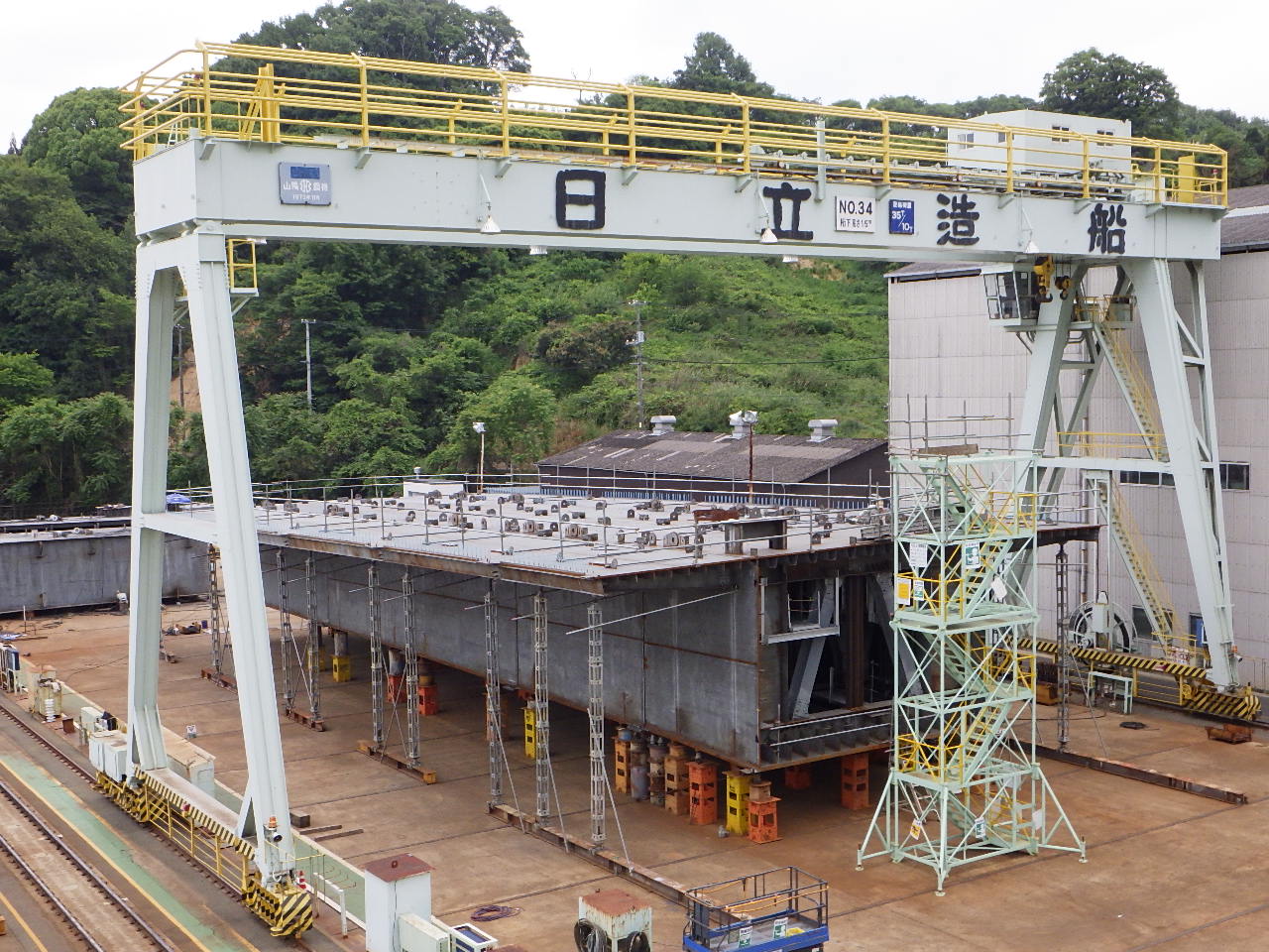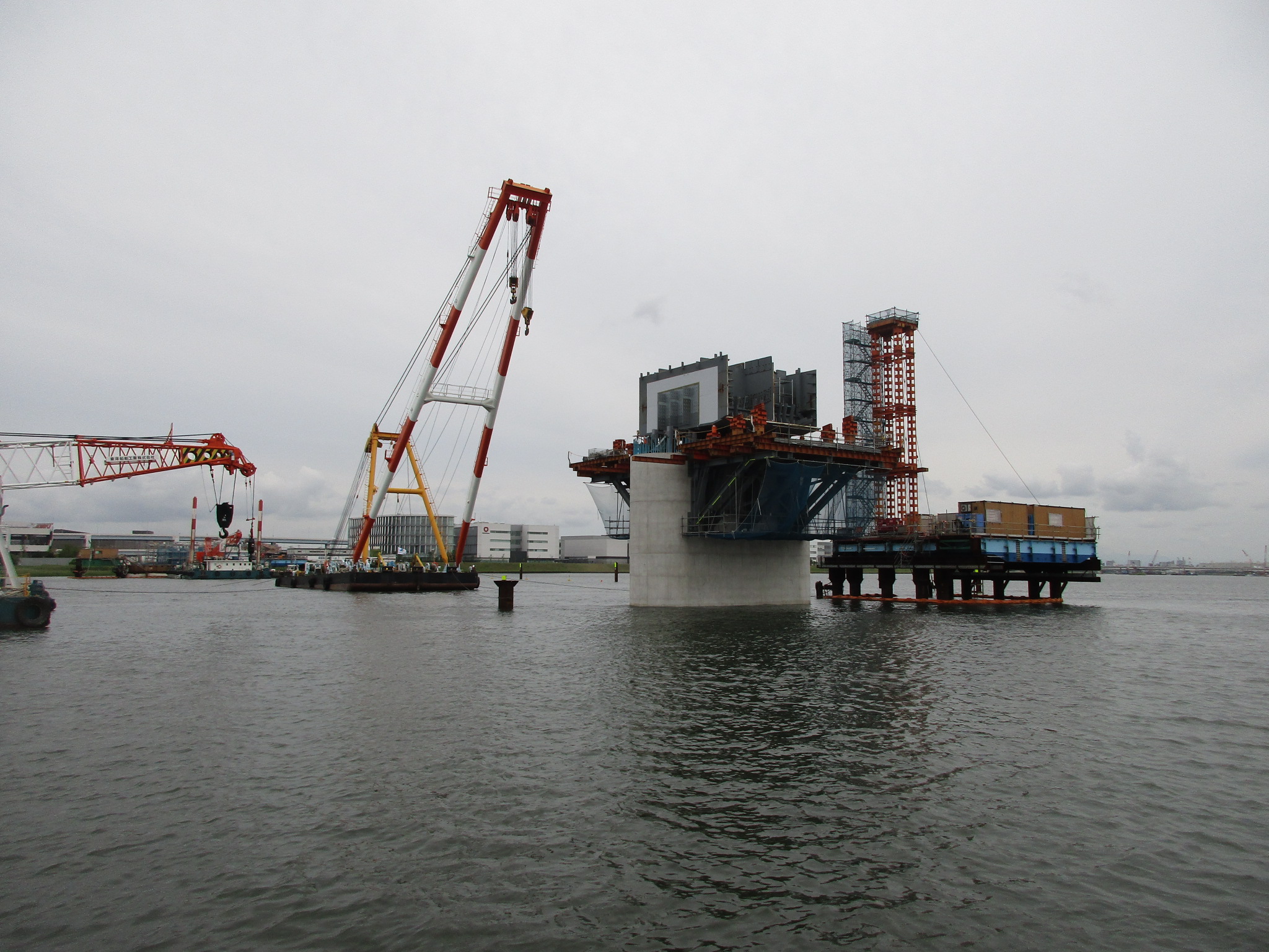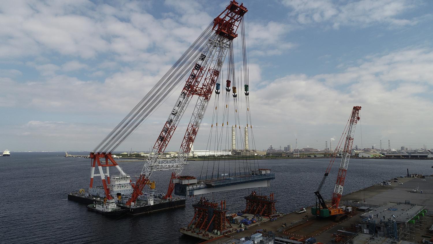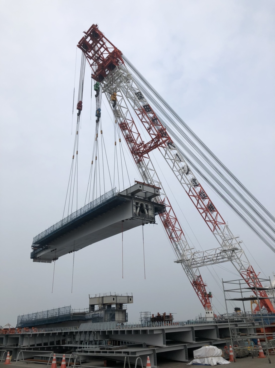 台船架設のうち、中央径間中央部に位置する3ブロック目の架設については、先に架設した両ブロックの端部に吊り上げ設備を予めセットし、台船上の桁を吊上げ架設した。吊上げ架設を採用したのは、ブロック間のクリアランスが小さくかつ、剛結構造のためセットバック・セットフォワードができないため、より精度を確保できる施工法として潮位を利用するだけでなく鉛直に吊り上げられる同工法を用いた。ジャッキダウンを行う方法もあるが、それだけ架台の高さが必要となり、輸送時の安定性を考慮し現実的ではないと判断した。