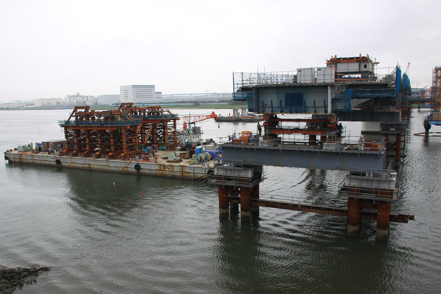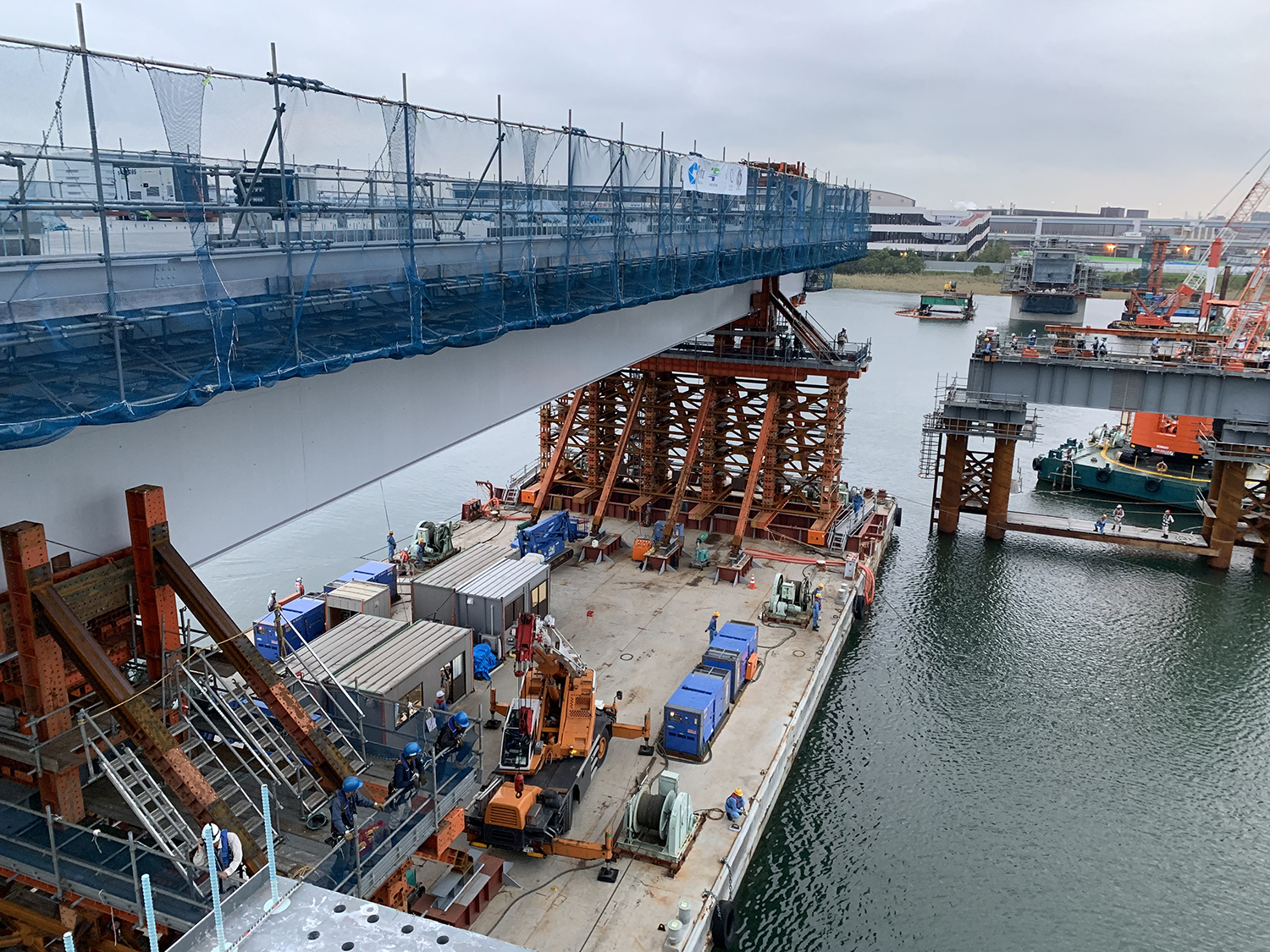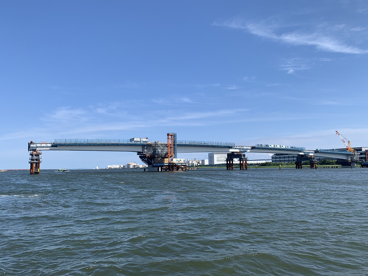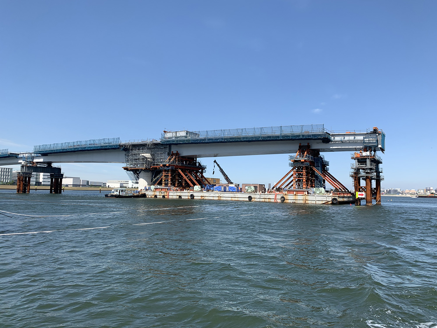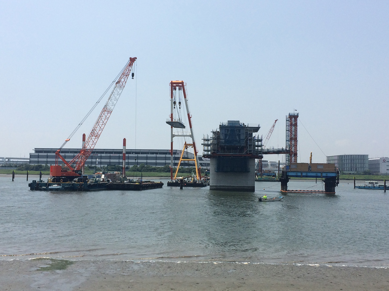 上部工の架設工法は前述したように多岐にわたる。現場条件として、河川内は浅いため、入域できる船の規模は限られている。さらに羽田側には環八が通り、その後ろは羽田空港の敷地があるため、羽田側をヤードとして使う工法は選べない。