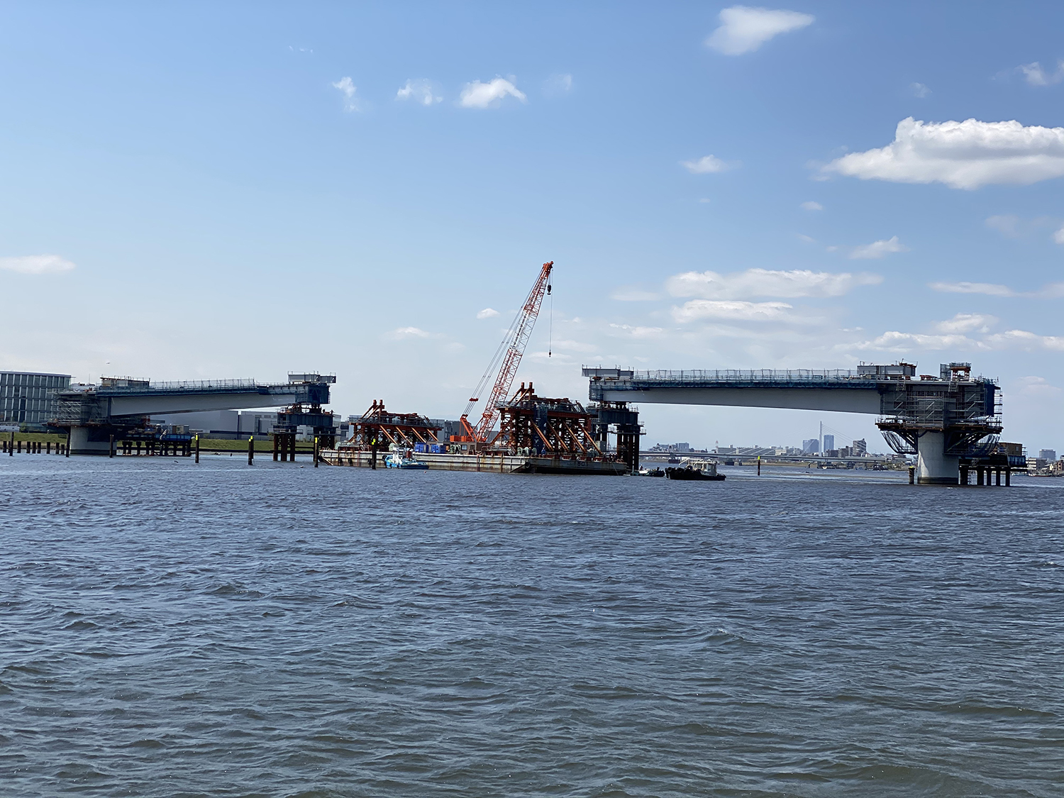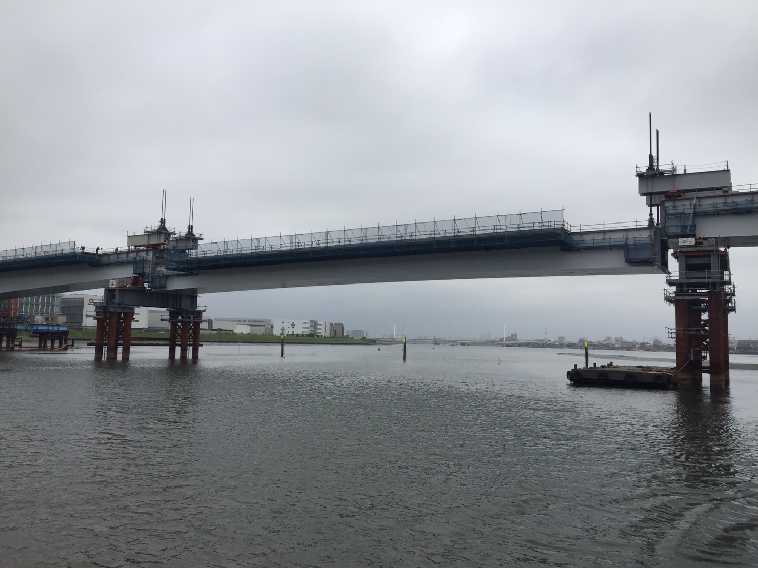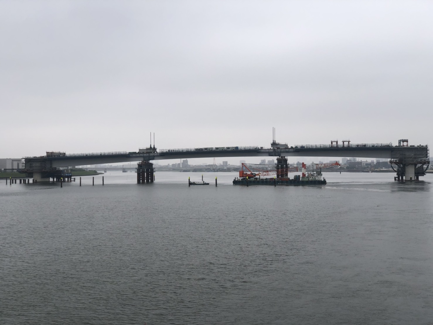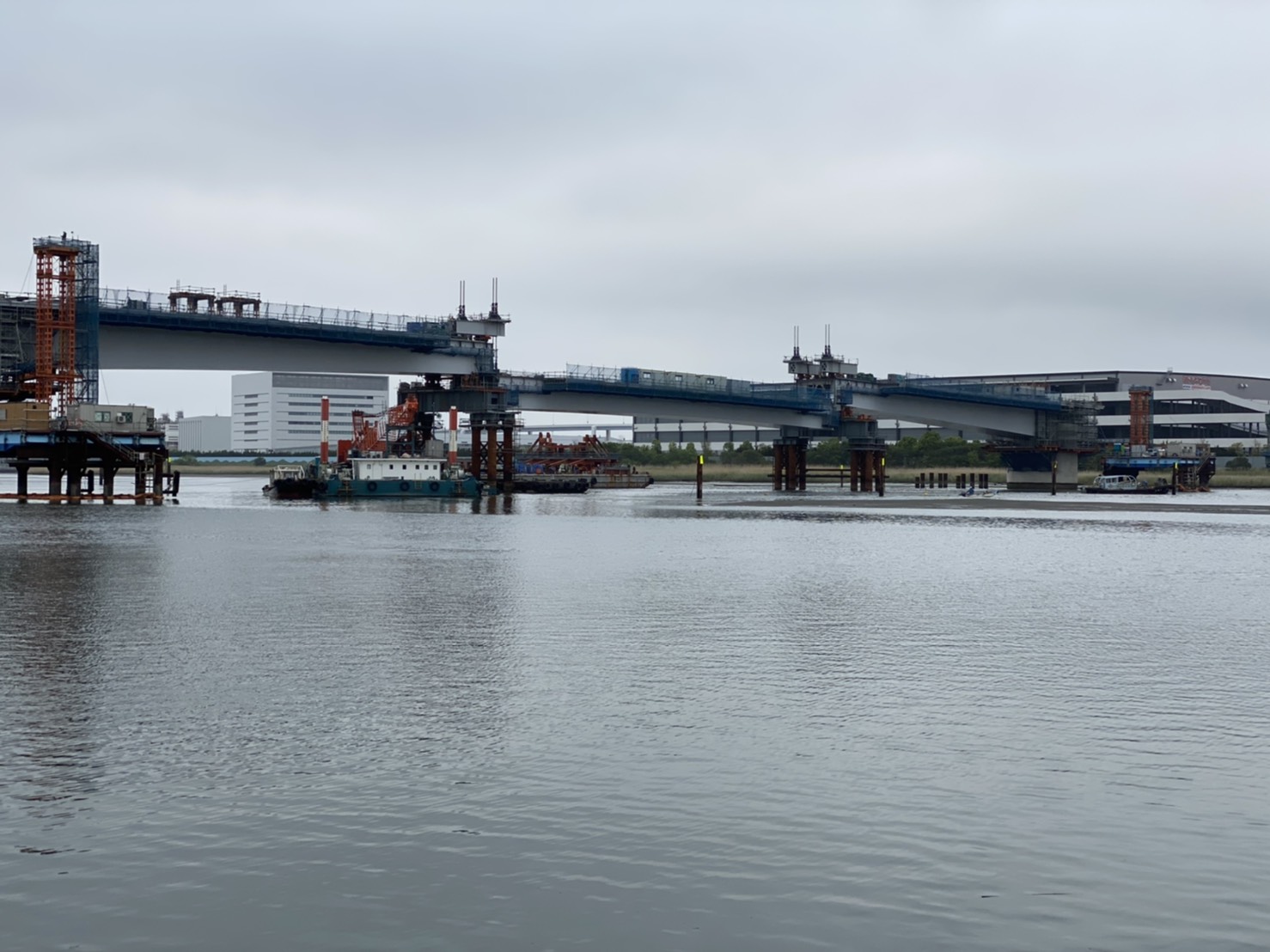 上部工の架設工法は前述したように多岐にわたる。現場条件として、河川内は浅いため、入域できる船の規模は限られている。さらに羽田側には環八が通り、その後ろは羽田空港の敷地があるため、羽田側をヤードとして使う工法は選べない。