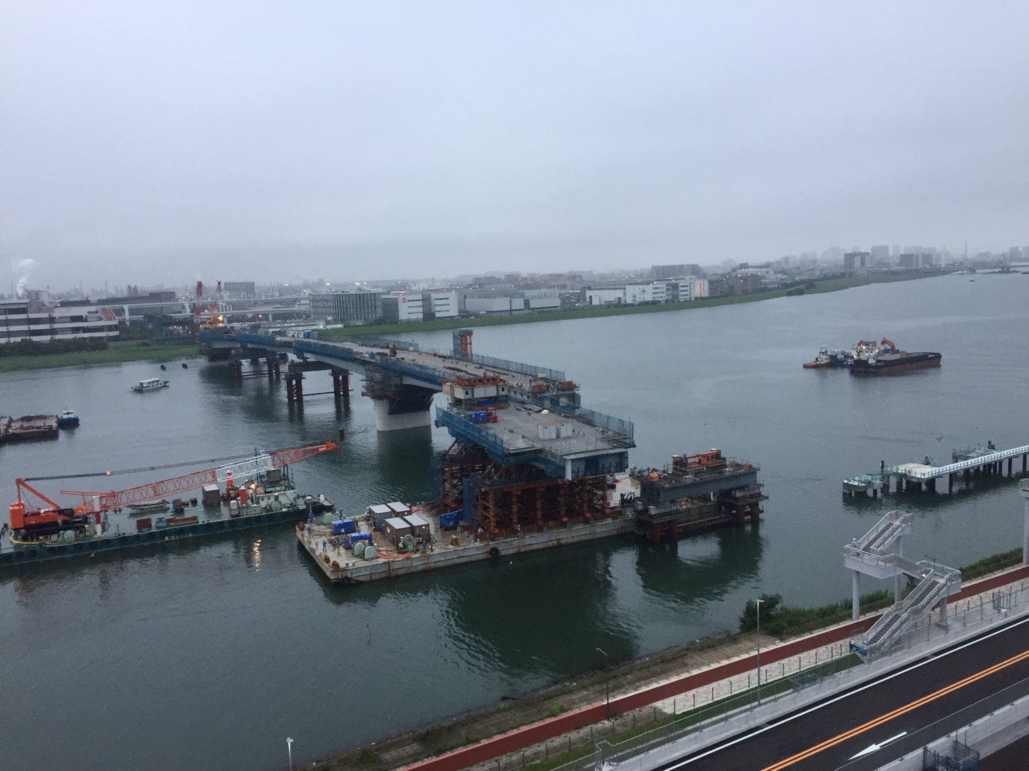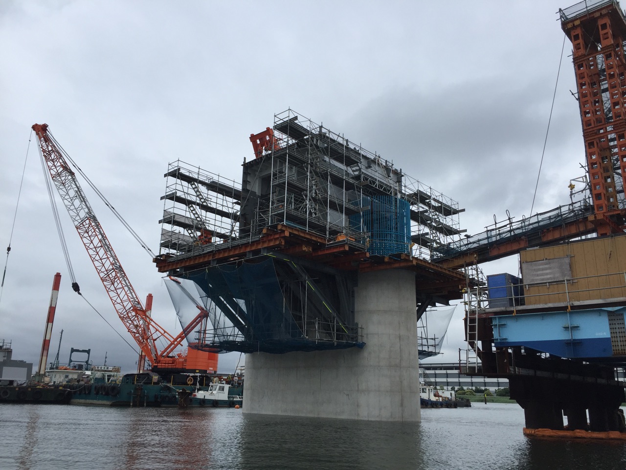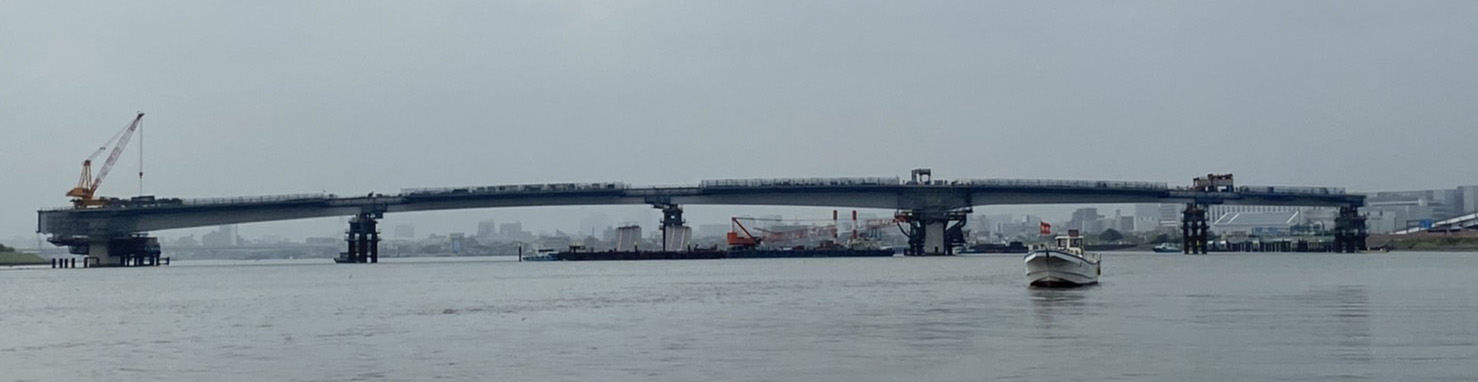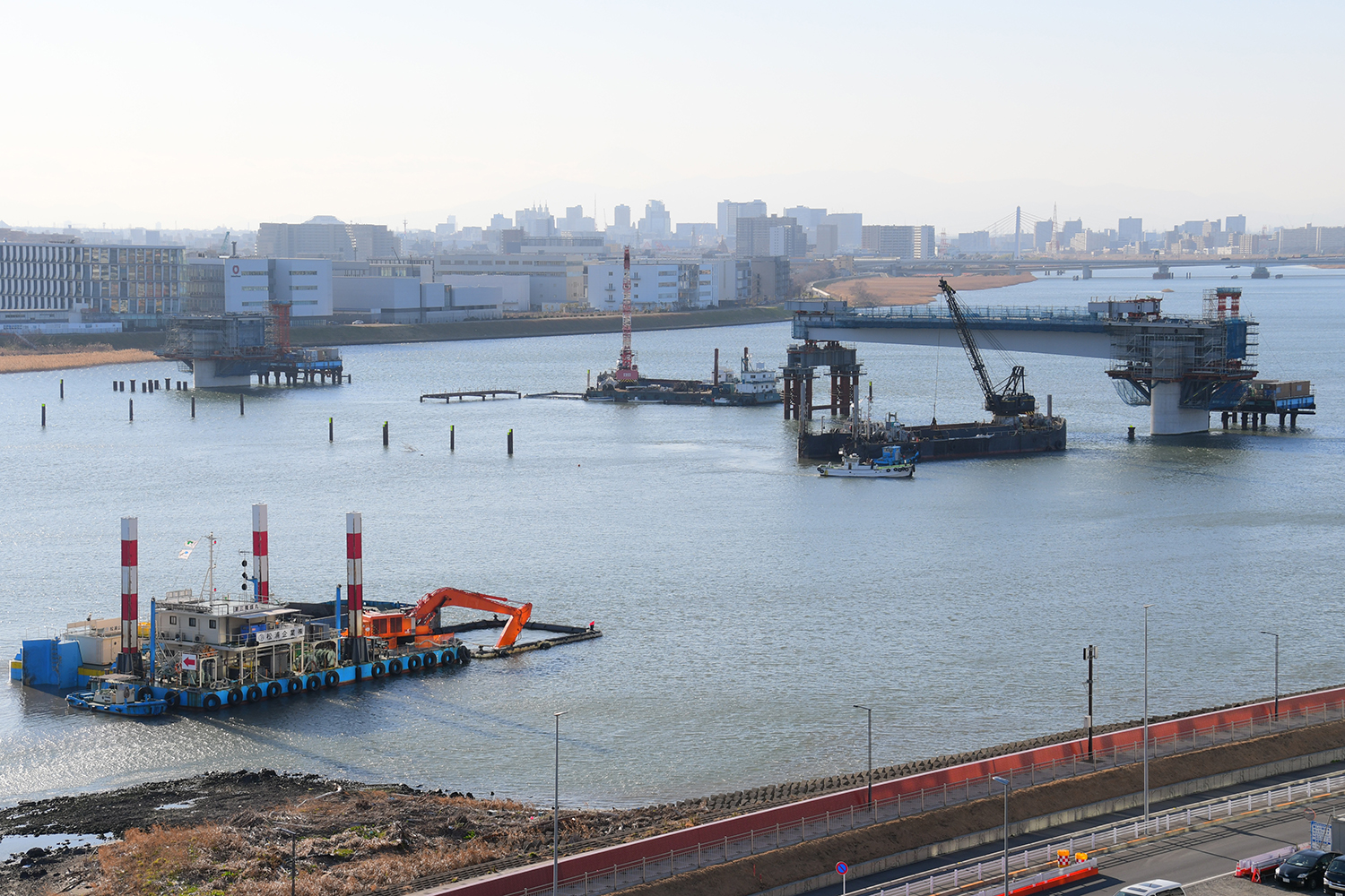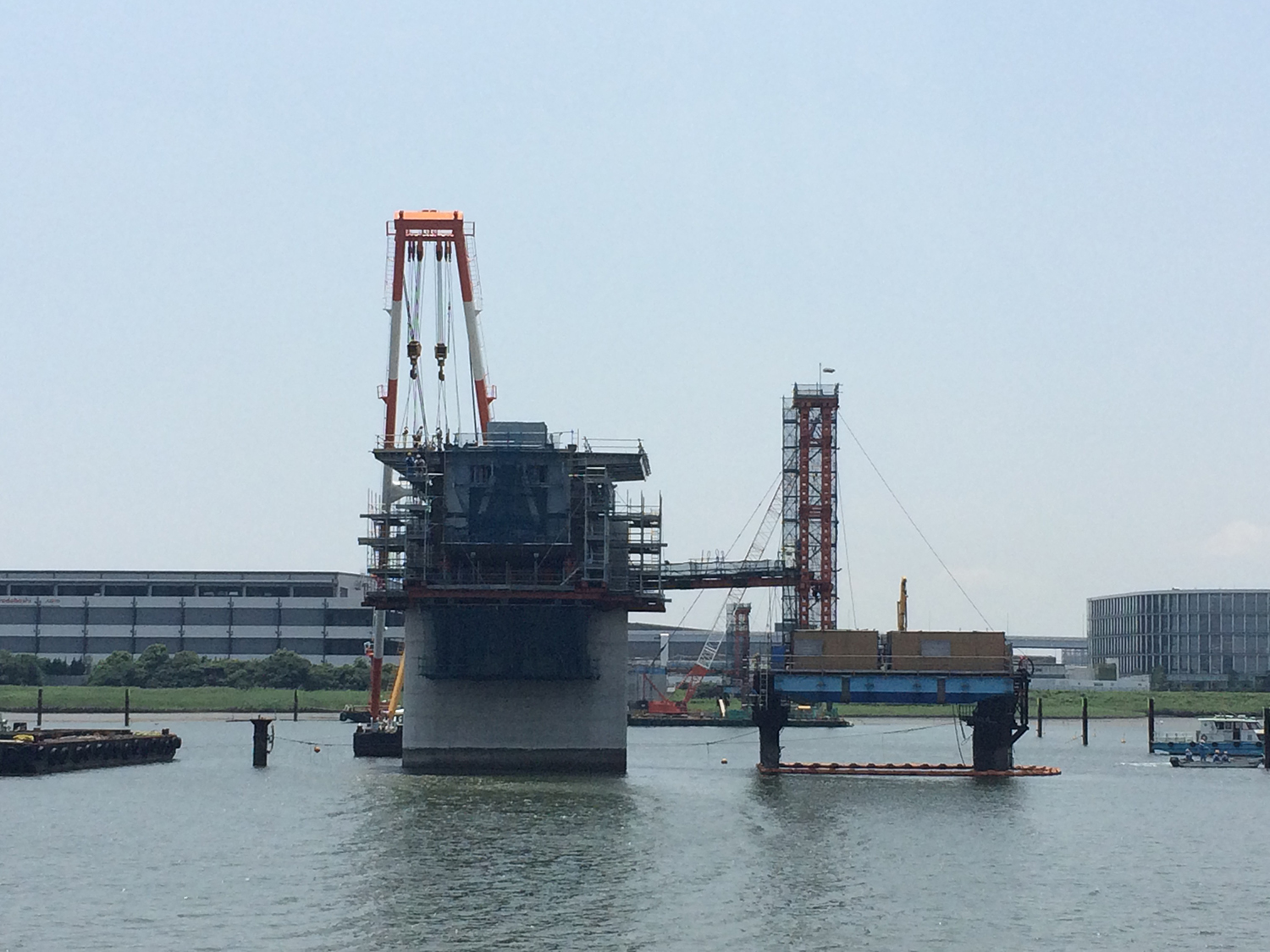 上部工の架設工法は前述したように多岐にわたる。現場条件として、河川内は浅いため、入域できる船の規模は限られている。さらに羽田側には環八が通り、その後ろは羽田空港の敷地があるため、羽田側をヤードとして使う工法は選べない。