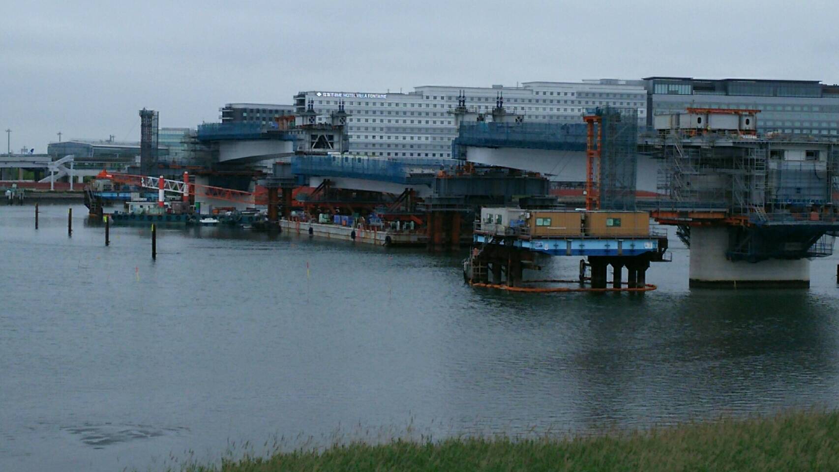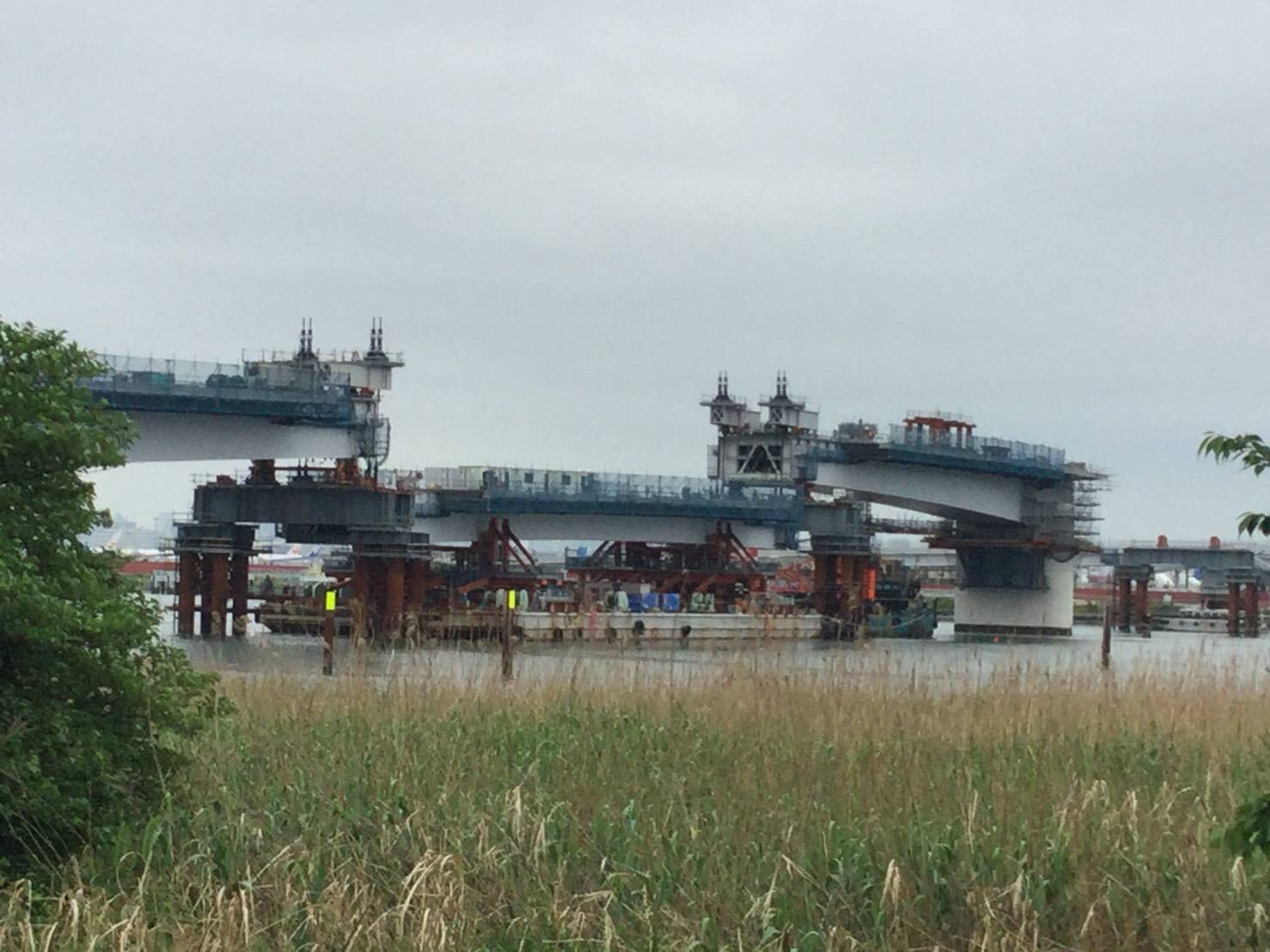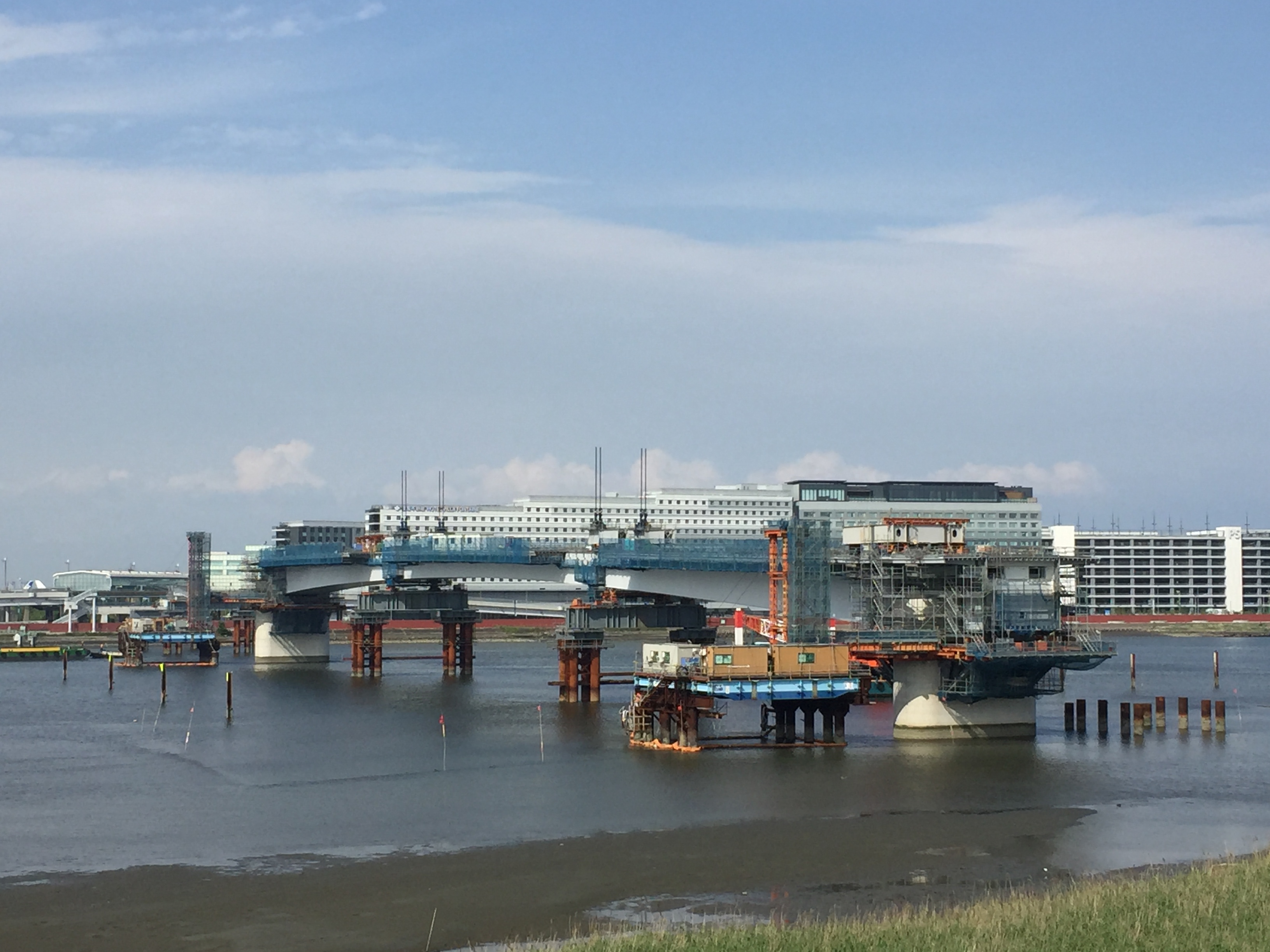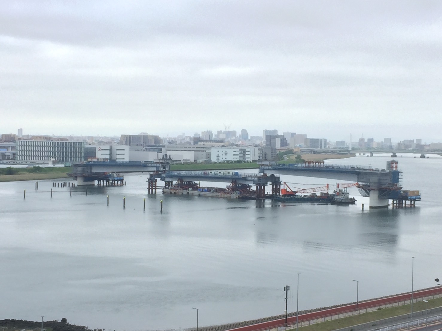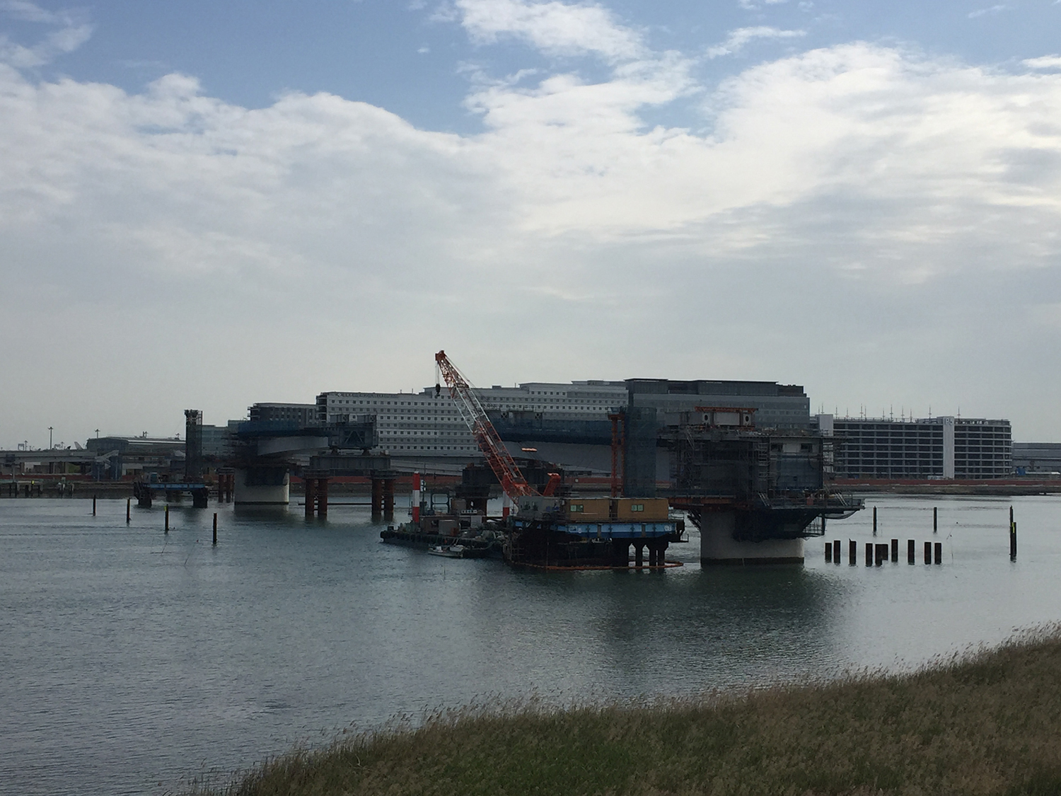 上部工の架設工法は前述したように多岐にわたる。現場条件として、河川内は浅いため、入域できる船の規模は限られている。さらに羽田側には環八が通り、その後ろは羽田空港の敷地があるため、羽田側をヤードとして使う工法は選べない。