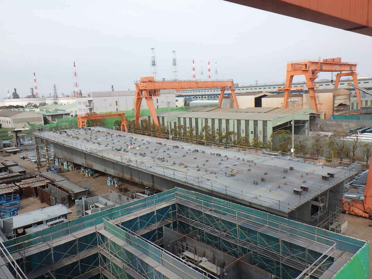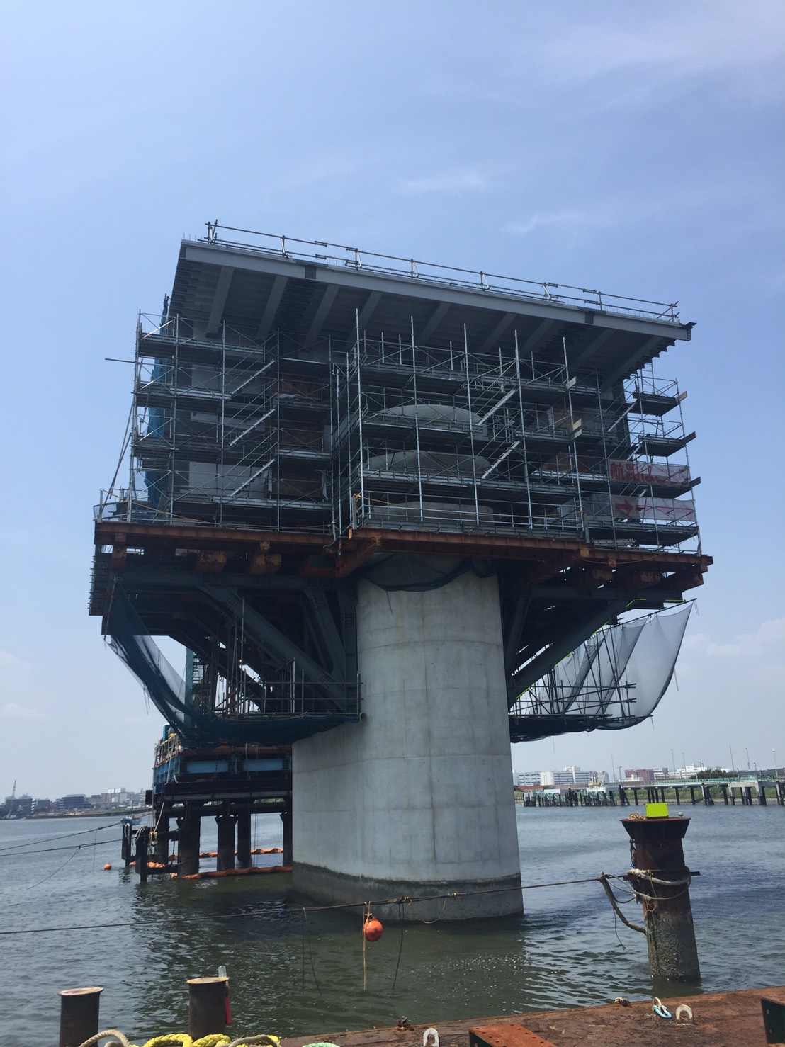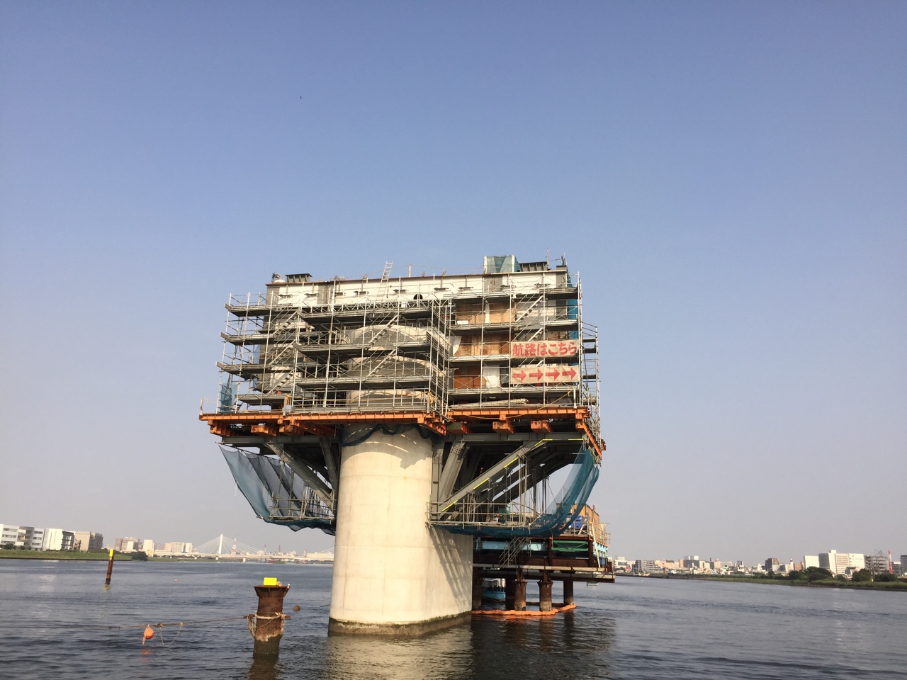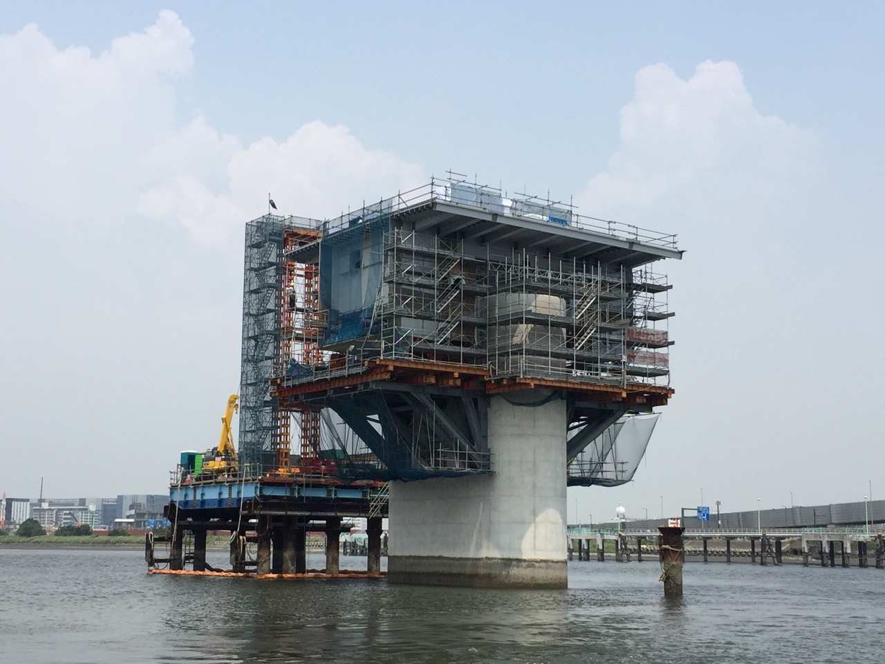 躯体構築時は両サイドの作業構台にクレーンを配置して、鉄筋・型枠組立を行った。作業構台はφ900mmの杭を片側20本打設して構築した。杭打設のためには、P3およびP4にアクセスする必要があるが、生態系保持空間であり、東京側は環八が近接していて資材搬入する場所がない。さりとて航路を長期間塞ぐわけにもいかない。そのため海から搬入し、川の流れを阻害しないように上下流に構台を構築した。ハーフSEP船を用いることも検討したが、出水時や台風シーズンには船舶を避難させる必要があるため、稼働率などから構台施工を是とした。クローラークレーンは台船上に部材を配置し、クレーン船を用いて製作していった。上部工も同じ構台を用いて施工した。