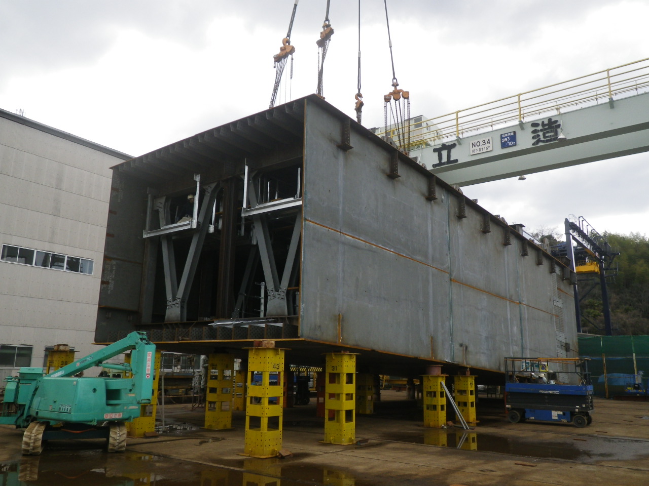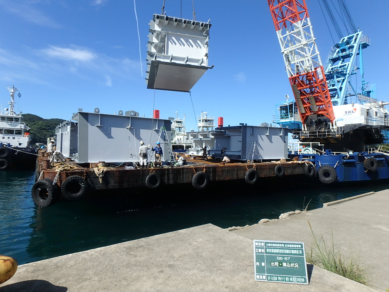 台船架設は5回に分けて行われた。大ブロックのブロック長及び鋼重は、施工順に①P4~B(ベント)4ブロックが70m、1,200t、②P3~B3ブロックが69.5m、1,100t、③B3~B4ブロックが82m、1,100t、④P4~B6ブロックが66.85m、1,200t、B6~B7ブロックが42.5m、700tである。大ブロックの浜出しは、3000t吊FC船『富士』を用いて吊り上げ、4000t級台船(65×24m)に載せた。なお架設の際の縦断勾配を考慮して、桁の載荷位置を工夫した。最終ブロックに関しては、現場の航路幅が狭く、通常の様に橋軸と同じように船体を横にできず、縦に入れて施工する必要があるため、桁を横配置して受けていた。