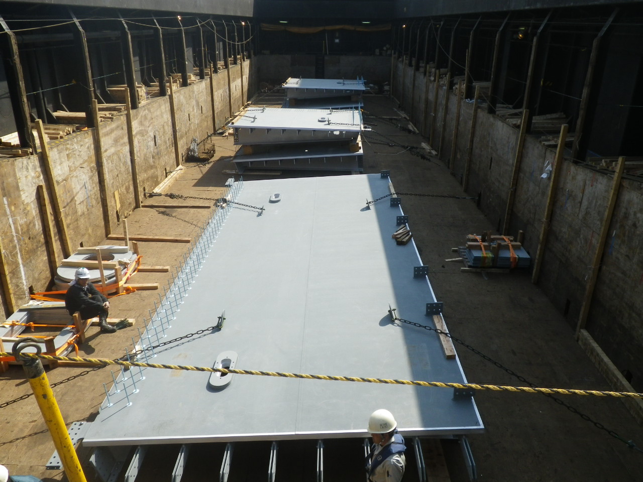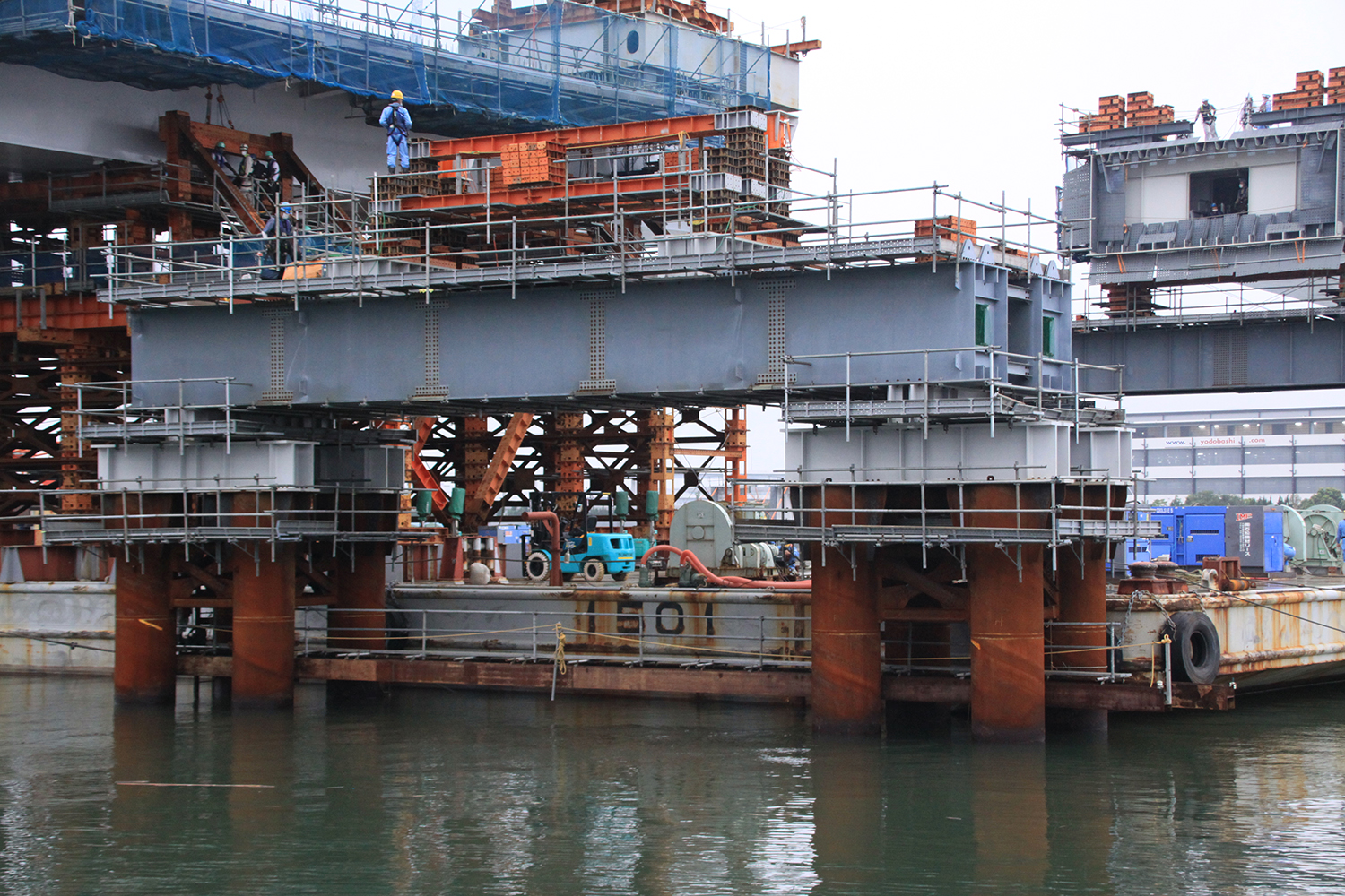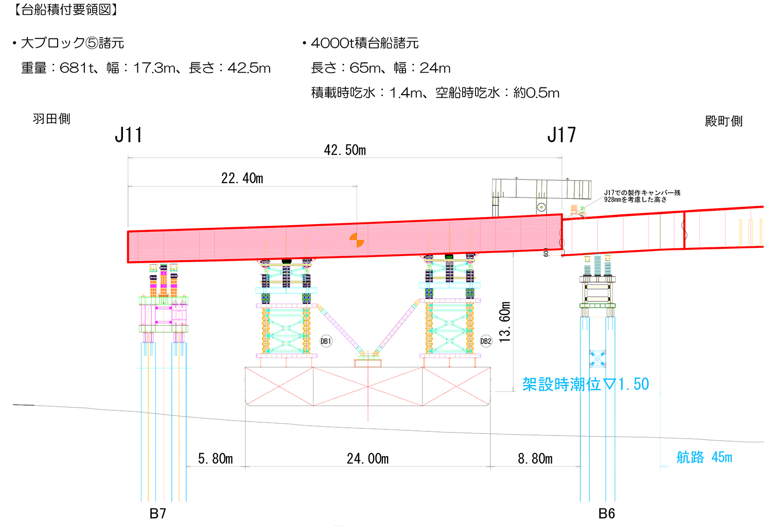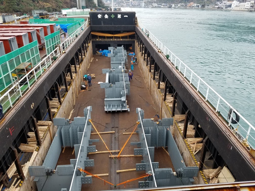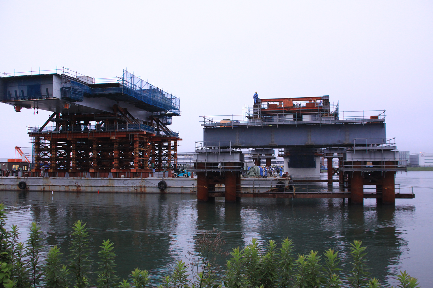 台船架設の最終(5ブロック目)の施工はベント間の幅が狭い(38.6m、台船幅は24m)ため、桁を台船とは直角の方向に配置し、ベント間に台船が縦になる様に進入して架設した。桁は左側に多少下り勾配に配置しているが、これは橋梁の縦断線形を考慮した。同ブロックは幅17.3m、長さ42.5m、重量約800t(治具含む、桁重量は681t)の桁を4000t積台船に載荷して運んだ。