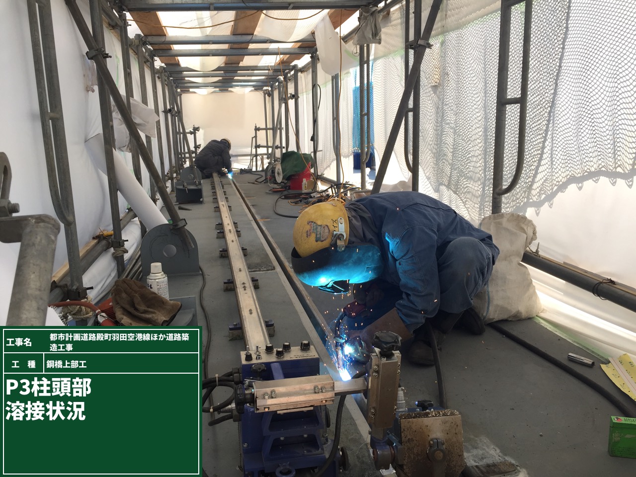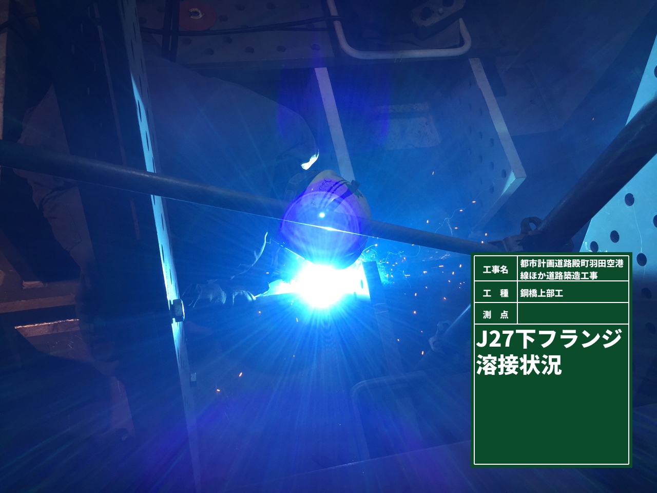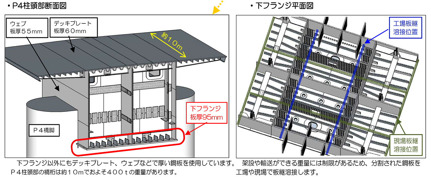 スパンを飛ばすため、板厚は最大で95mmと道路橋示方書の上限値(100mm)に近い。そのため部材同士の接合は、基本的に溶接構造とし、やむを得ない個所のみ添接構造とした。そのため溶接キャンバーも見ていく必要がある。溶接の仕口精度(ギャップ)は、±5mm、ルートフェイス(目違い)は0~2mm、パス数は95mmで120パス程度。全溶接長(6mm換算長)は124,167mに達した。