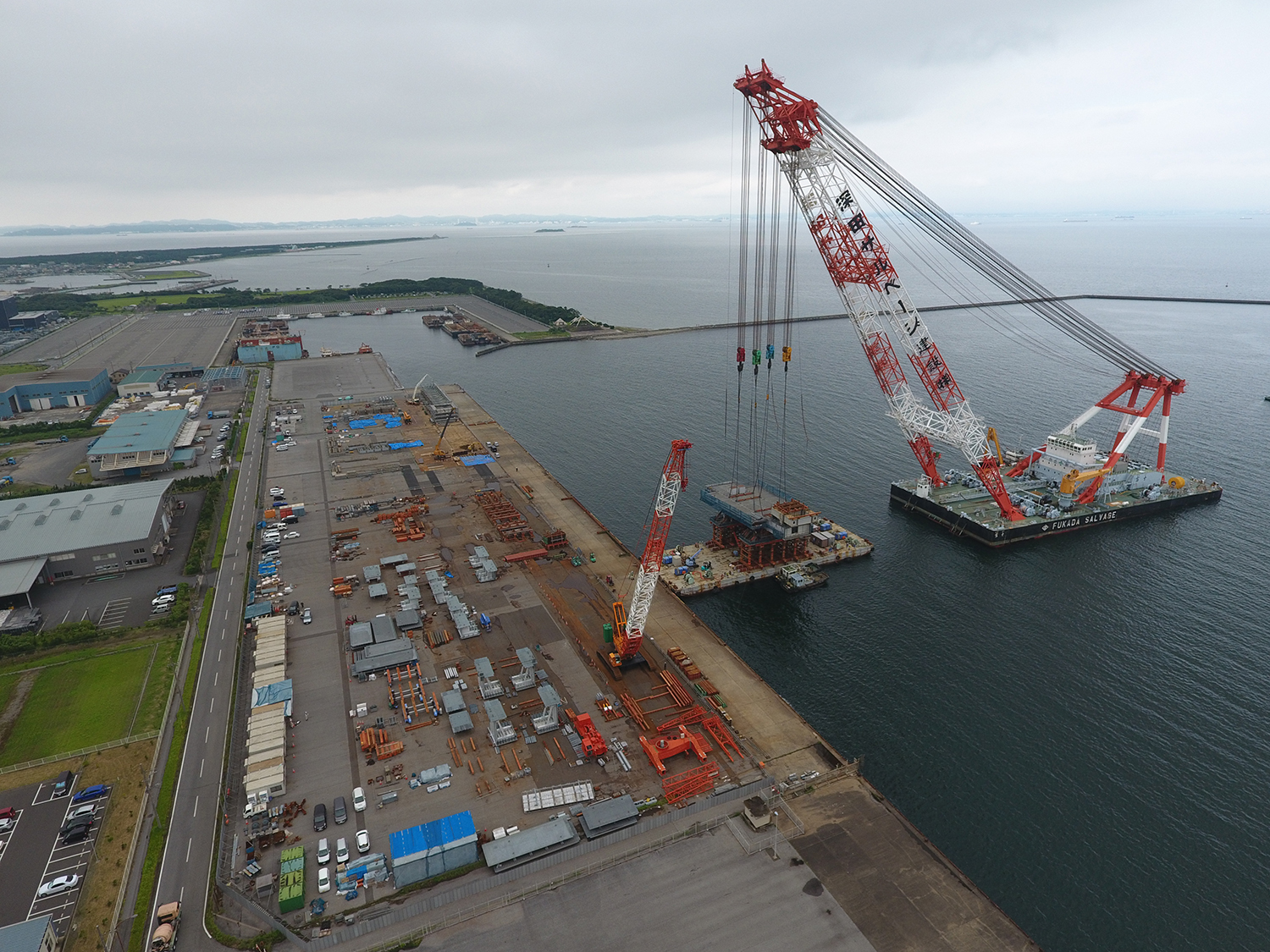 基礎工と同様に作業船および作業構台上のクローラークレーンにより施工した。作業構台は井筒の両側に矩形に配置している。