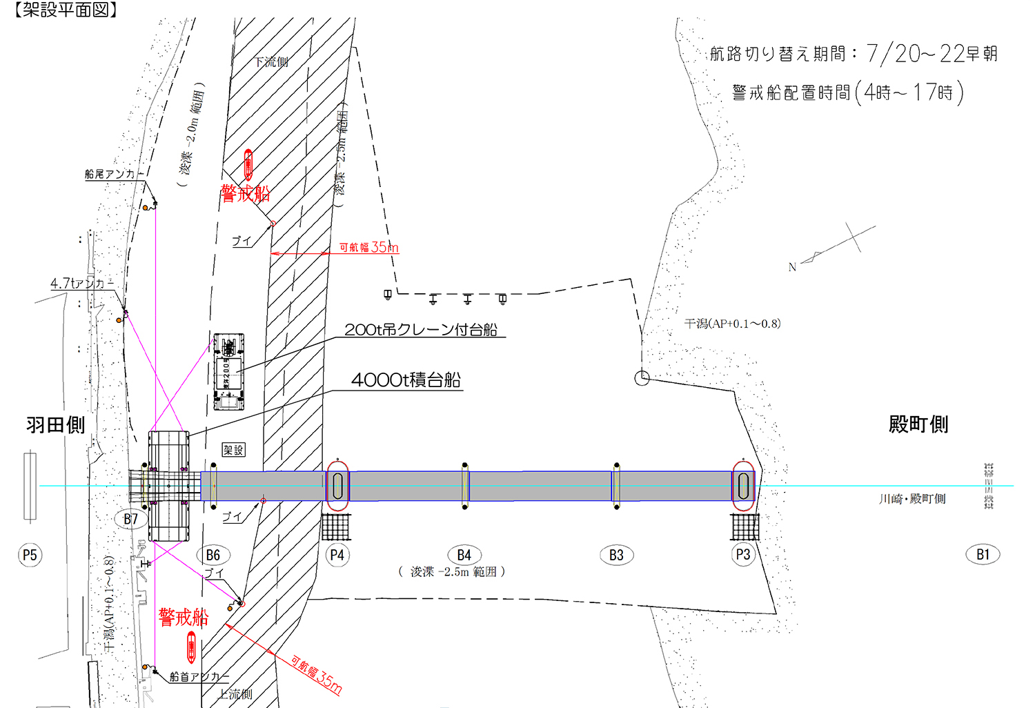 現場は、漁船や小型遊覧船などが行き交う水域であり、さらには上流に架替え中の高速大師橋(首都高速道路)などがあり資材や土砂の運搬を行う船も通る。その航跡波による架設への影響も無視できないことから、予め航行制限をかけて施工に望んだ。また、架設時の潮流は下げ潮に該当するが、その流速は上流から下流にかけておよそ2knot超に達する。潮流を考慮して、最も下げ潮の影響の少ない満潮時(川の流れと潮の流れが影響し、潮止まりが発生する)に架設地へ進入するようスケジュールを組んだ。