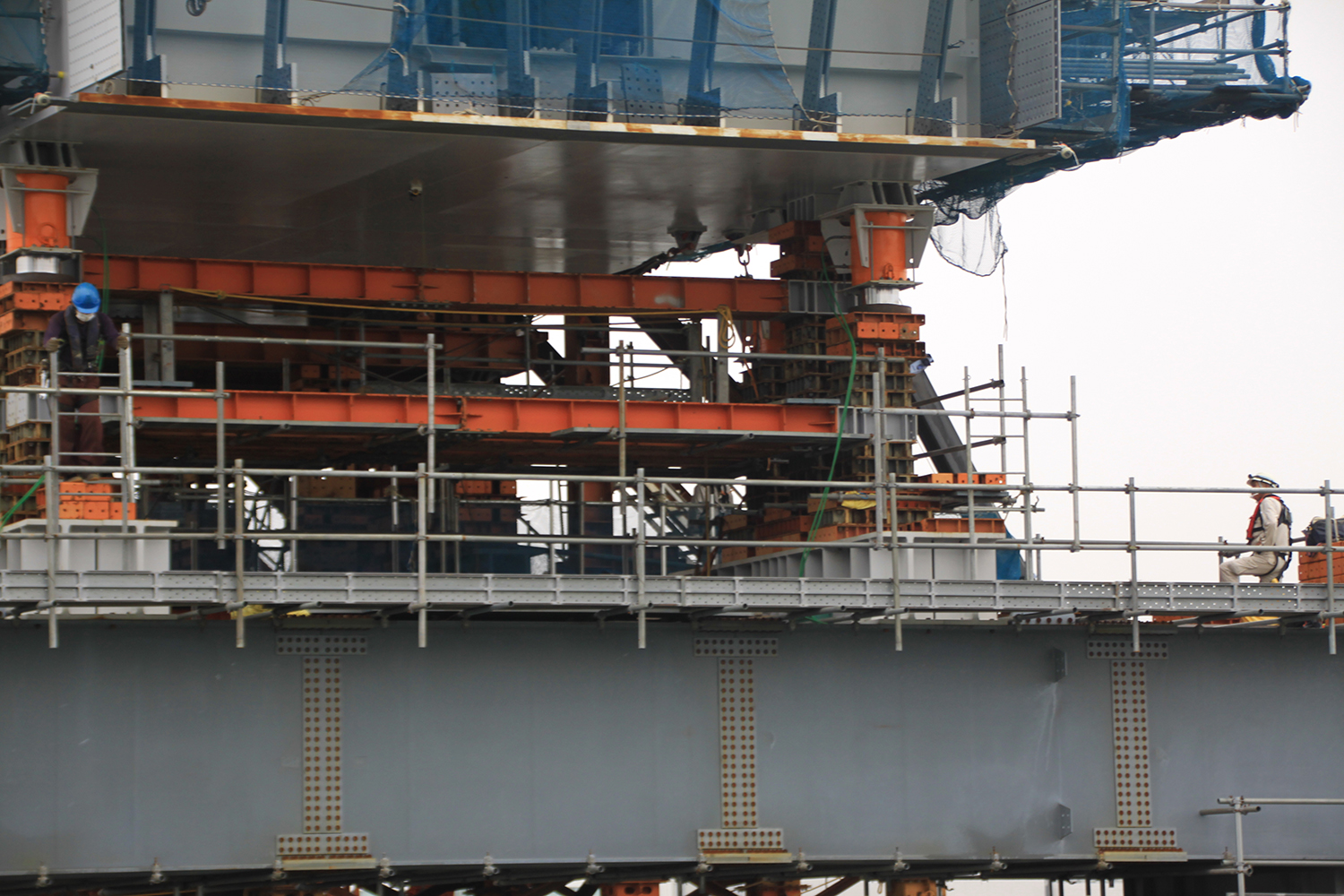 現場においても、板厚が厚く、応力も大きくなるので、ボルト接合ができない箇所(柱頭部付近など)は溶接とした。大ブロック同士および張出し架設部のジョイントのみボルト接合・溶接を併用している。