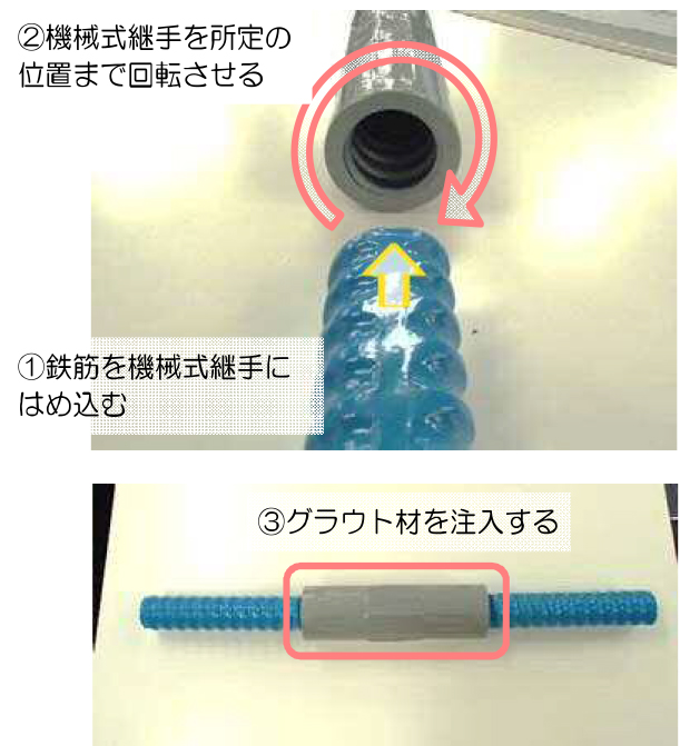 箱桁内の鉄筋と橋脚から伸びる鉄筋の定着は、上部工の側から桁の底板の挿入孔に(上面から)挿し込み、下から伸びる鉄筋とネジ式の機械継手(右図)を使って定着させた。その後に鋼床版部を架設して、桁の柱頭部を覆うような形で型枠を組み桁上からコンクリートを充填していった。打設高さは柱頭部下端から鋼桁の巻き立てまで4mであり、2回に分けて打設した。